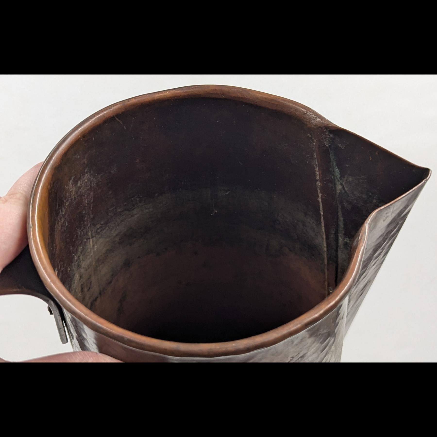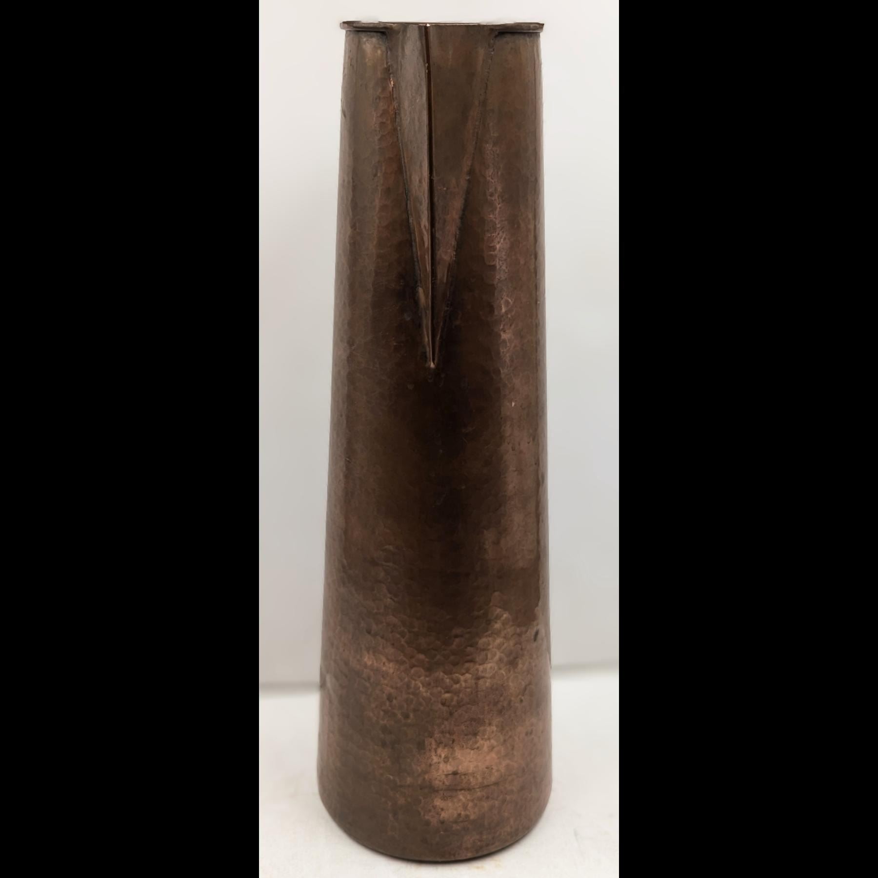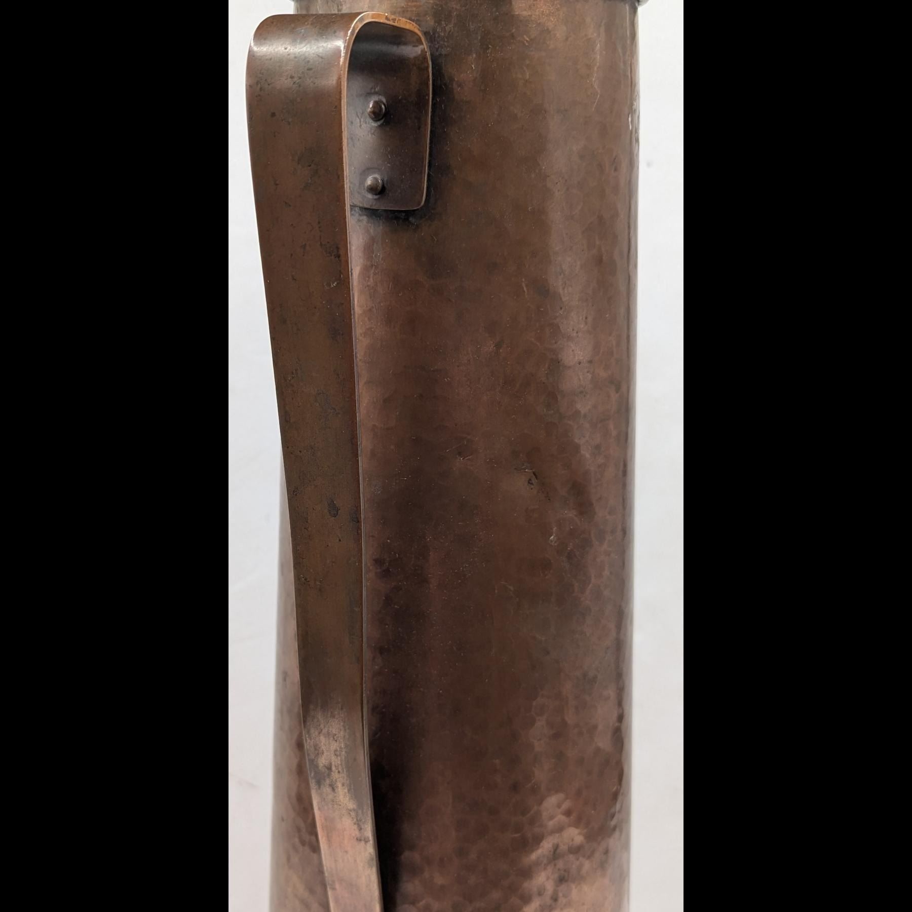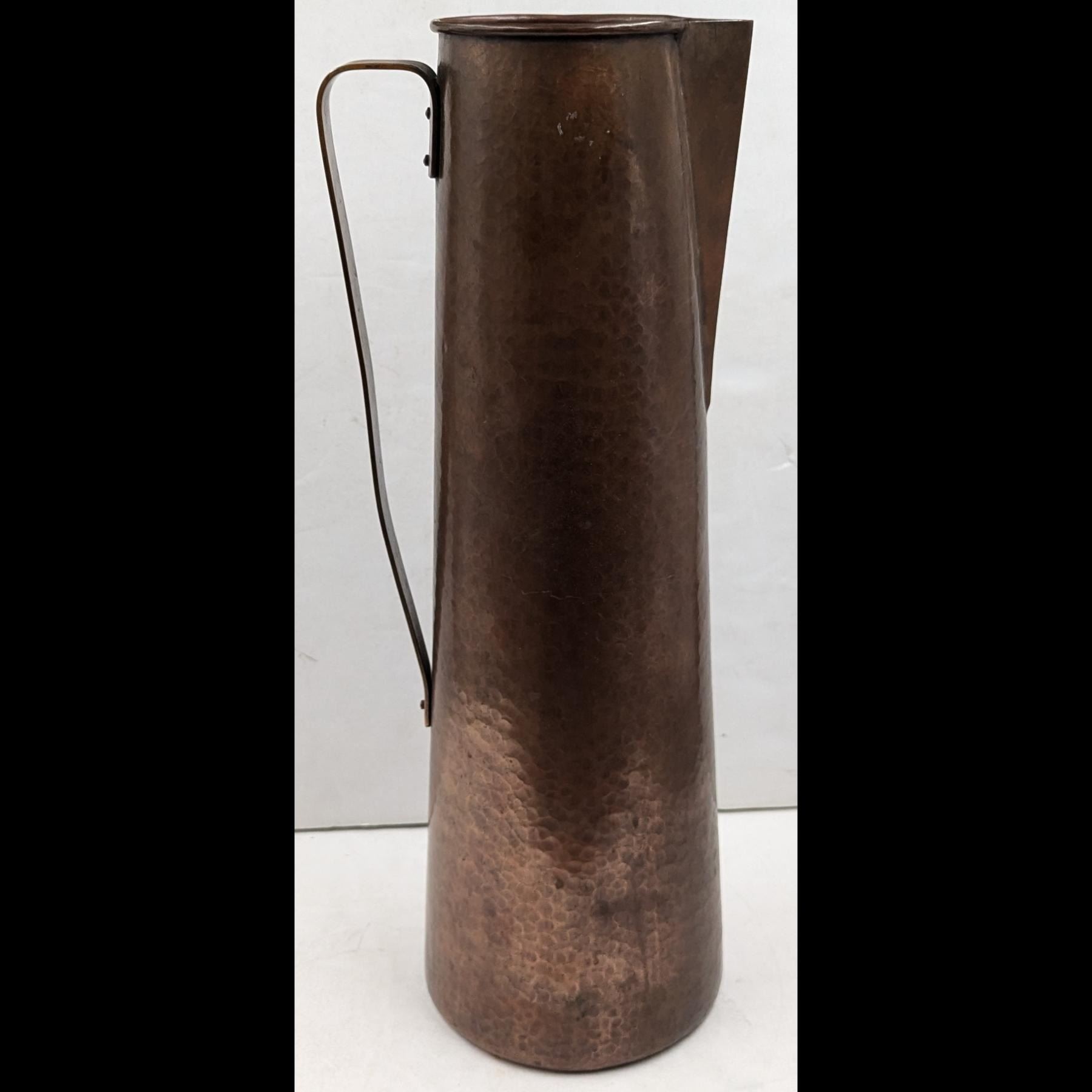 A Large Antique German Hand Hammered Unusual Zinn Copper Pitcher, Circa 1880. Measures approx. 21 1/2" tall, the handle measures approx. 14" long. There are two small dents.