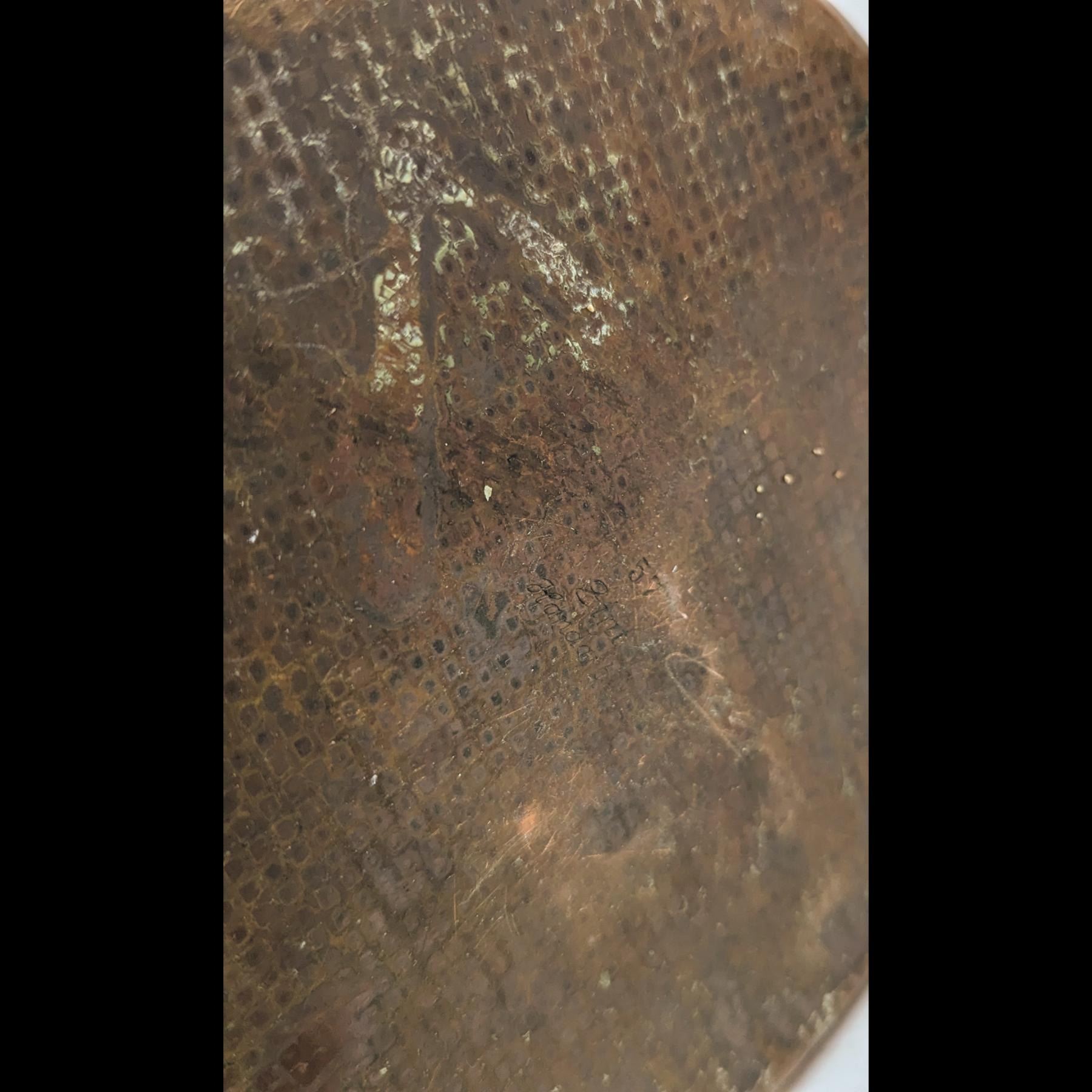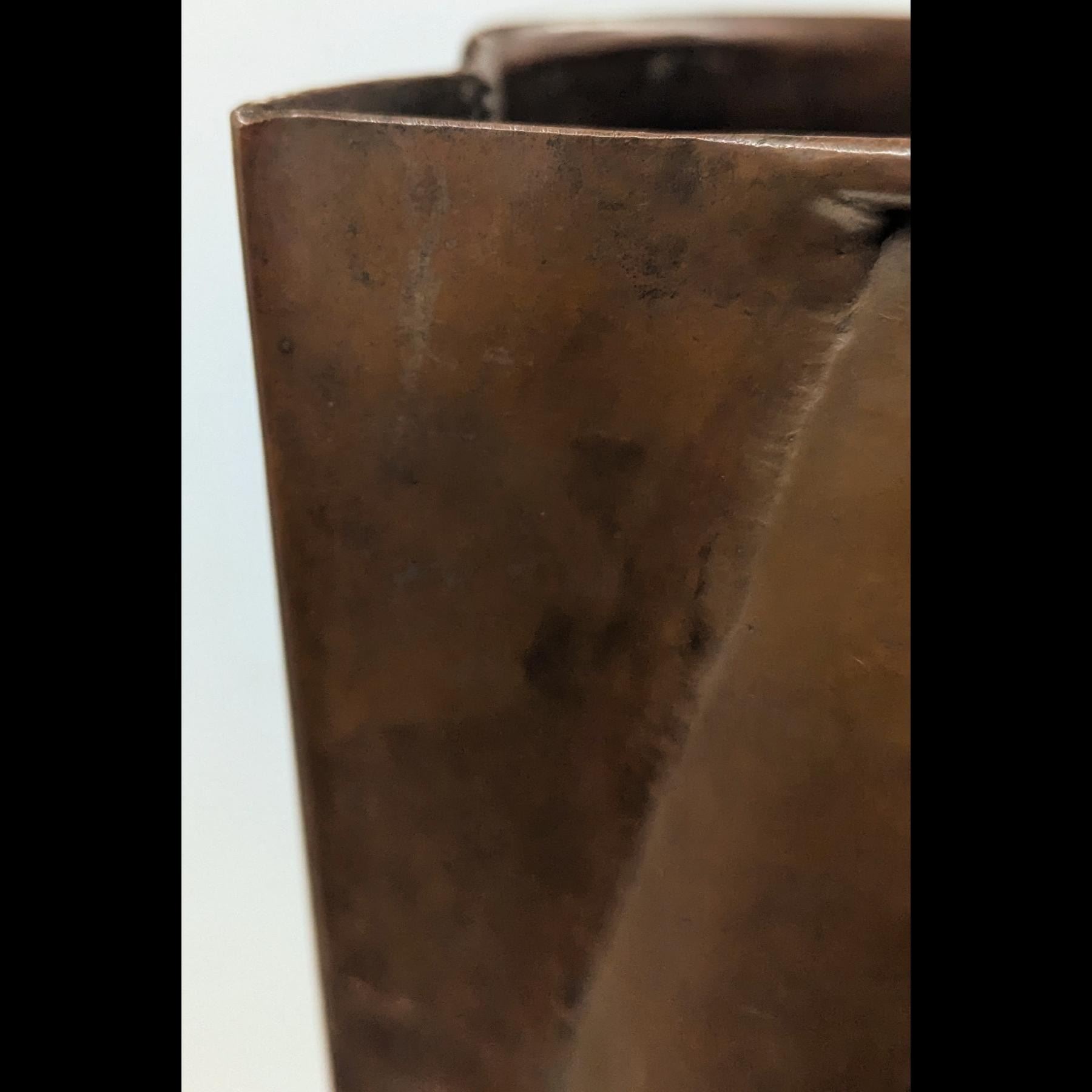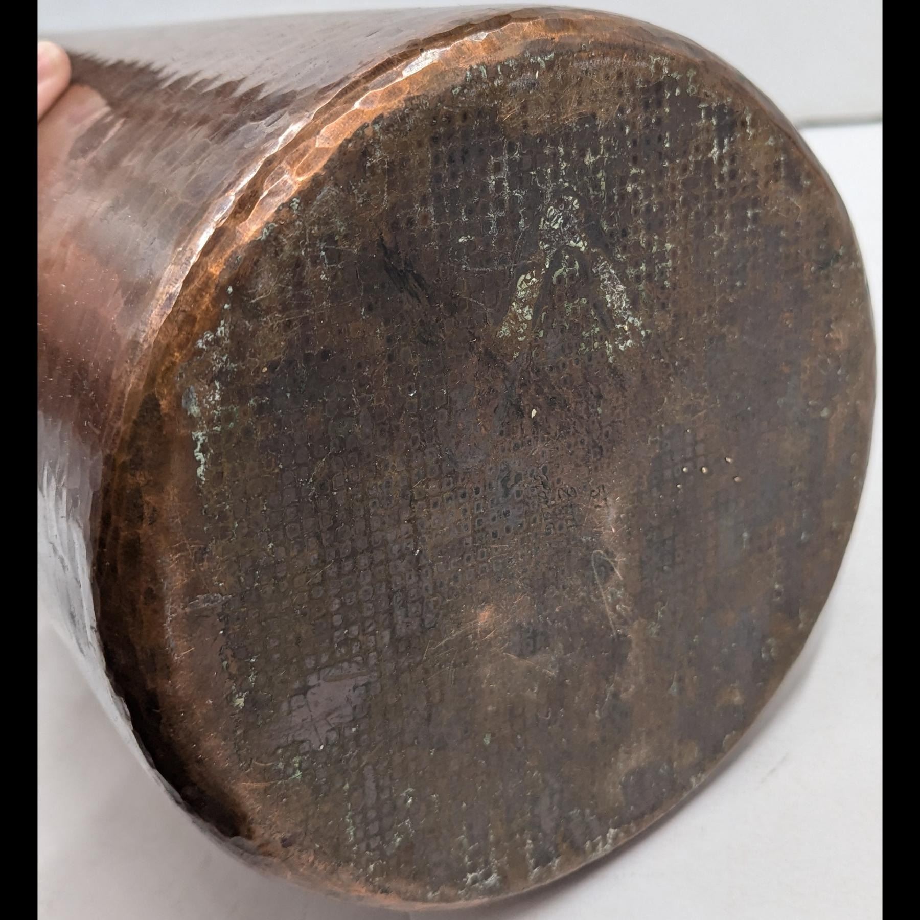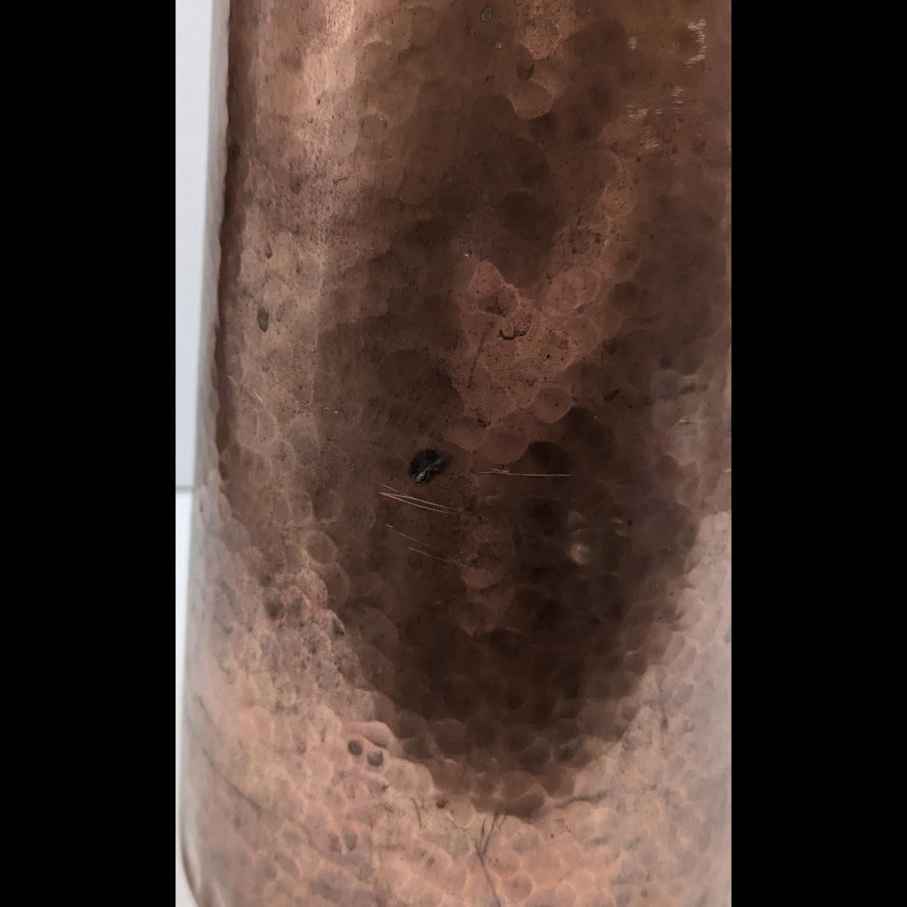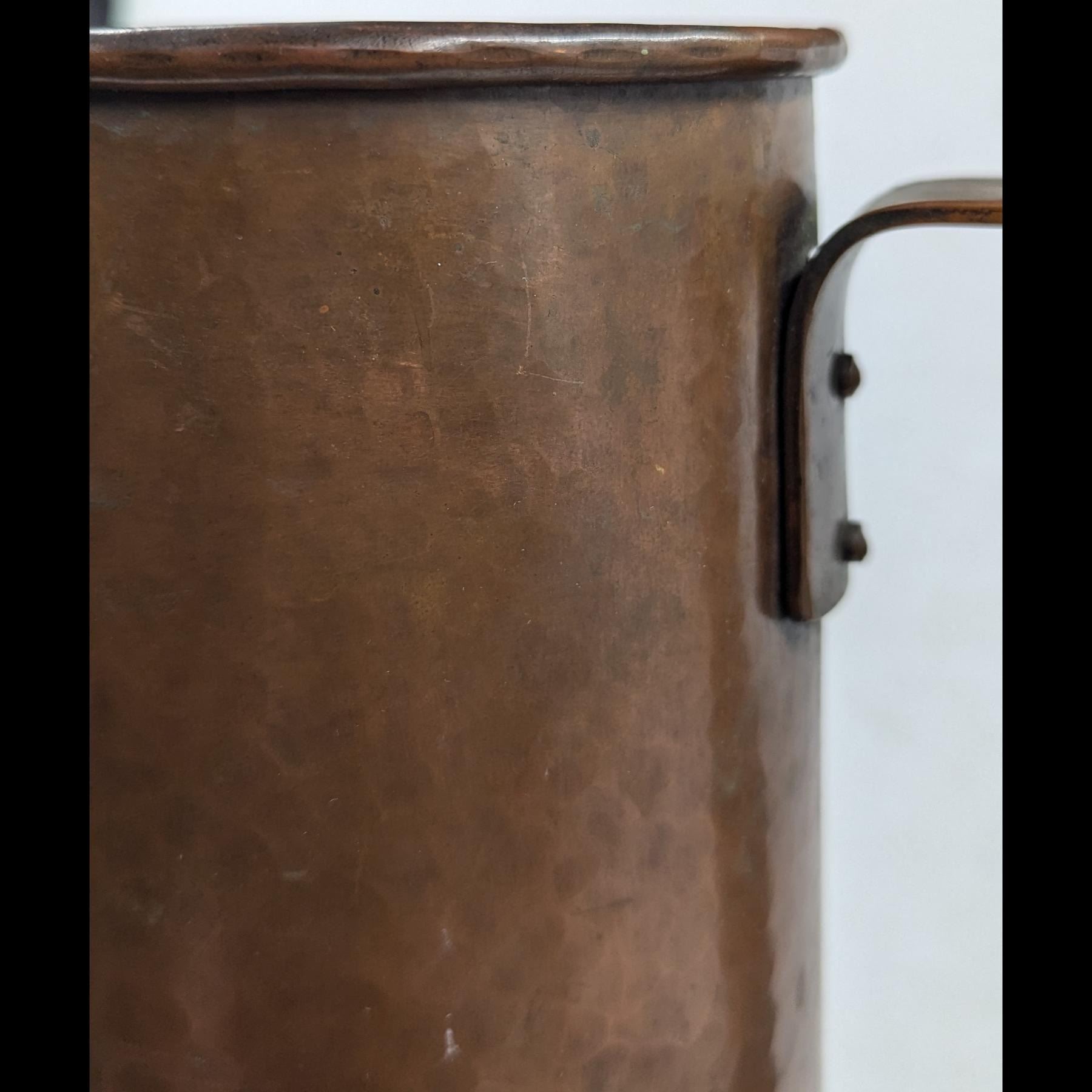 A Large Antique German Hand Hammered Unusual Zinn Copper Pitcher, Circa 1880. Measures approx. 21 1/2" tall, the handle measures approx. 14" long. There are two small dents.