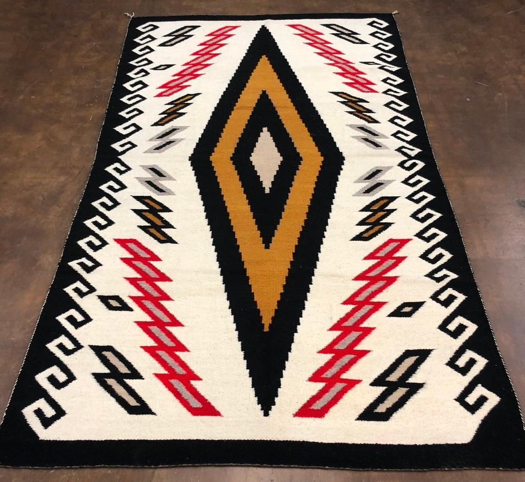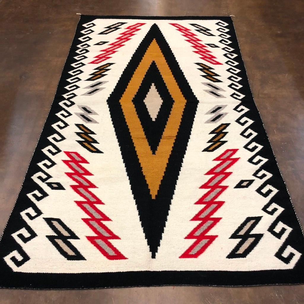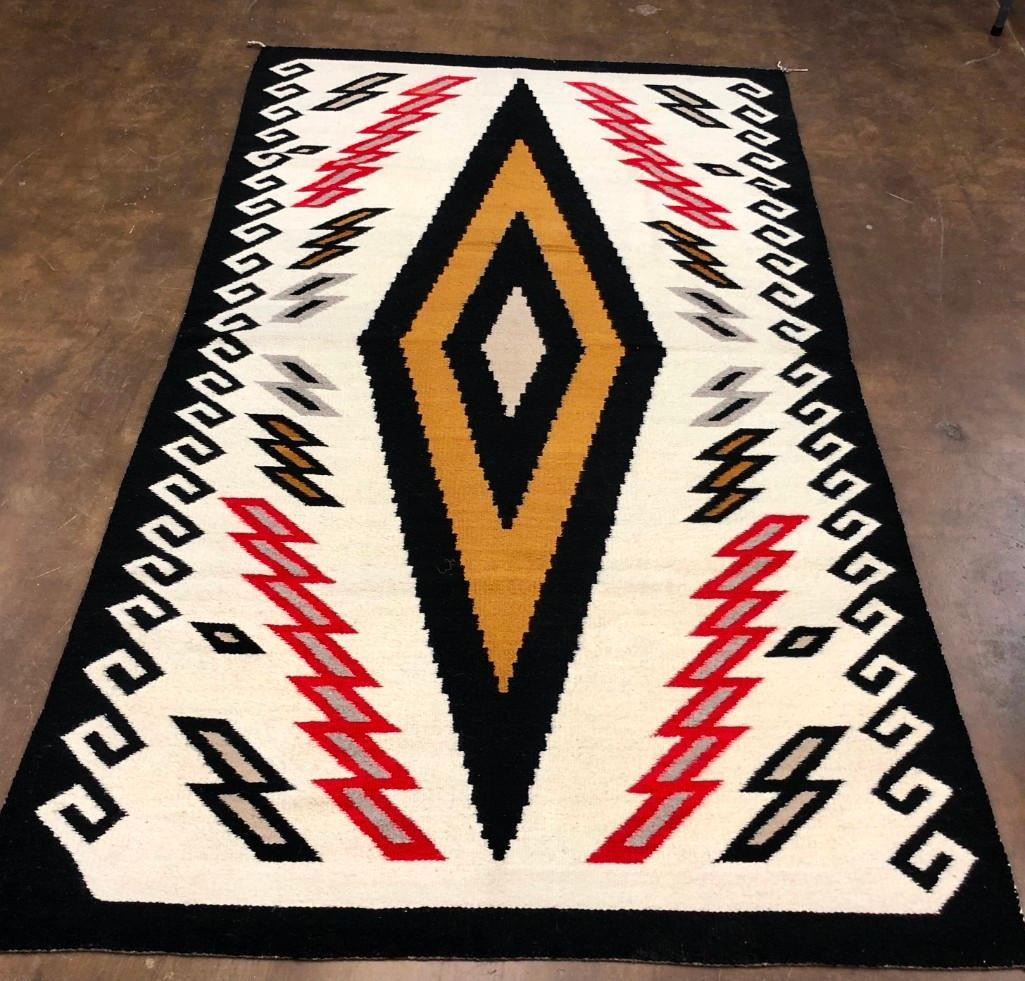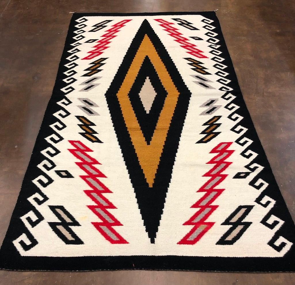 This is a big and beautiful Navajo textile (rug) that has a large diamond pattern in the center with lighting bolt and water (wave) patterns around the edges. It has a nice look to it! The wool was hand spun and dyed and it is a collectible vintage textile. MAKER: Unfortunately the identity of the Navajo weaver has been lost to time. APPROX. AGE: Circa 1940s. SIZE: Measures approx. 58-1/2 inches wide X 102-1/2 inches long. CONDITION: Good for its age, normal wear expected. Please look closely at the pictures as they are an important part of our description and are hereby incorporated into the description, specifically with regards to condition. SHIPPING: There will be a $8 handling / packaging fee for shipping this lot. The actual cost of postage will be added on top of that. BUY IT NOW: If you would like to buy this item now, without waiting for the auction day to bid on it, we do offer this option (which is available up to 48 hours before the actual auction starts). The “Buy it Now†price is the high estimate of this lot (plus applicable fees and the Buyer's premium is discounted to 10% when using the Buy it Now option). If you would like to exercise this option, you must contact us by email (or phone as long as you talk to someone live). Reference this lot number and your intention to "Buy it Now."