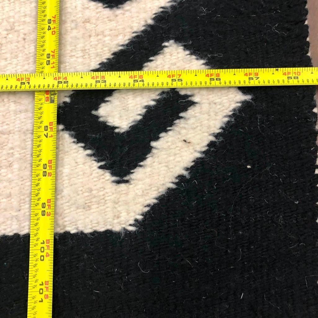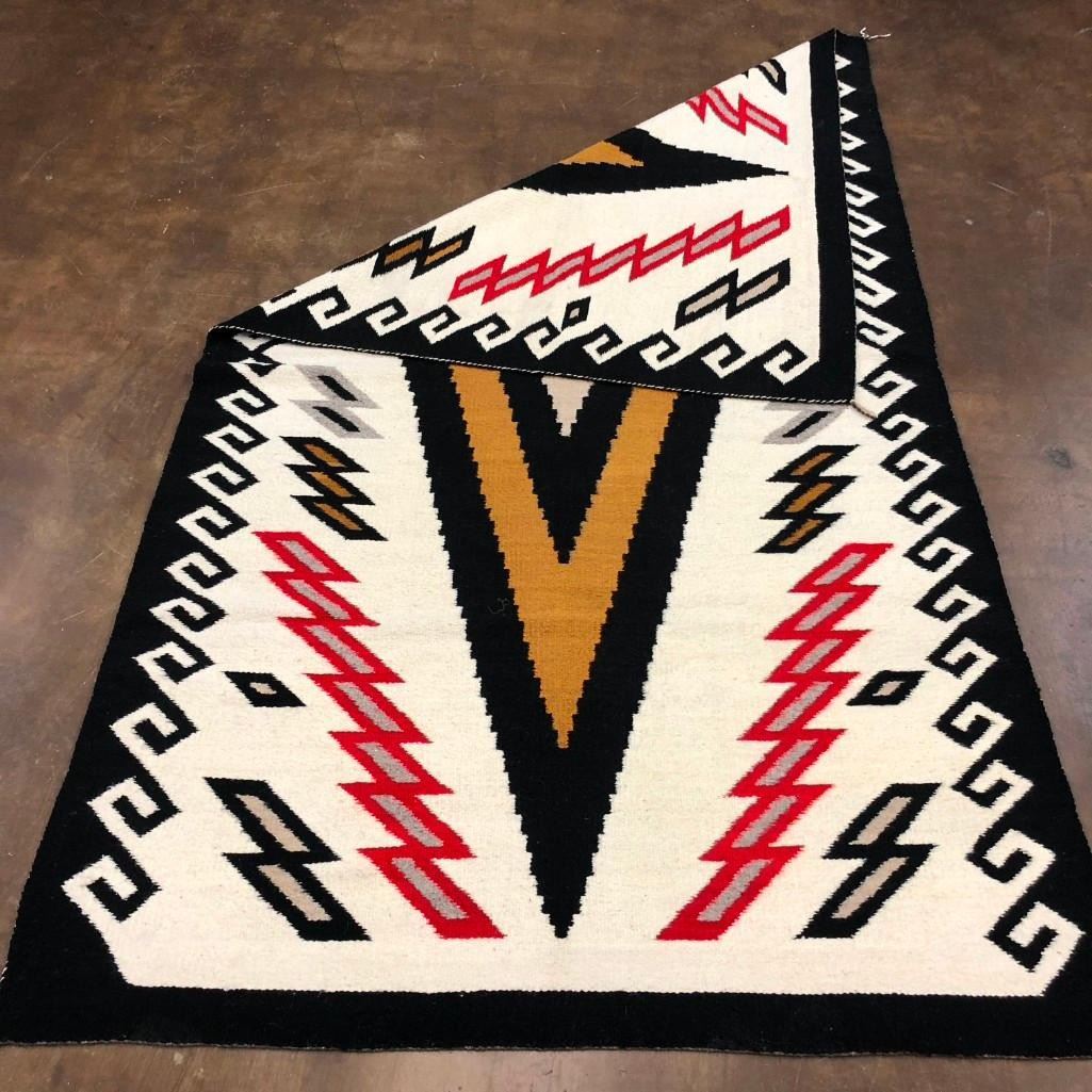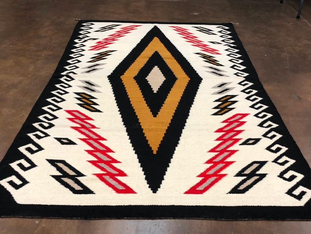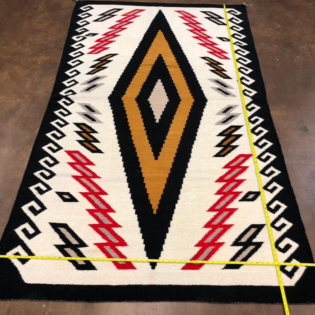 This is a big and beautiful Navajo textile (rug) that has a large diamond pattern in the center with lighting bolt and water (wave) patterns around the edges. It has a nice look to it! The wool was hand spun and dyed and it is a collectible vintage textile. MAKER: Unfortunately the identity of the Navajo weaver has been lost to time. APPROX. AGE: Circa 1940s. SIZE: Measures approx. 58-1/2 inches wide X 102-1/2 inches long. CONDITION: Good for its age, normal wear expected. Please look closely at the pictures as they are an important part of our description and are hereby incorporated into the description, specifically with regards to condition. SHIPPING: There will be a $8 handling / packaging fee for shipping this lot. The actual cost of postage will be added on top of that. BUY IT NOW: If you would like to buy this item now, without waiting for the auction day to bid on it, we do offer this option (which is available up to 48 hours before the actual auction starts). The “Buy it Now†price is the high estimate of this lot (plus applicable fees and the Buyer's premium is discounted to 10% when using the Buy it Now option). If you would like to exercise this option, you must contact us by email (or phone as long as you talk to someone live). Reference this lot number and your intention to "Buy it Now."