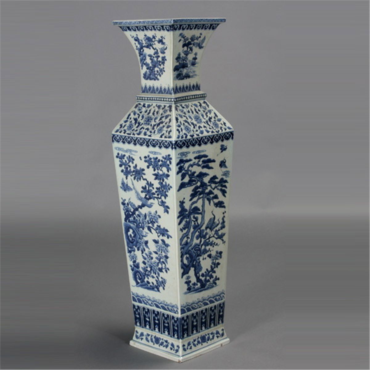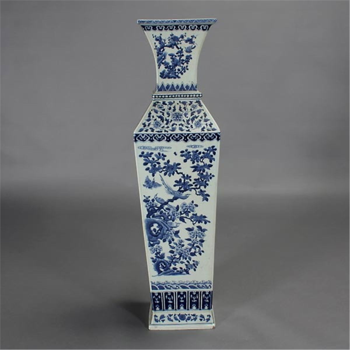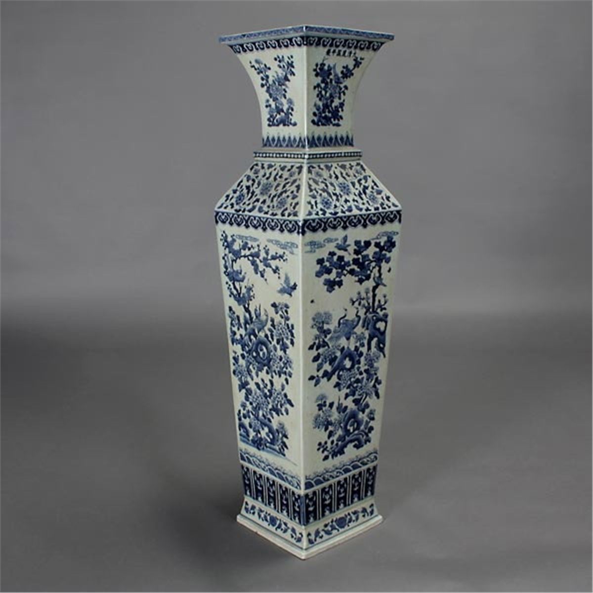 A Large Blue and White Porcelain Square Form Vase, Of tapered form rising to a flaring rim, each side panel painted with various birds upon rockwork amidst pine and prunus trees with blooming peonies below, the neck decorated en suite, all between several ruyi head and lappet bands, a horizontal six-character mark painted in blue just below the rim. Republic Period, Height: 37 3/4 inches (95.8 cm)