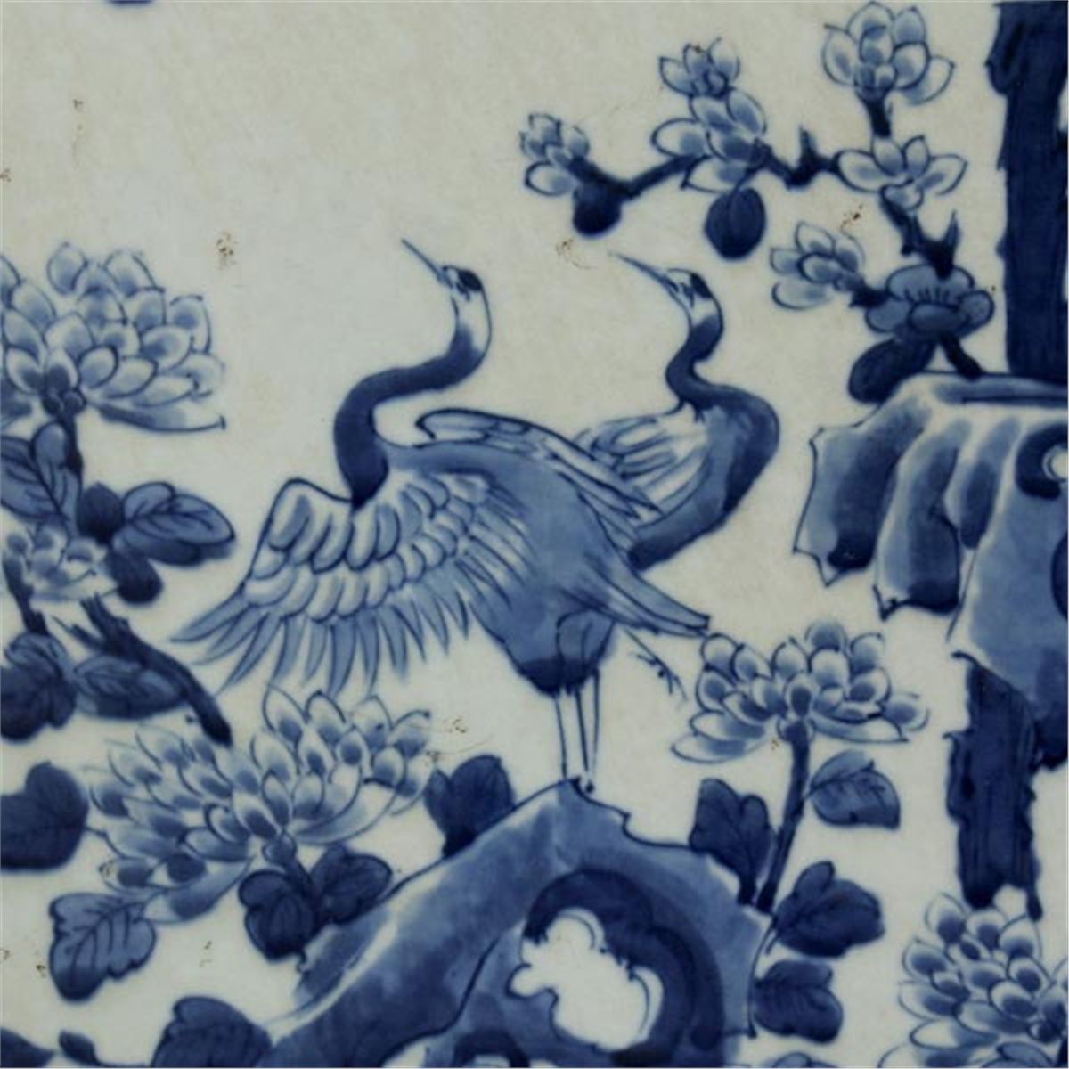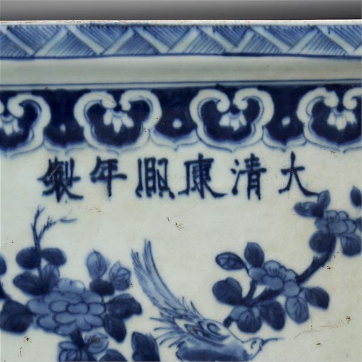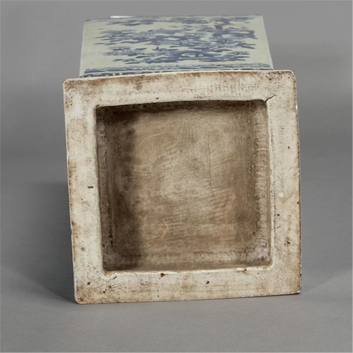 A Large Blue and White Porcelain Square Form Vase, Of tapered form rising to a flaring rim, each side panel painted with various birds upon rockwork amidst pine and prunus trees with blooming peonies below, the neck decorated en suite, all between several ruyi head and lappet bands, a horizontal six-character mark painted in blue just below the rim. Republic Period, Height: 37 3/4 inches (95.8 cm)