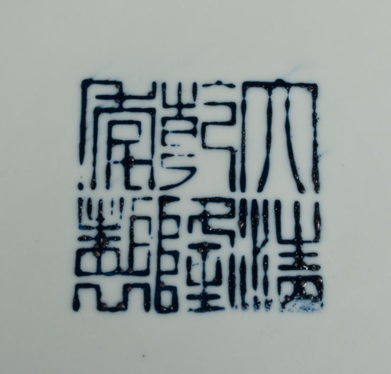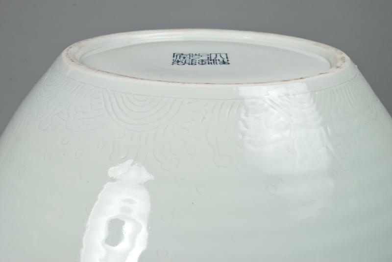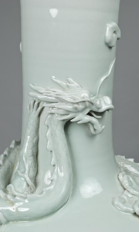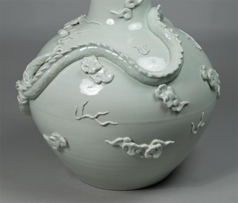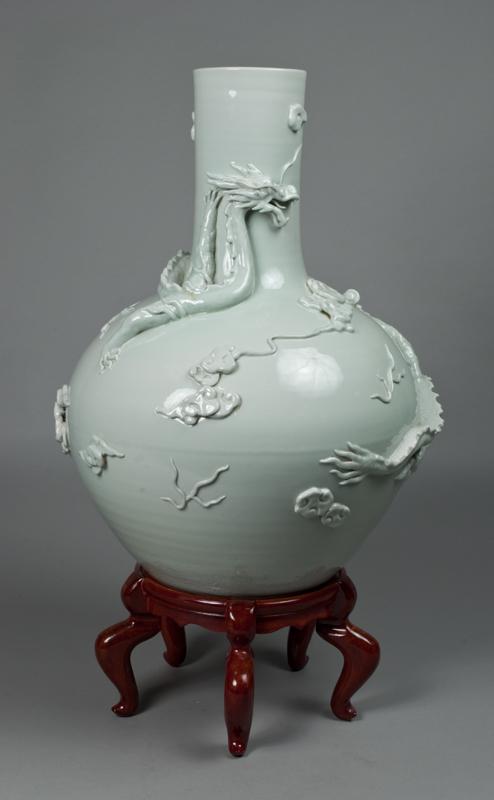 A very large vase finely molded with a single large dragon chasing a flaming pearl amongst ruyi, the foot rim molded with clouds, the base with raised enamel Qianlong seal mark in blue, 24"H x 17"W, not including the stand, a very well done vase, circa 19th - early 20th century. Private collection New York