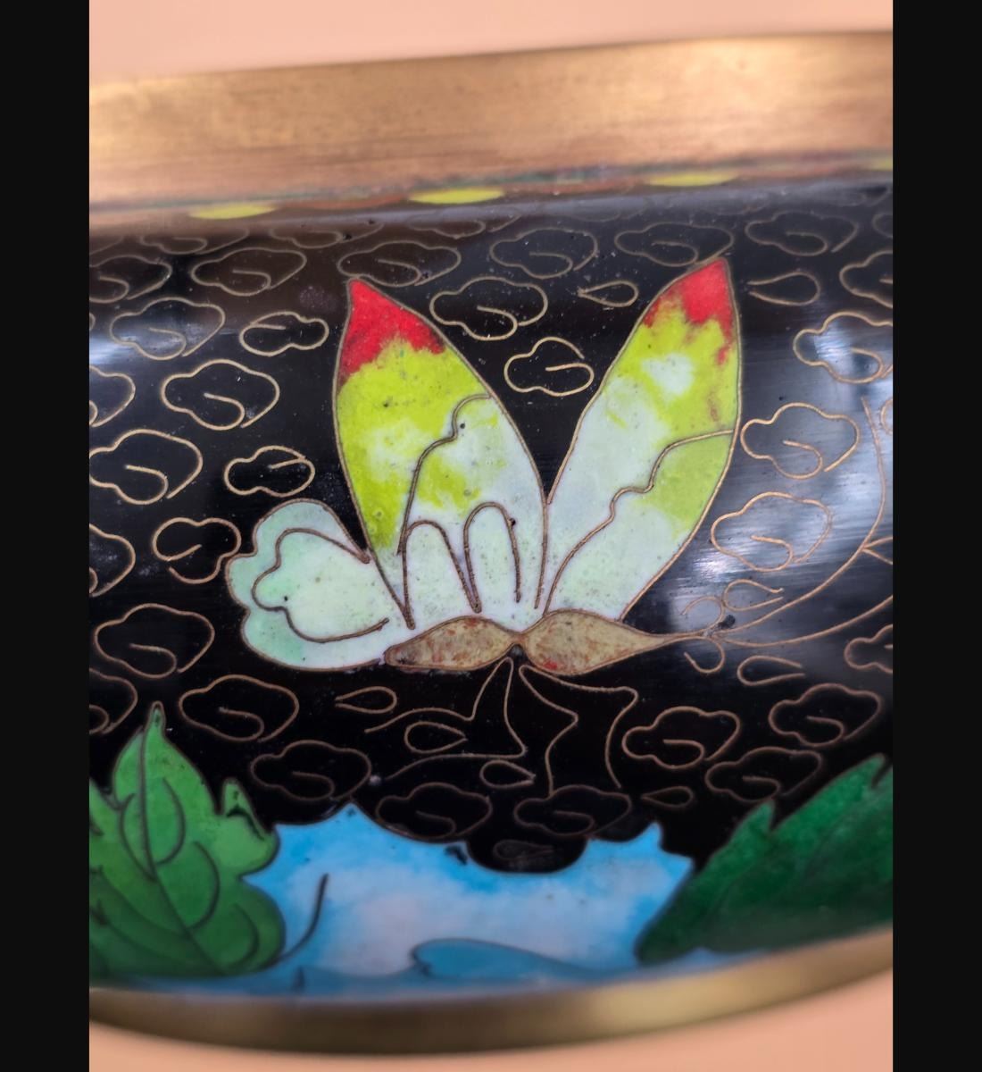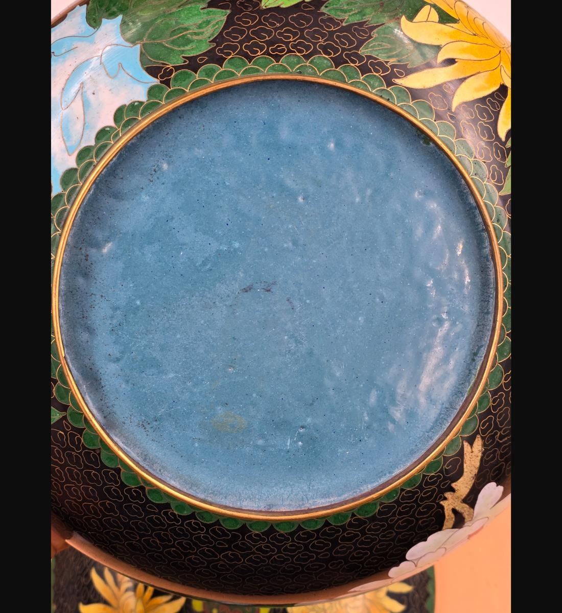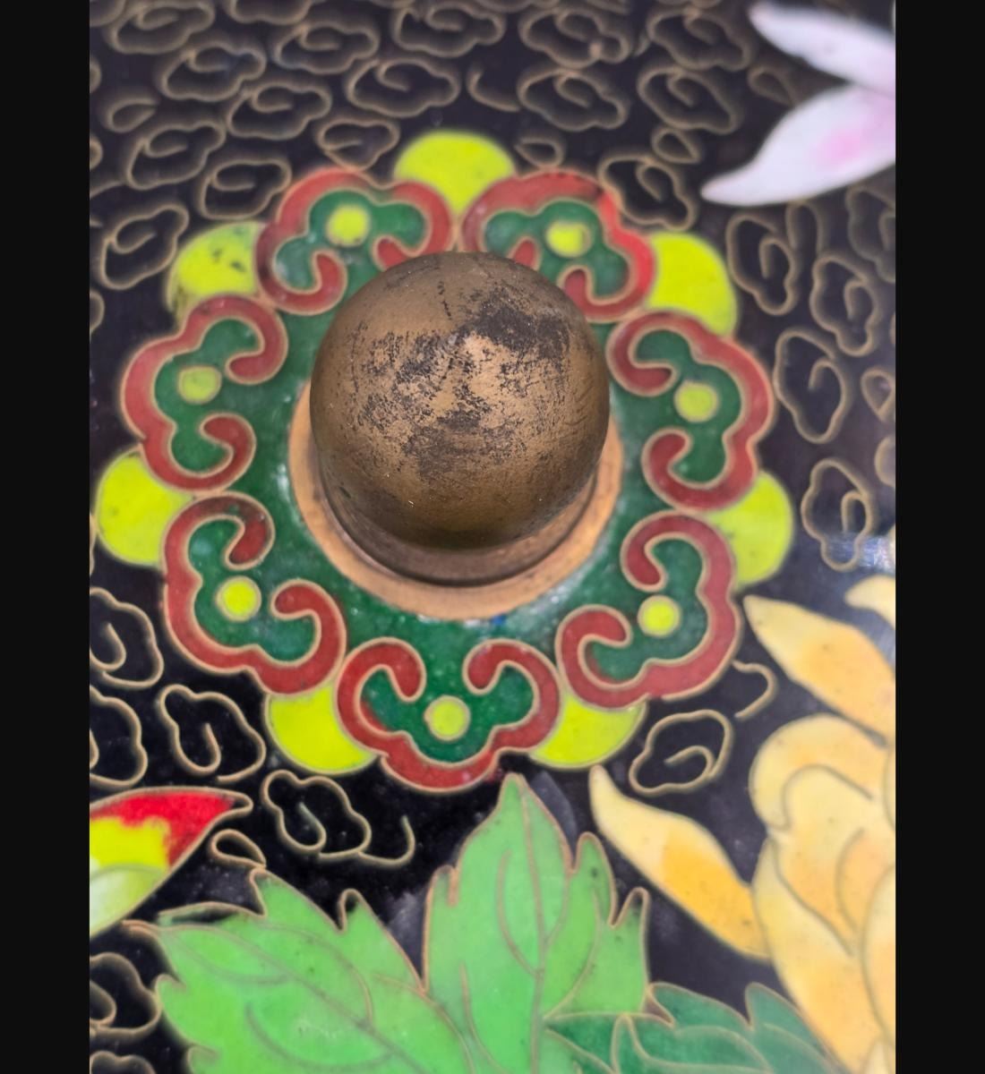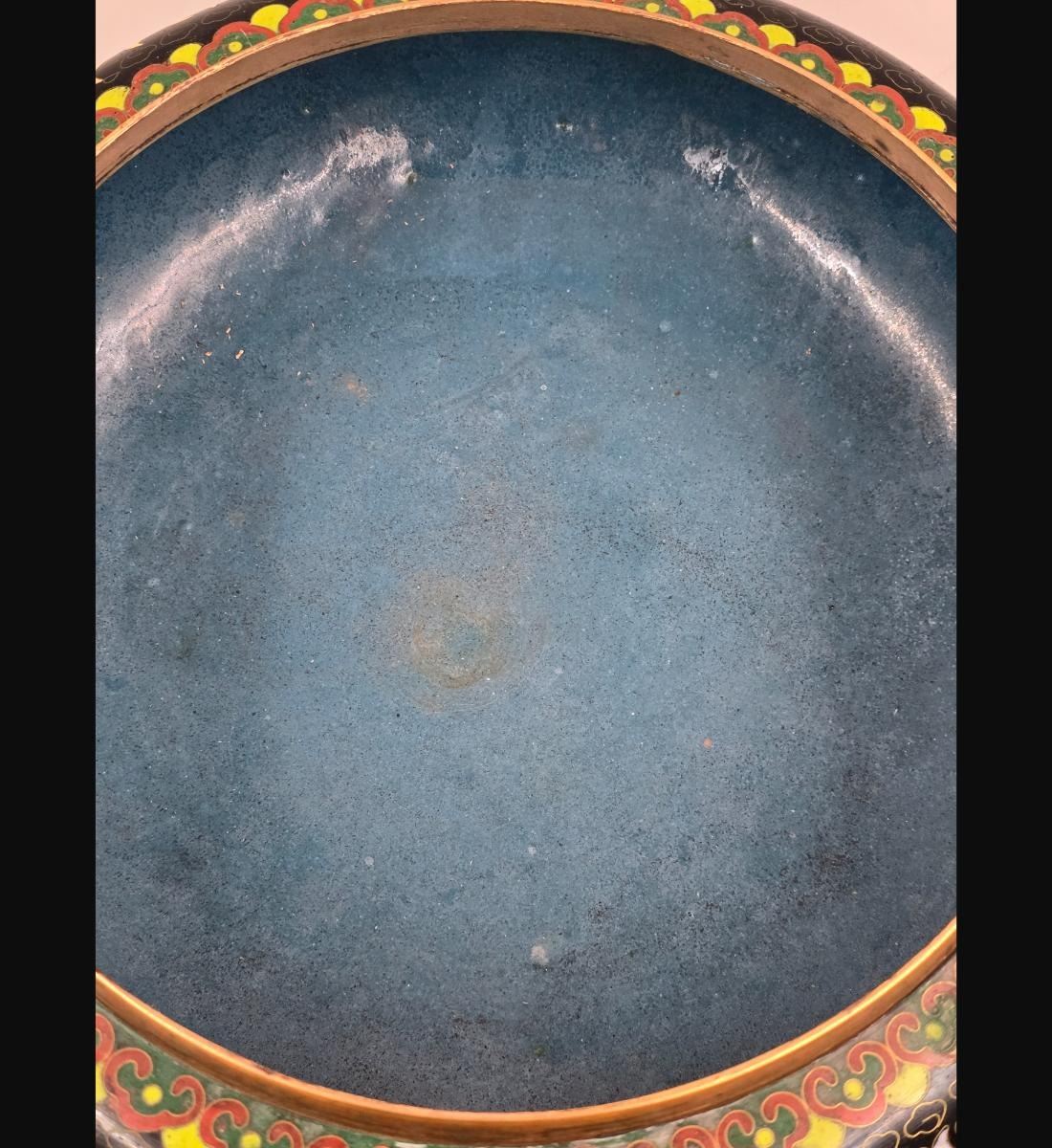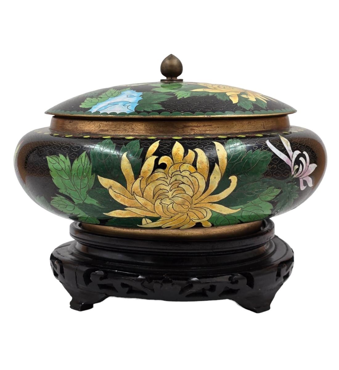 A Large Chinese Cloisonne Lidded Bowl On A Wooden Stand. Bowl Measures approx. 10.5" X 6". Provenance: One Person Private Estate Central Florida.