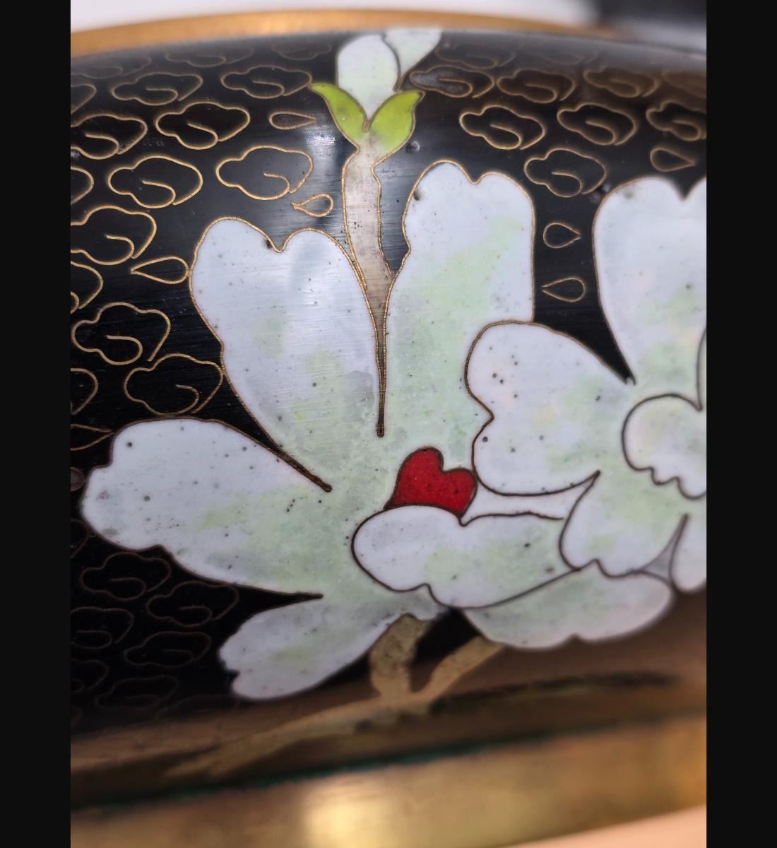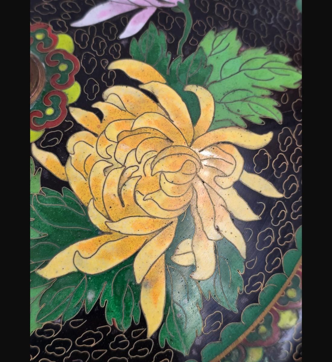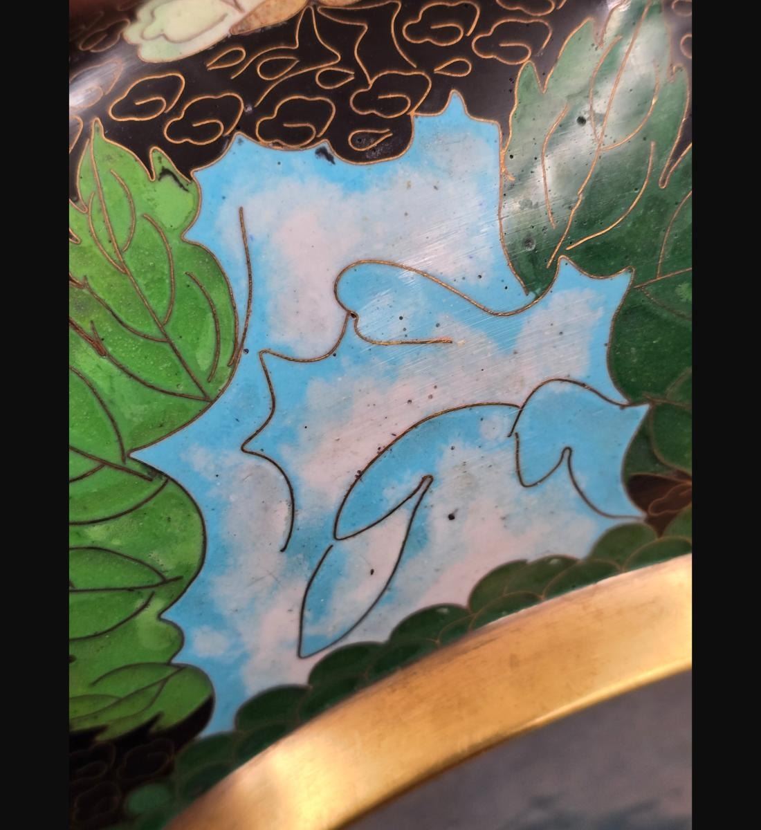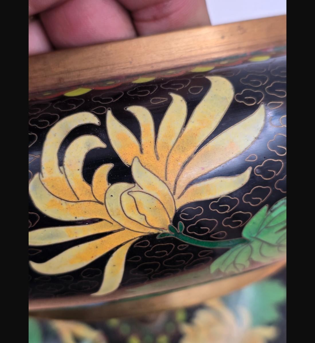 A Large Chinese Cloisonne Lidded Bowl On A Wooden Stand. Bowl Measures approx. 10.5" X 6". Provenance: One Person Private Estate Central Florida.