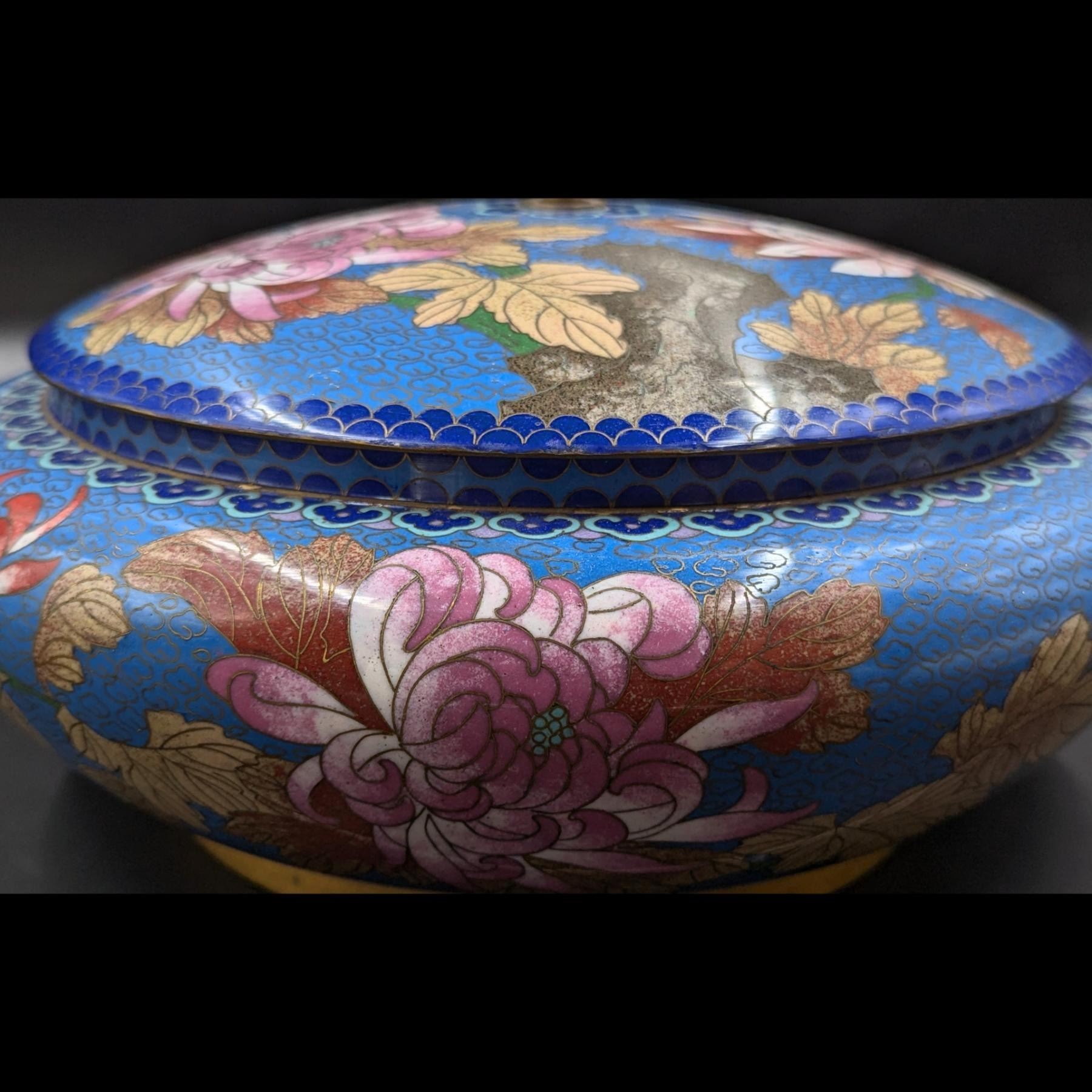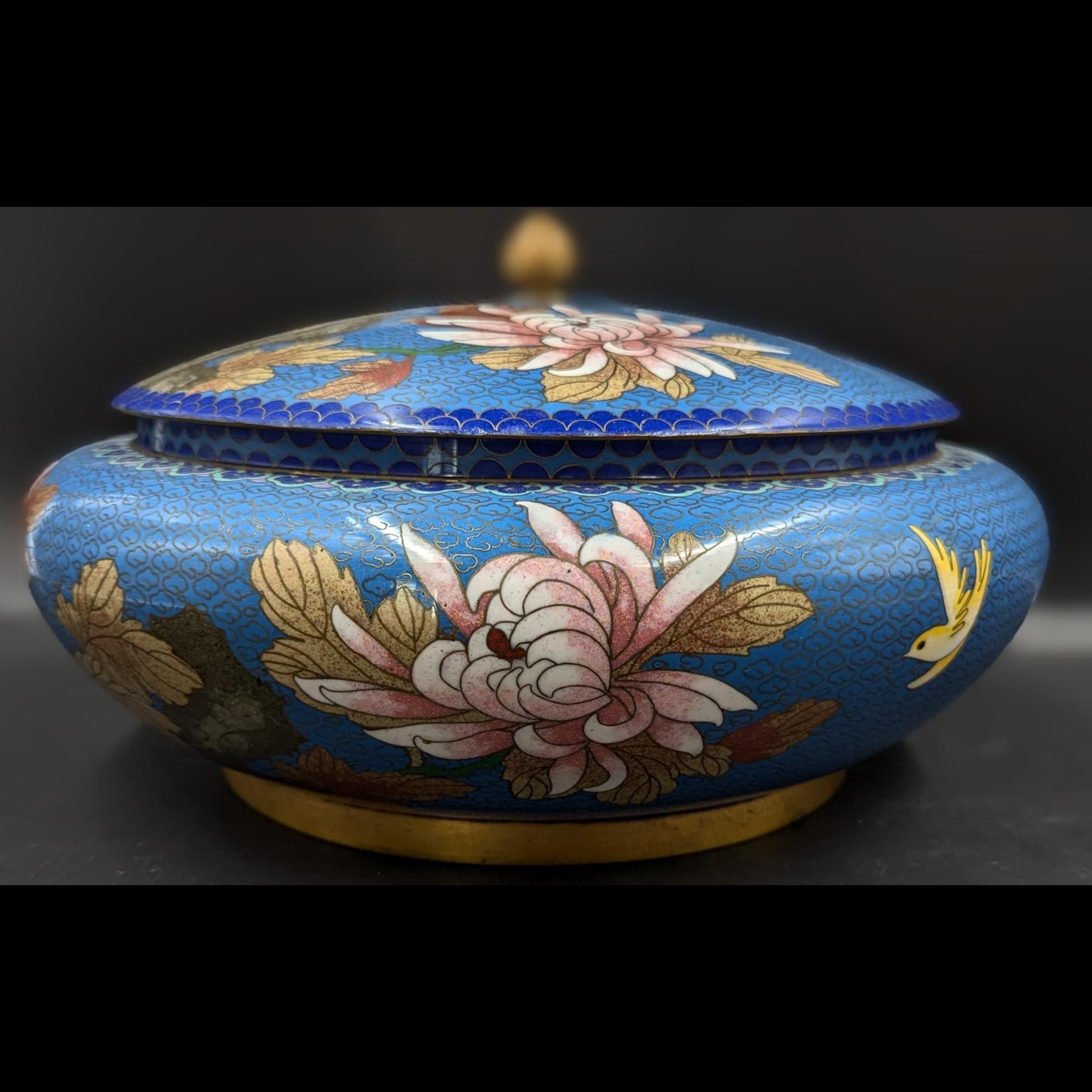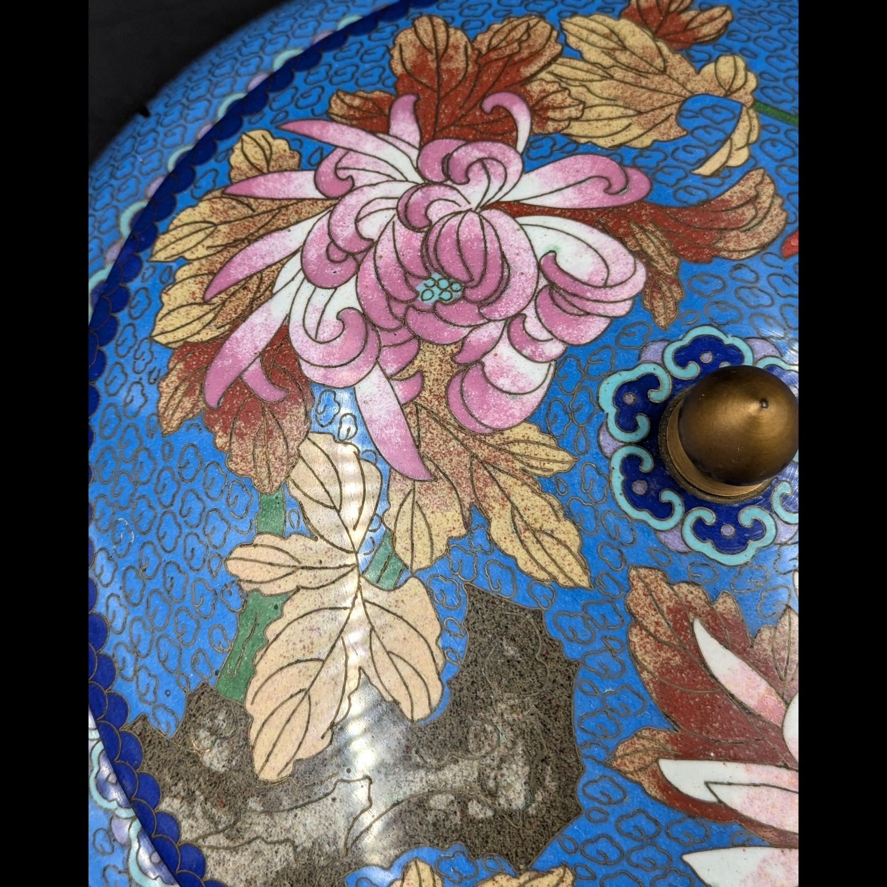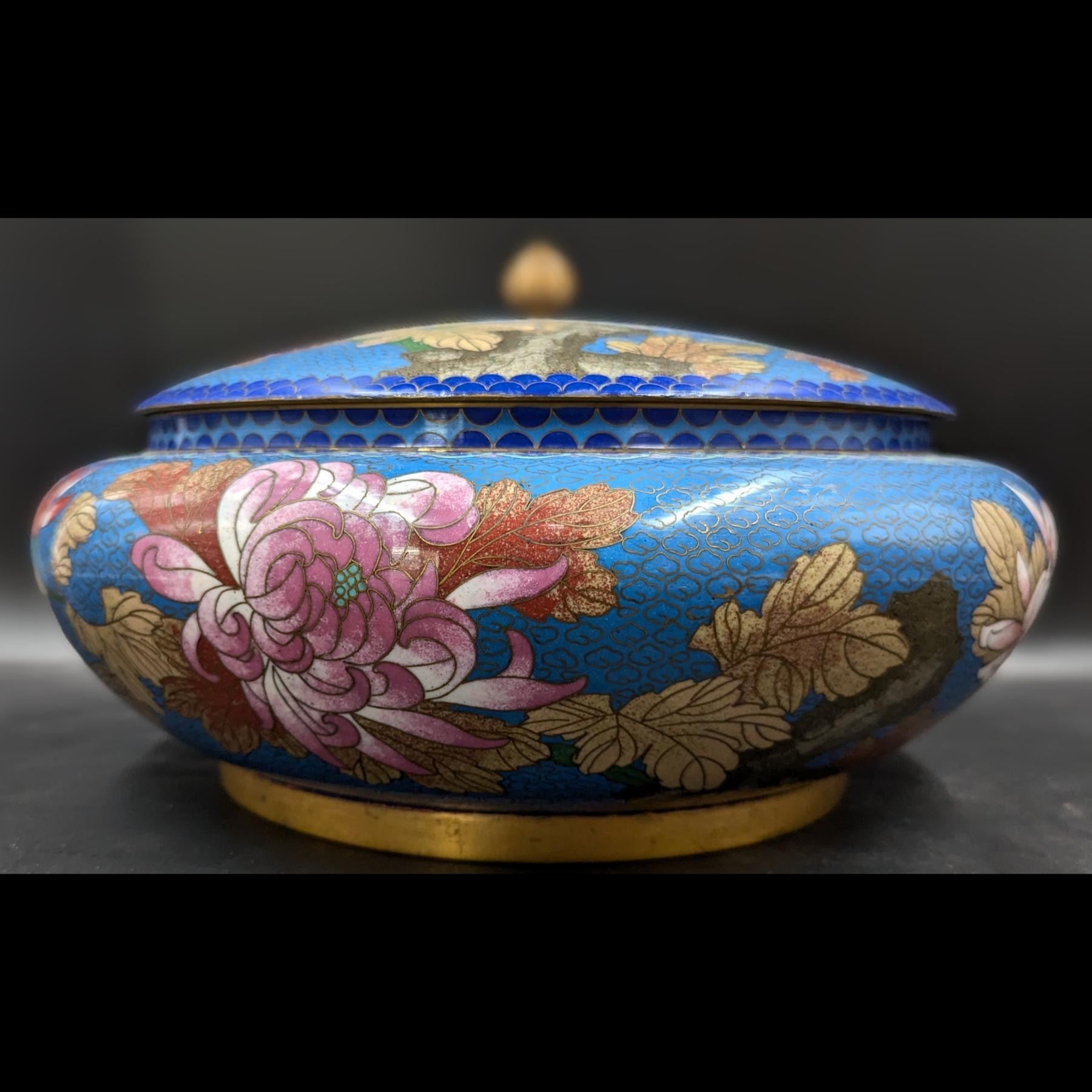 A Large Chinese Cloisonne Lidded Bowl. Measures approx. 17" X 19", Sight measures approx. 7" X 12 1/2".