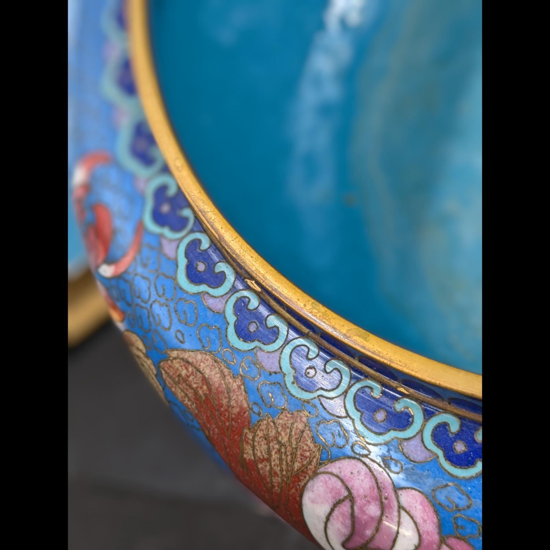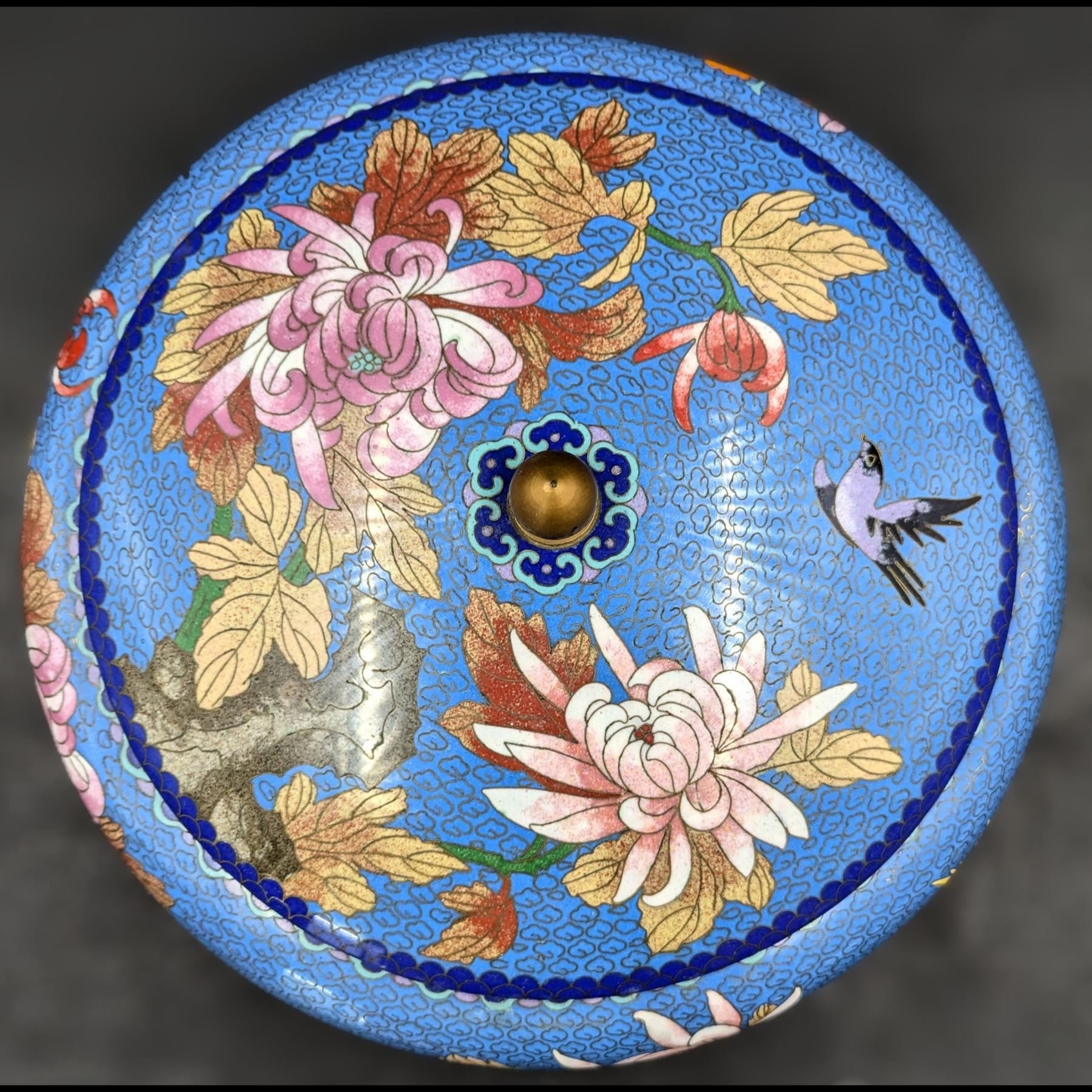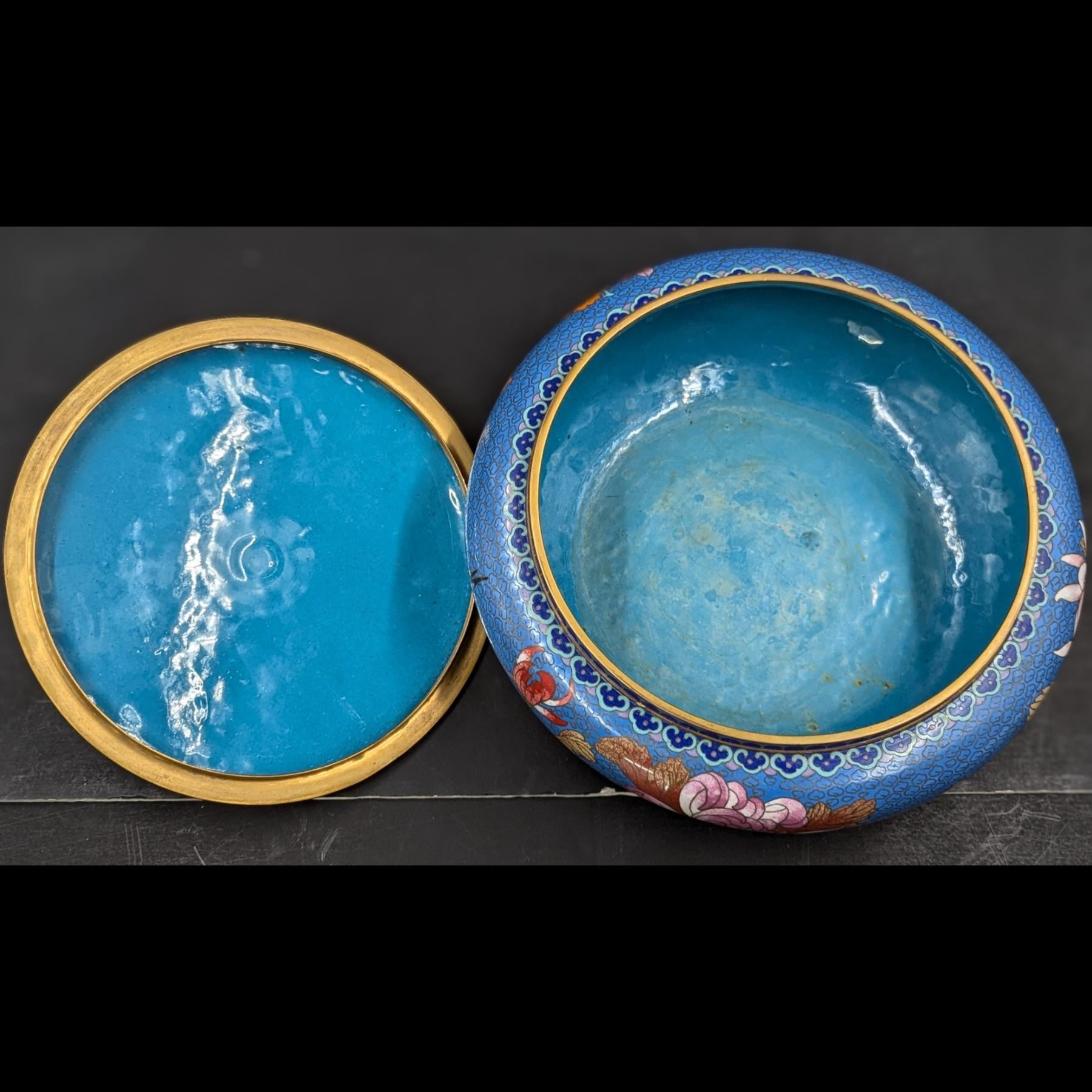 A Large Chinese Cloisonne Lidded Bowl. Measures approx. 17" X 19", Sight measures approx. 7" X 12 1/2".