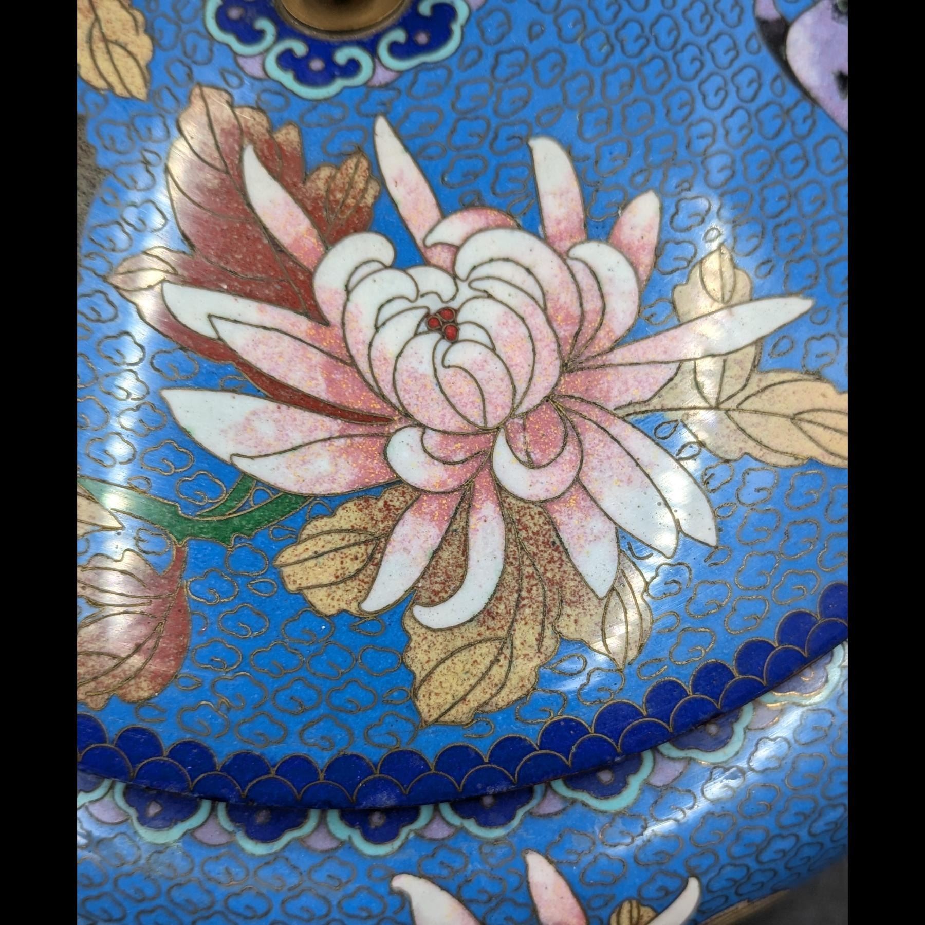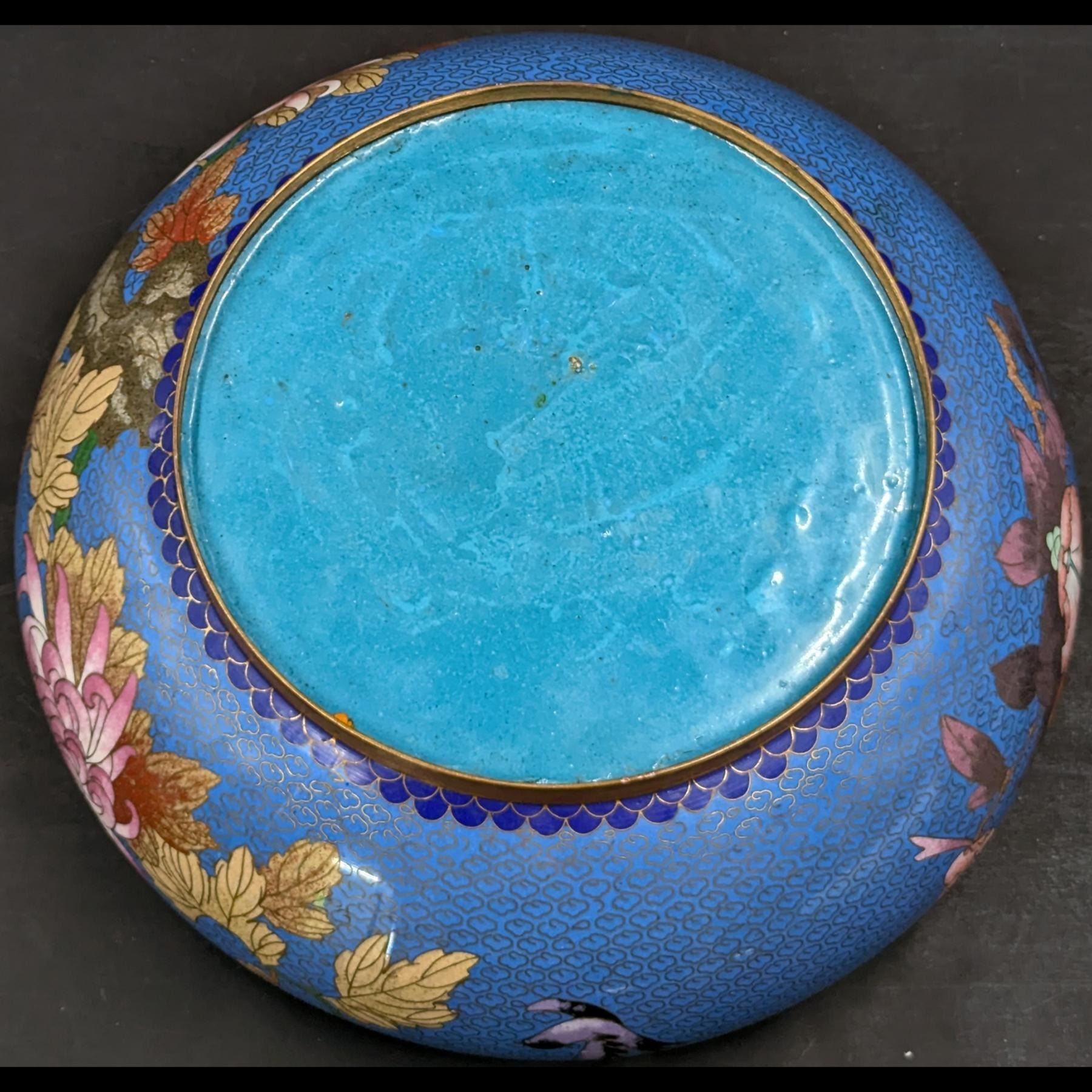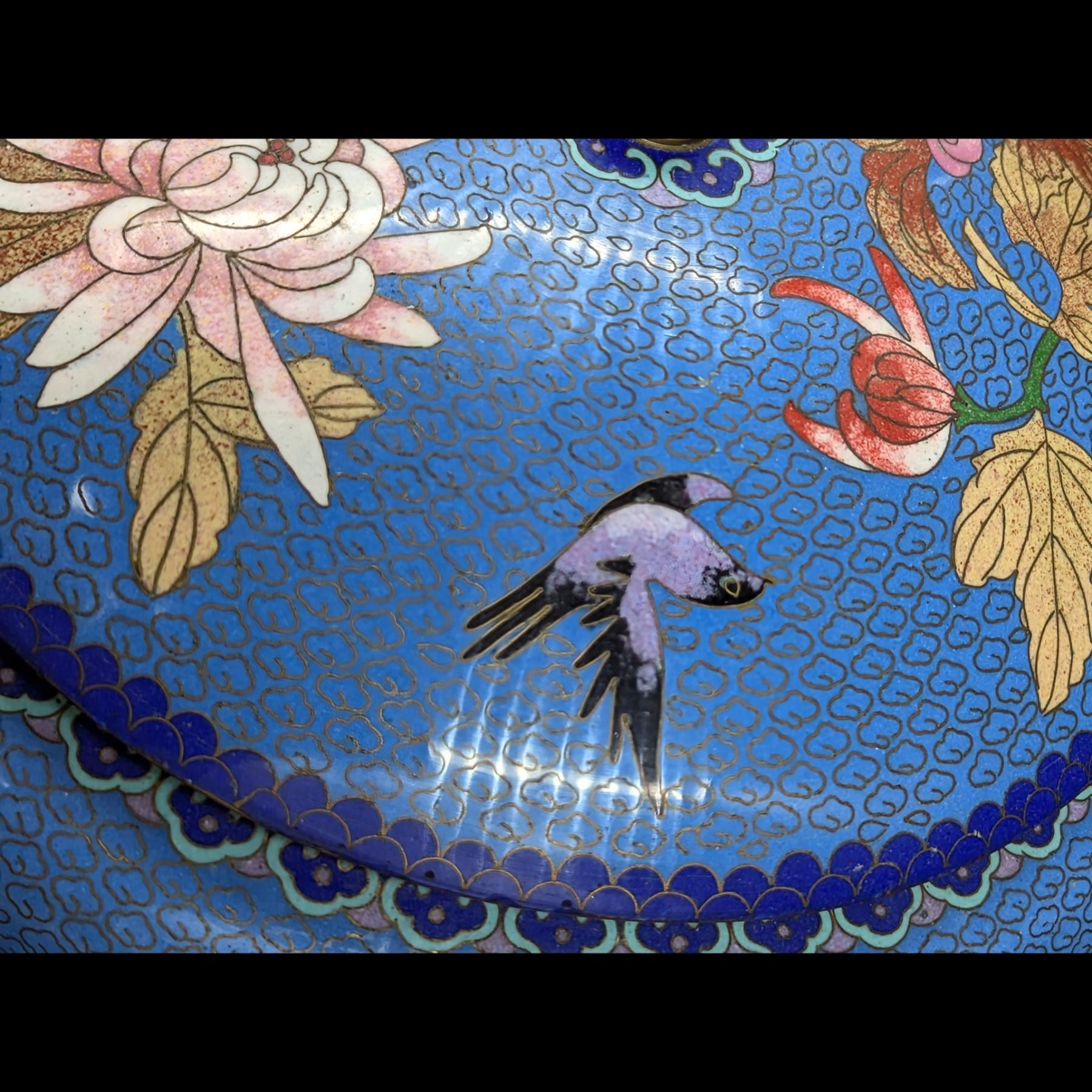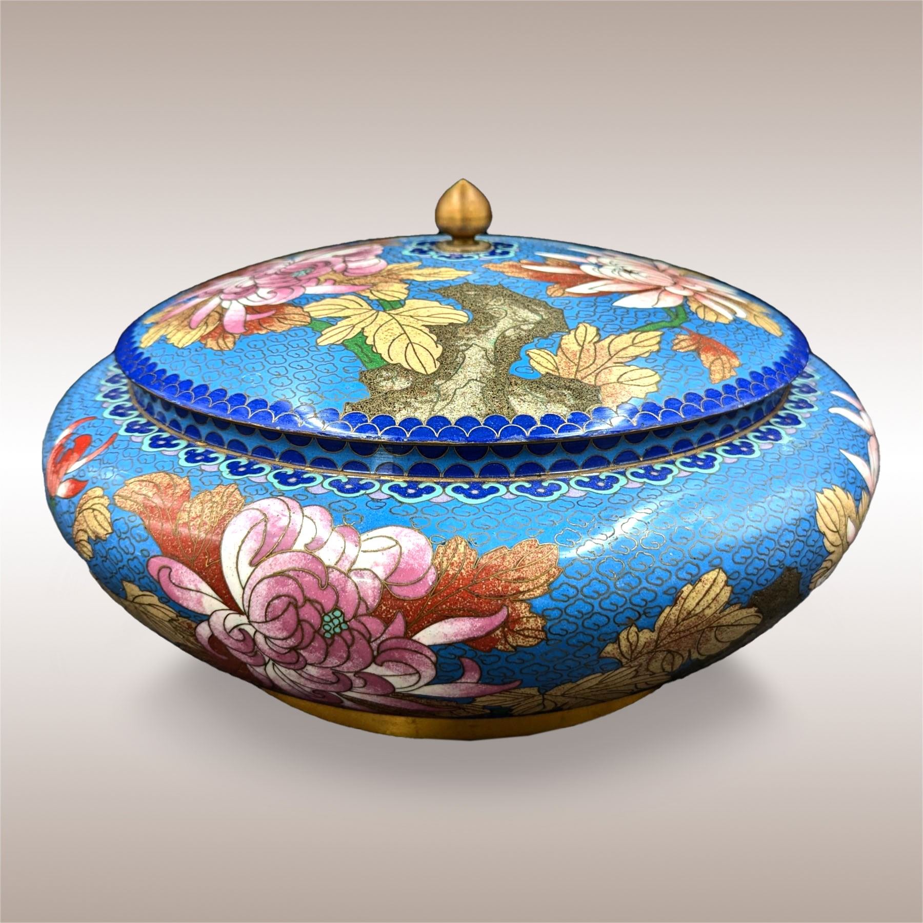 A Large Chinese Cloisonne Lidded Bowl. Measures approx. 17" X 19", Sight measures approx. 7" X 12 1/2".