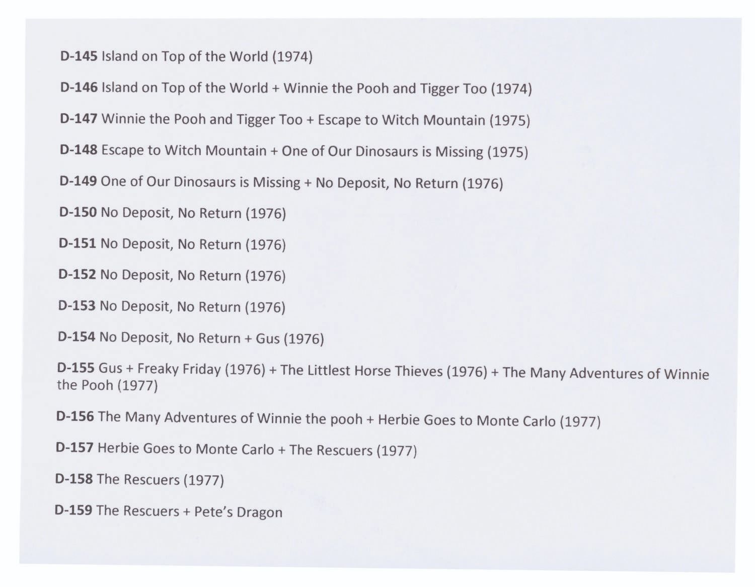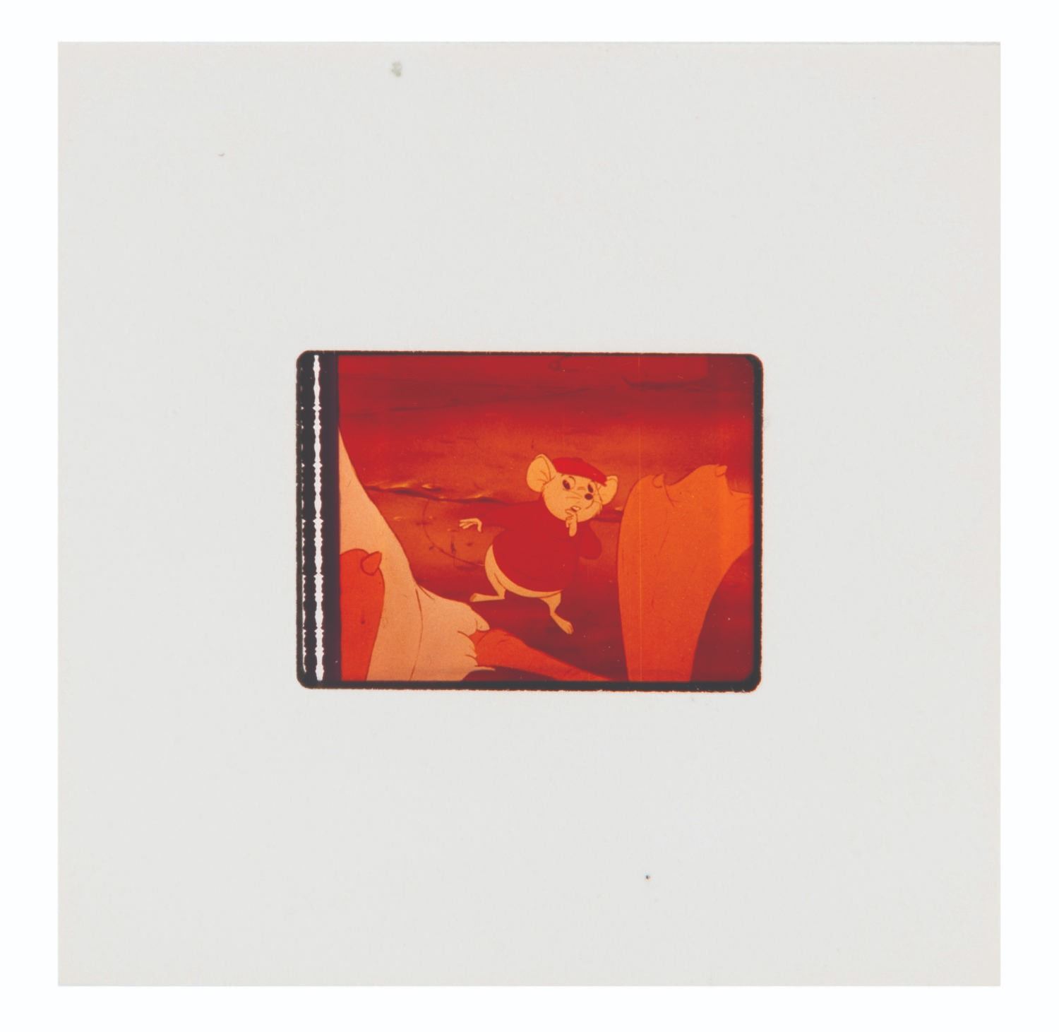 (Disney, 1974-1977) A very large collection of hundreds of Disney movie theatrical trailer slides. Before the digital age, it was a common practice to splice frames out of trailers to source still images. Included in the lot are slides from "The Island at the Top of the World,” "Winnie the Pooh and Tigger Too,” "Escape to Witch Mountain,” "One of Our Dinosaurs is Missing,” "No Deposit, No Return,” "Gus,” "Freaky Friday,” "The Littlest Horse Thieves," "The Many Adventures of Winnie the Pooh,” "Herbie Goes to Monte Carlo,” "The Rescuers,” and "Pete’s Dragon.” Measuring 0.75” x 1” each in 2” x 2” mattes, the slides are in good to fine condition with scratches and wear.