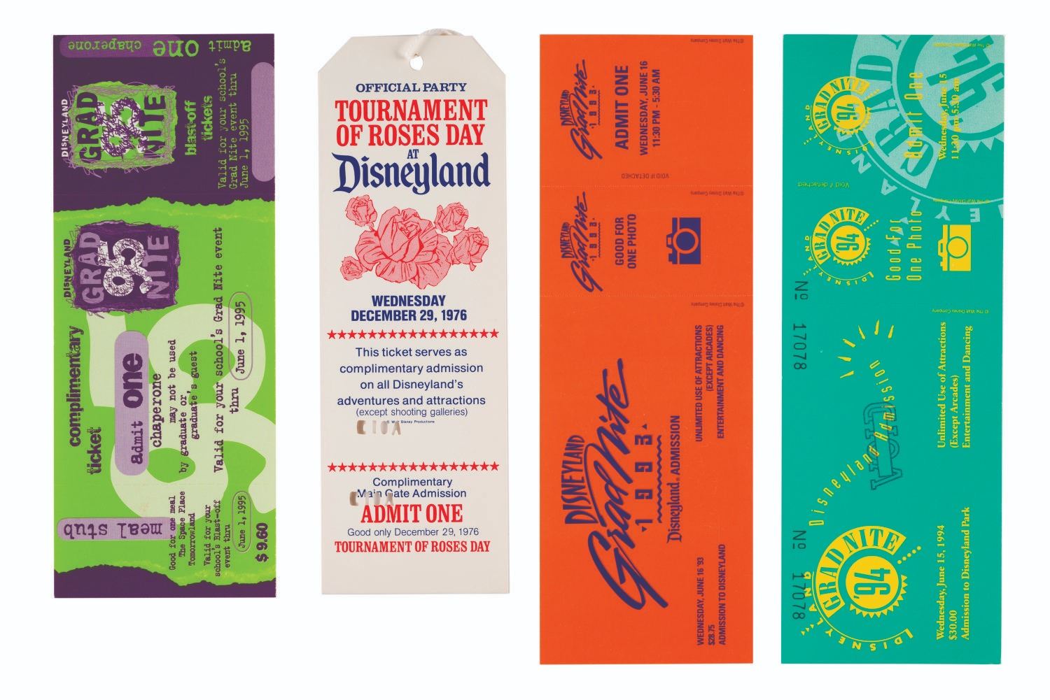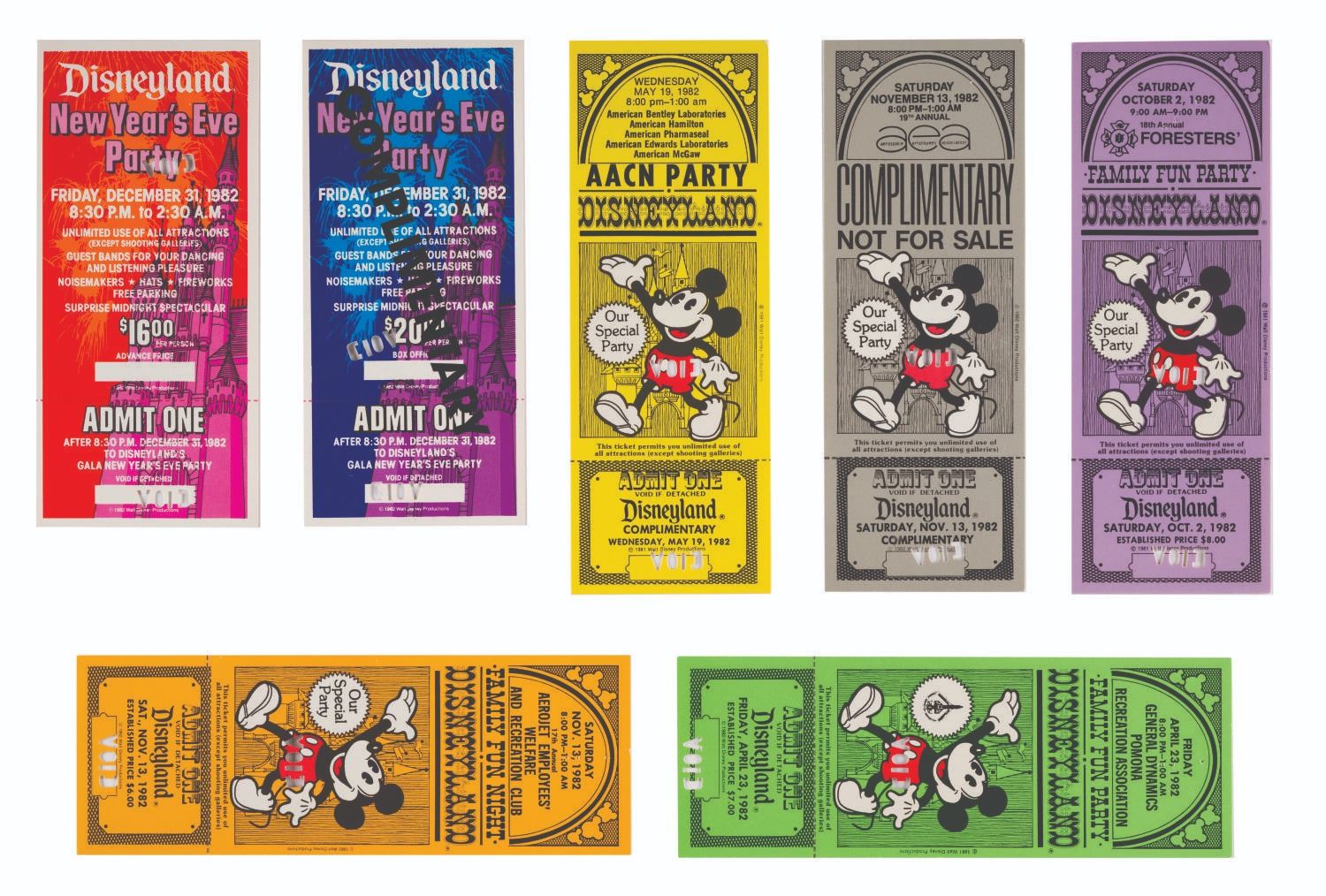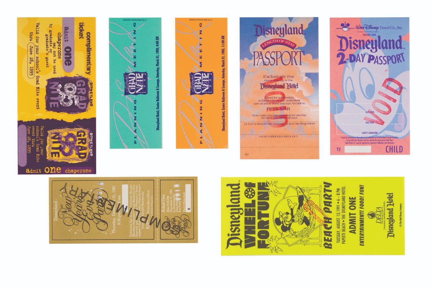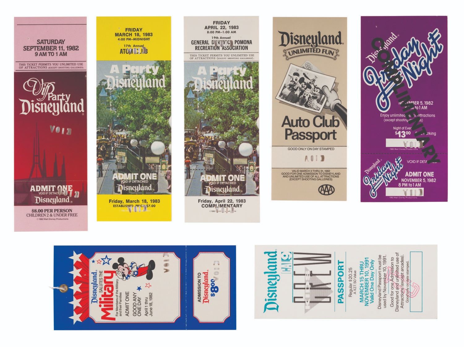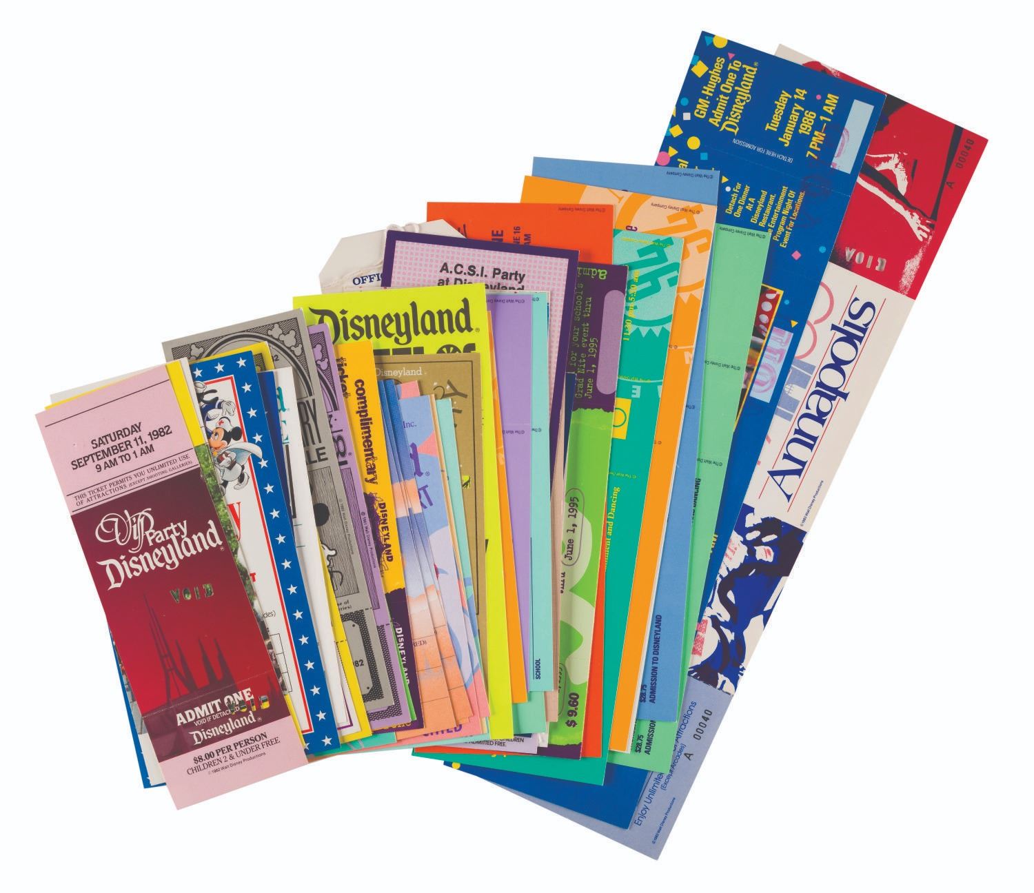 (Disneyland, 1970s-90s) A large collection of 51 Disneyland passports and admission tickets. Included are tickets to the Community Service Awards, Grad Nite, New Year's Eve, Special Parties, and more. Measuring 2" x 5.25" to 12" x 3", each piece is in very good to fine condition with minor wear from Guest use.