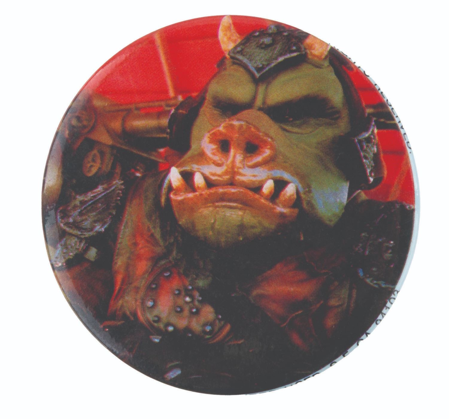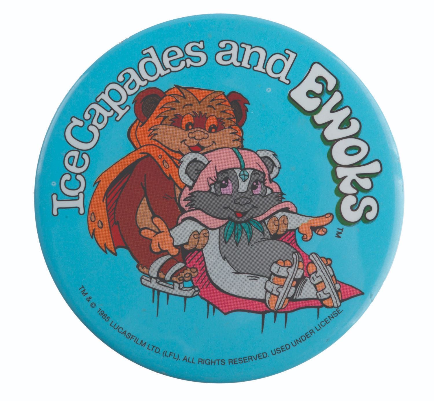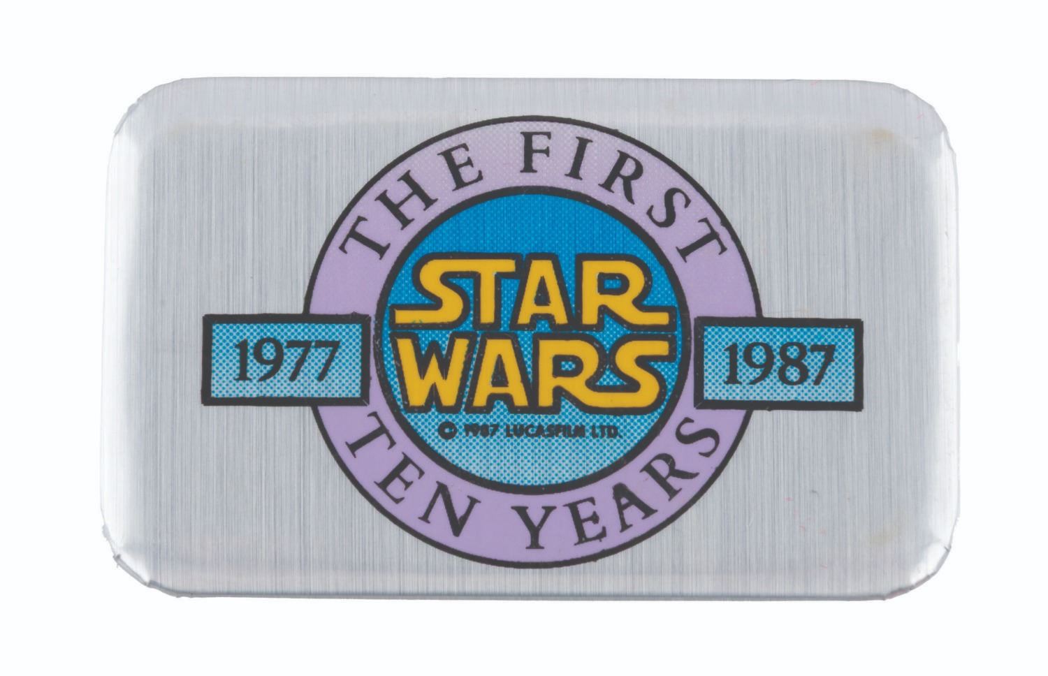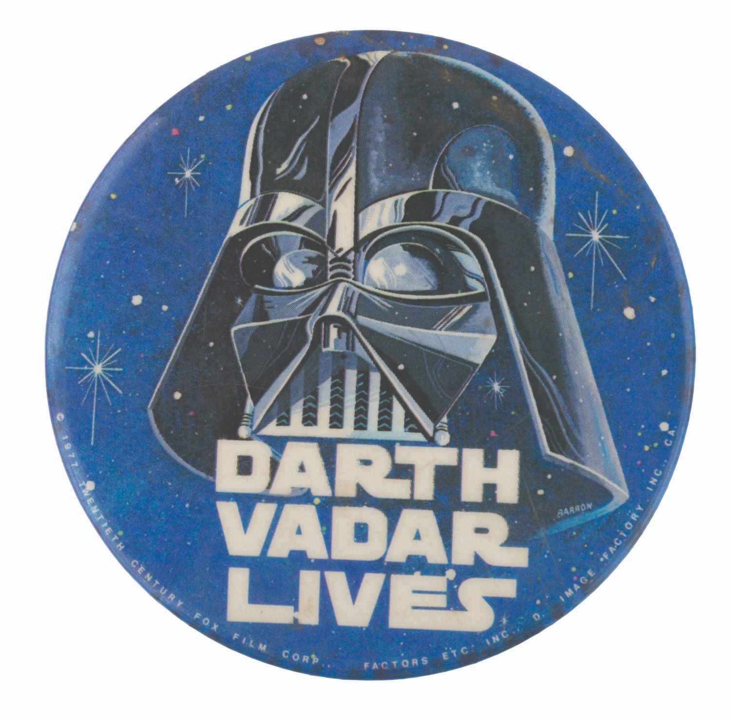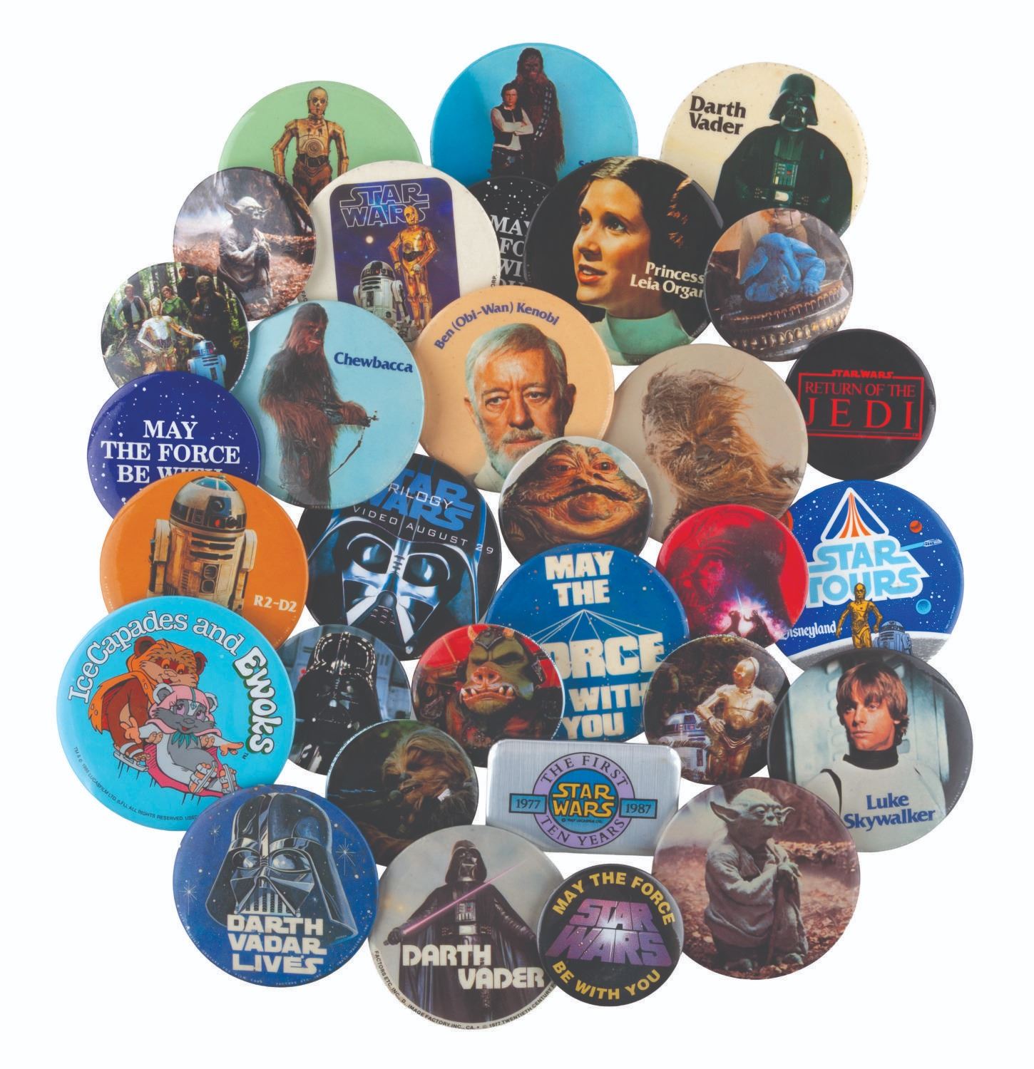 (Lucasfilm Ltd., 1977-95)A collection of 31 early Star Wars buttons, including 16 from the 1977 and 1980 original releases, and ten from “Return of the Jedi.” Also included are buttons for Ewoks Ice Capades, the 10th anniversary in 1987, Star Tours at Disneyland, and two from the 1995 Home Video release. Measuring up to 3.25” in diameter, the buttons are overall in very good condition, with the “Darth Vader Lives” button displaying in good condition, though with heavy oxidation on the back, and some of the oldest showing light wear, including spotting.