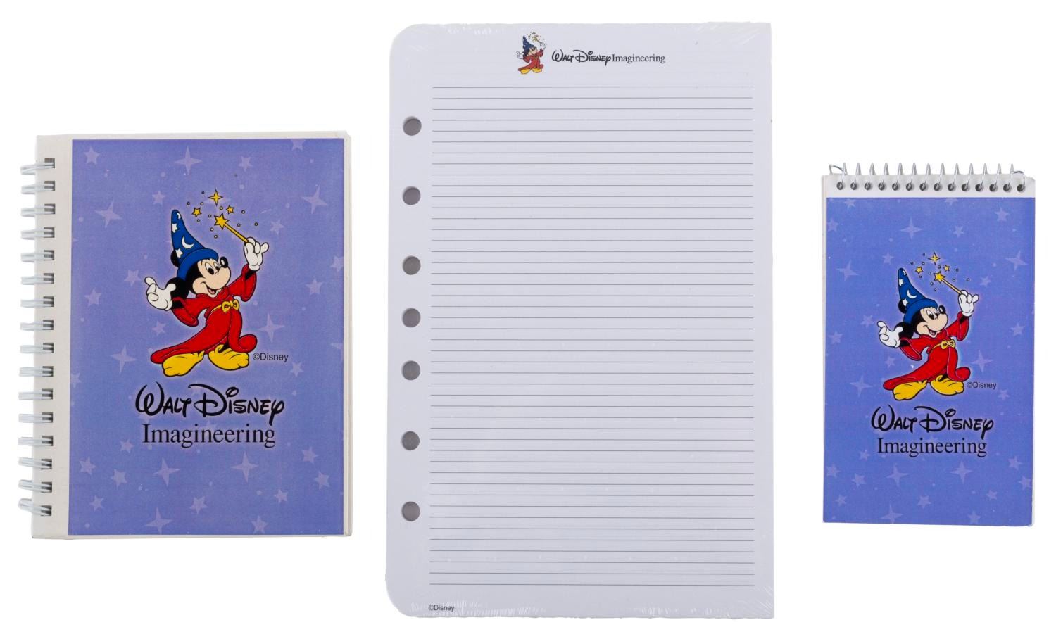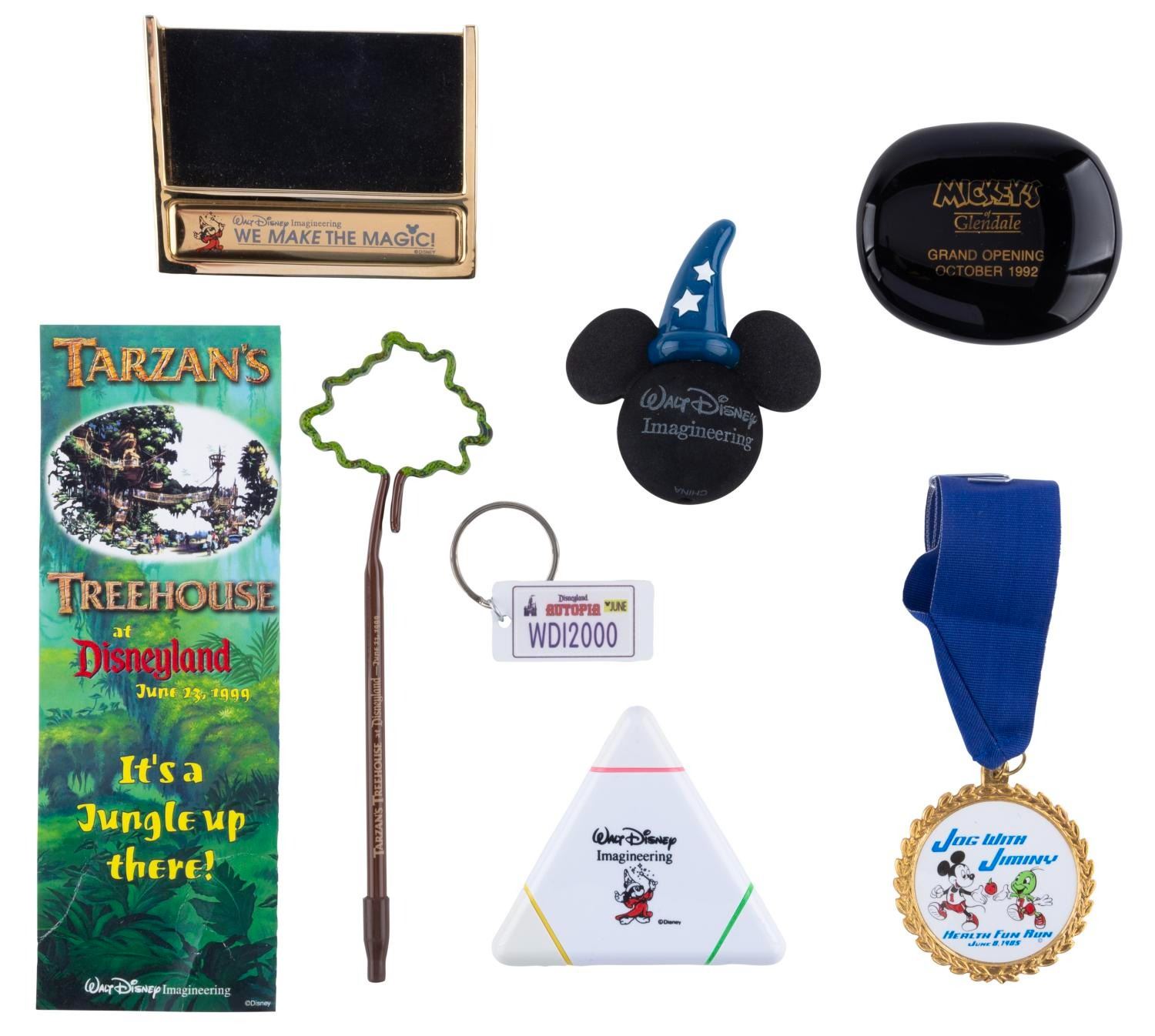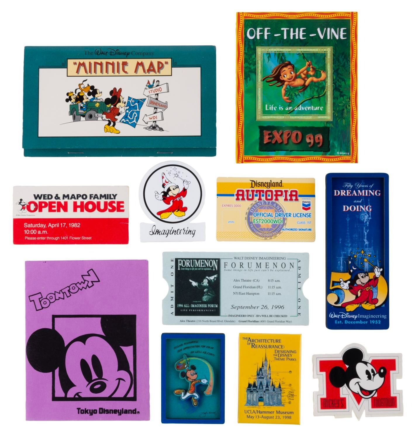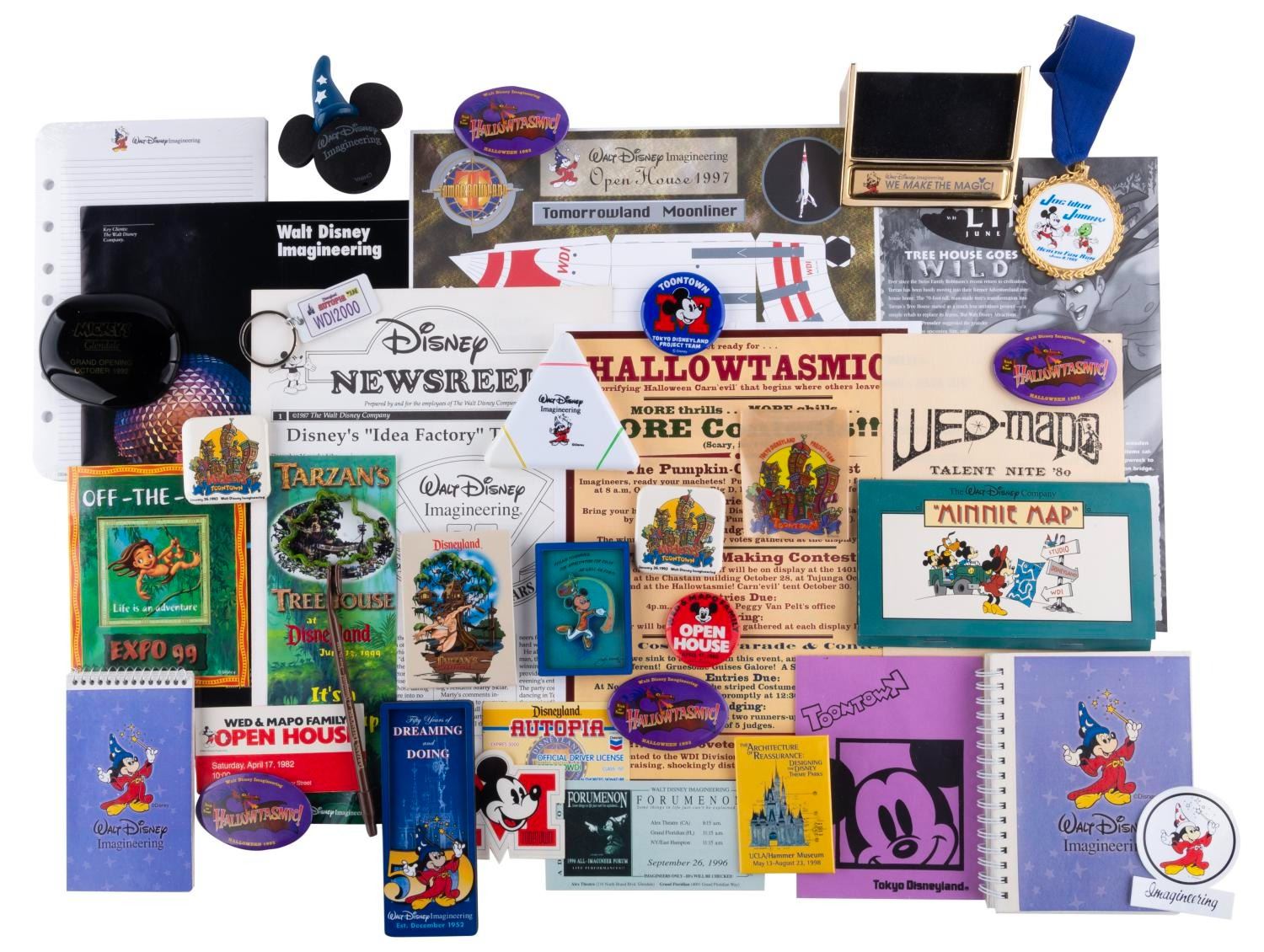 (WDI, 1980-2002) A large collection of Walt Disney Imagineering exclusive souvenirs. Included are buttons, magnets, decals, stationery, and other items celebrating production teams, attractions, and Imagineering overall. From a WED-MAPO 1980 talent night program to a 1997 Imagineering Open House Tomorrowland Moonliner paper model, there are many years' worth of treasures to unpack. An Imagineering business card holder, Tokyo Disney Toontown project pins, and a Disney signage guide are just a few of the exciting items here. Measuring from 1.75" in diameter to 9" x 12", the items are in very good condition with light wear from use.