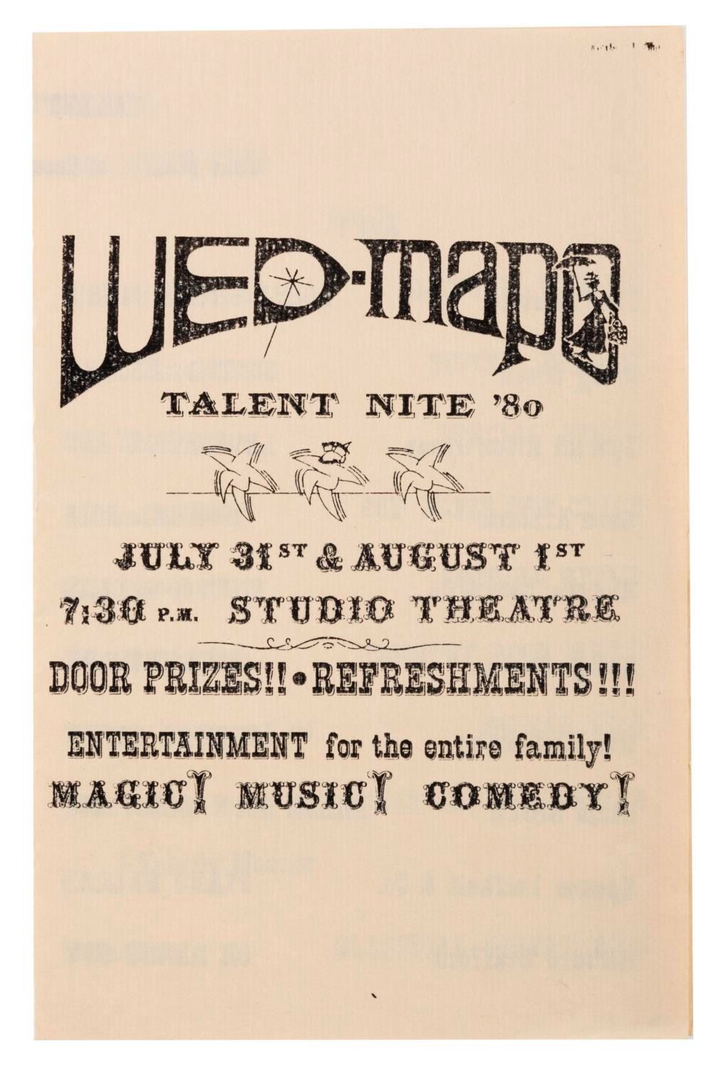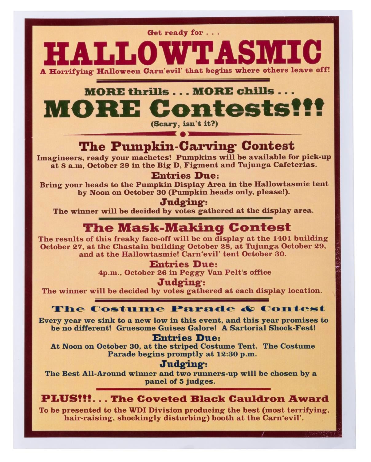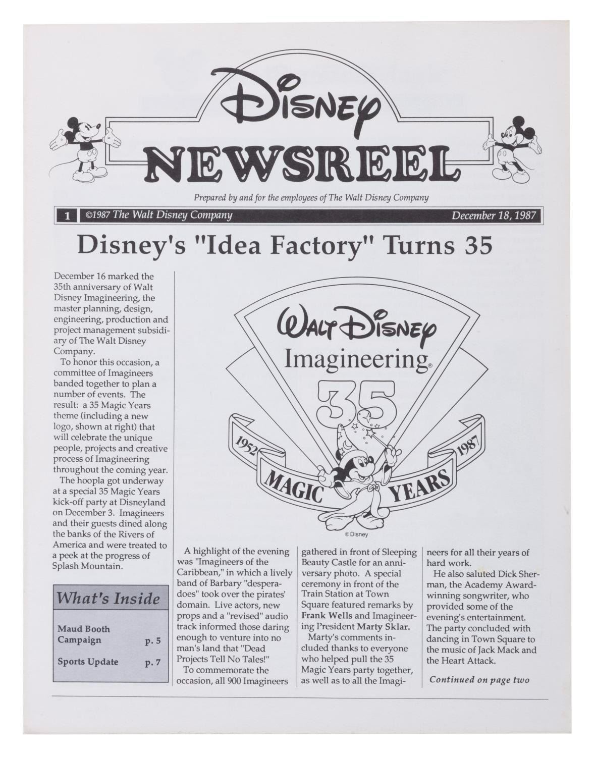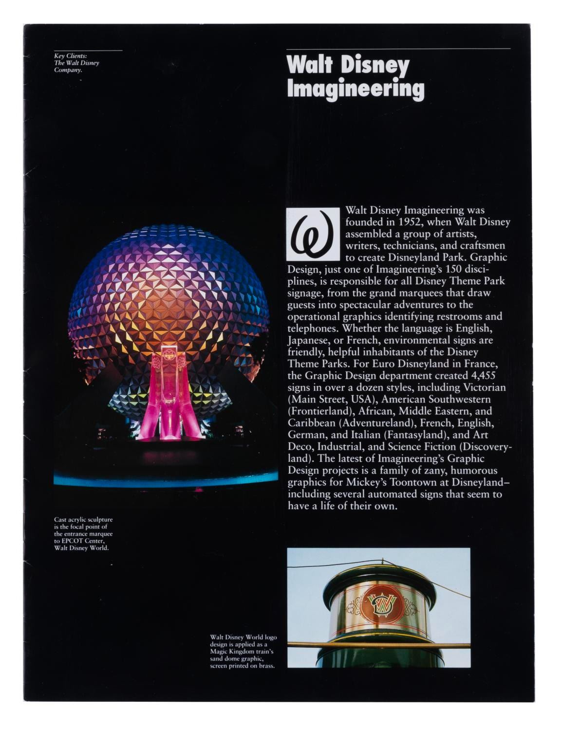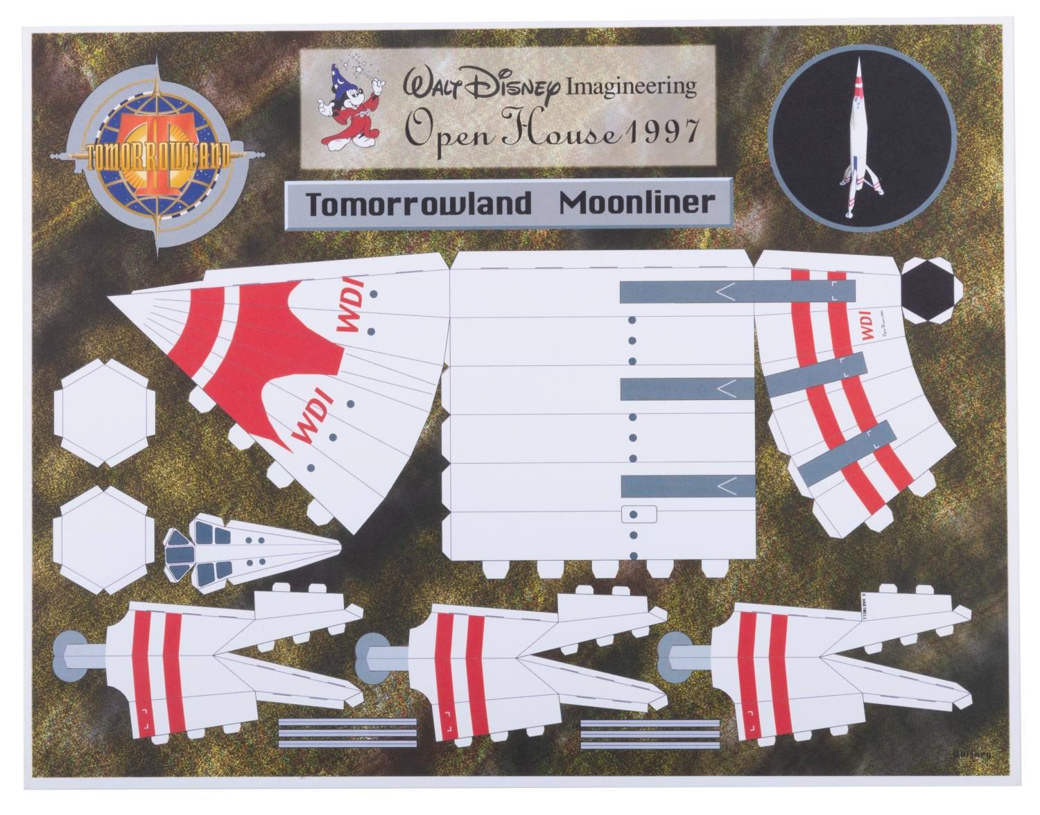 (WDI, 1980-2002) A large collection of Walt Disney Imagineering exclusive souvenirs. Included are buttons, magnets, decals, stationery, and other items celebrating production teams, attractions, and Imagineering overall. From a WED-MAPO 1980 talent night program to a 1997 Imagineering Open House Tomorrowland Moonliner paper model, there are many years' worth of treasures to unpack. An Imagineering business card holder, Tokyo Disney Toontown project pins, and a Disney signage guide are just a few of the exciting items here. Measuring from 1.75" in diameter to 9" x 12", the items are in very good condition with light wear from use.