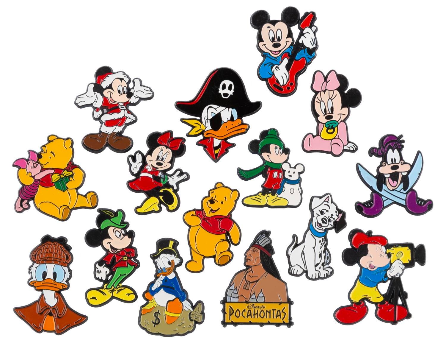 (Disney, 1990s) A collection of 15 Disney character pins from Sedesma Spain including Uncle Scrooge, Donald and Goofy as pirates, and more. The pins are in very good to fine condition, with slight line loss on the Mickey with Motion Picture Camera pin.