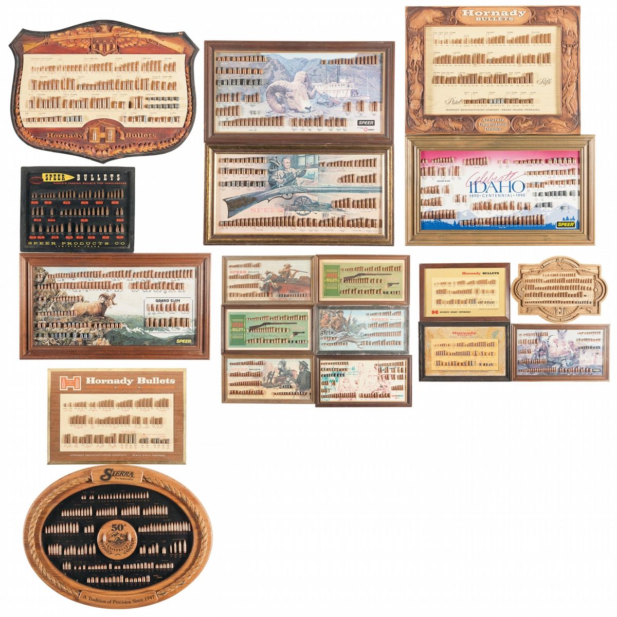 This lot is comprised of 12 framed Speer bullet boards including the U.S. Bicentennial issue, the Idaho Centennial issue and the 100th Anniversary of Reloading issue. 6 framed Hornady bullet boards including the "Tradition of Excellence" issue. 1 framed Sierra 50th Anniversary issue bullet board. The boards are good to fine with two of the Speer boards in the original shrink wrap. The Hornady board with the map background is absent the .458 FMJ bullet.