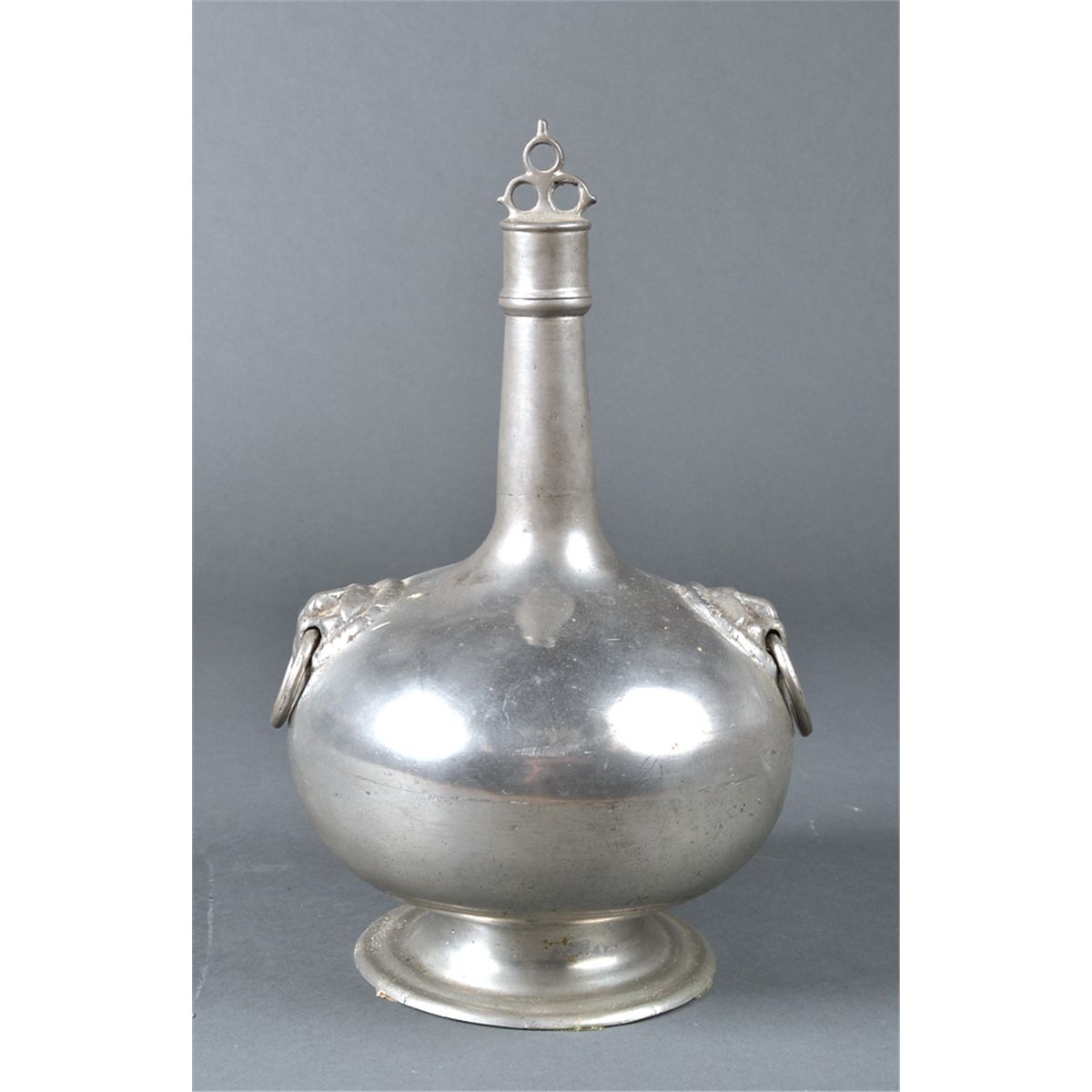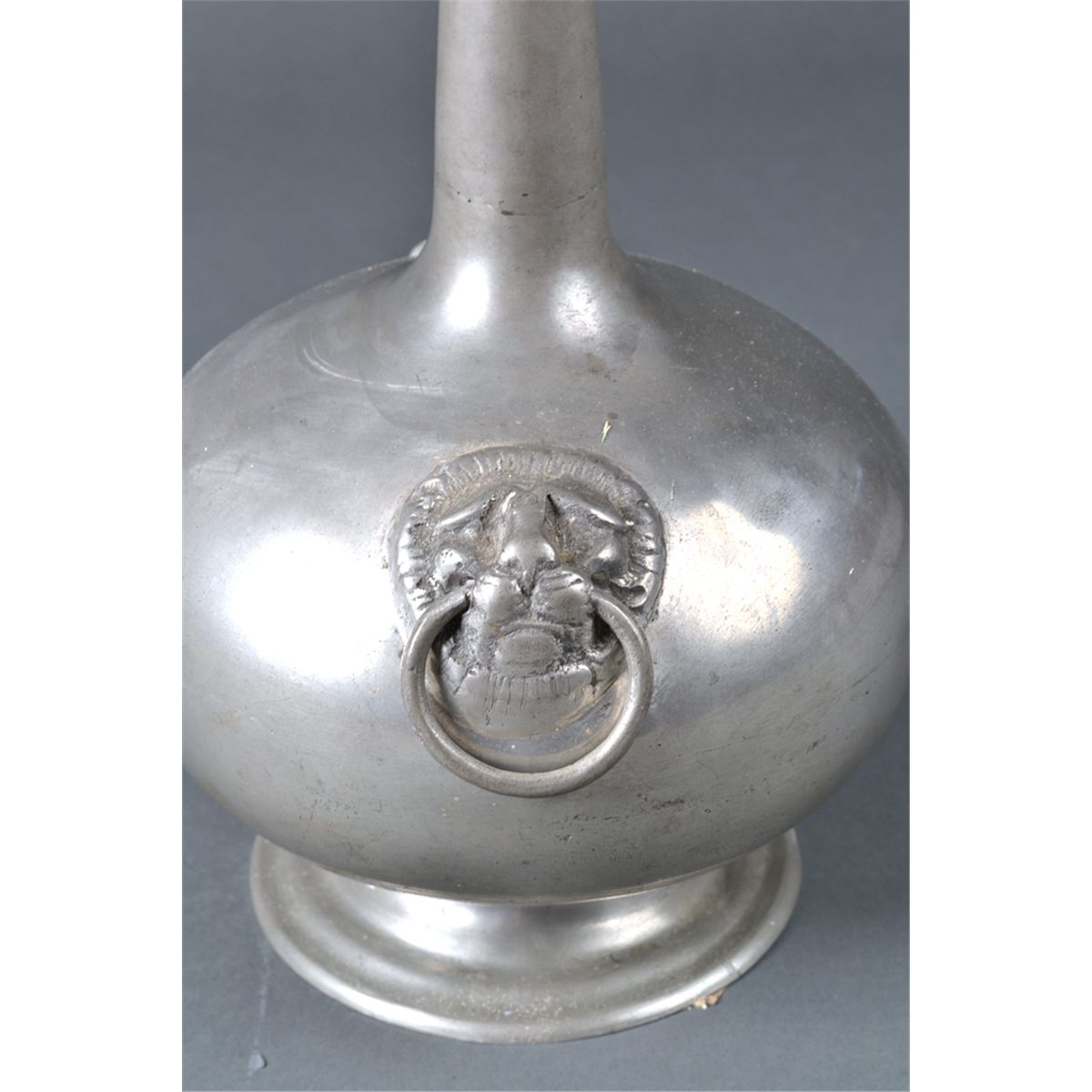 Of bulbous form with splayed foot, lion head handles and loose rings. Apparently unmarked. 12.25" H, circa 19th century. Private collection Macomb, MI.