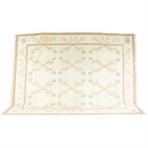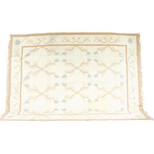 <B>A Large Dhurrie Rug</B></I><BR><BR>Unknown maker, India<BR>Twentieth century<BR>Wool, cotton<BR>164 x 128 inches (416.6 x 325.1 cm)<BR>Unmarked<BR> The flat woven rug with stylized geometric floral decoration on cream ground with coral borders.<BR><BR><b>Shipping:</b> Requires 3rd Party Shipping (<a target="_blank" href="http://www.heritageauctions.com/common/shipping.php">view shipping information</a>)