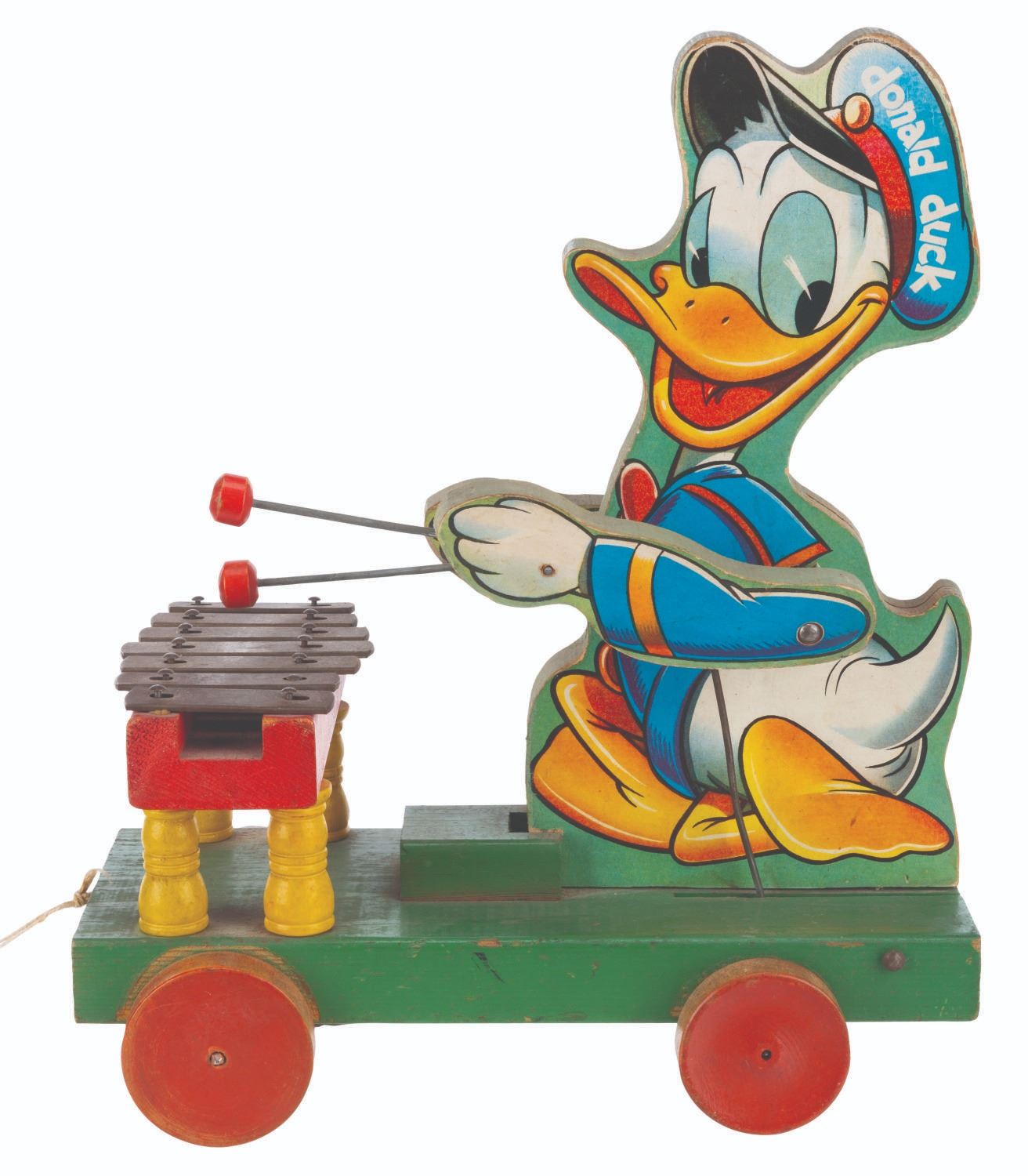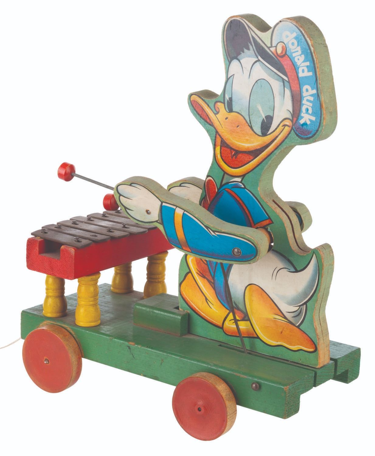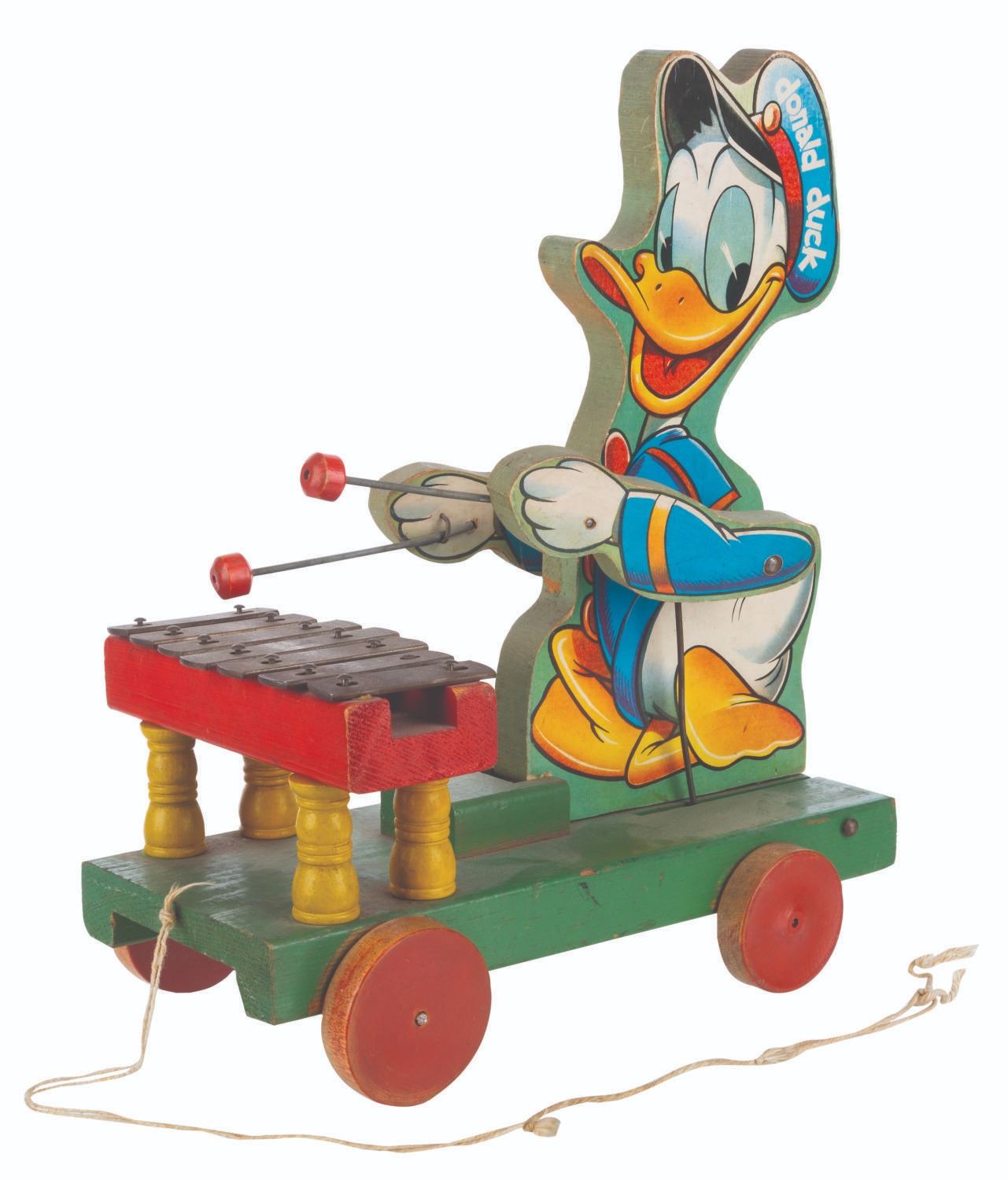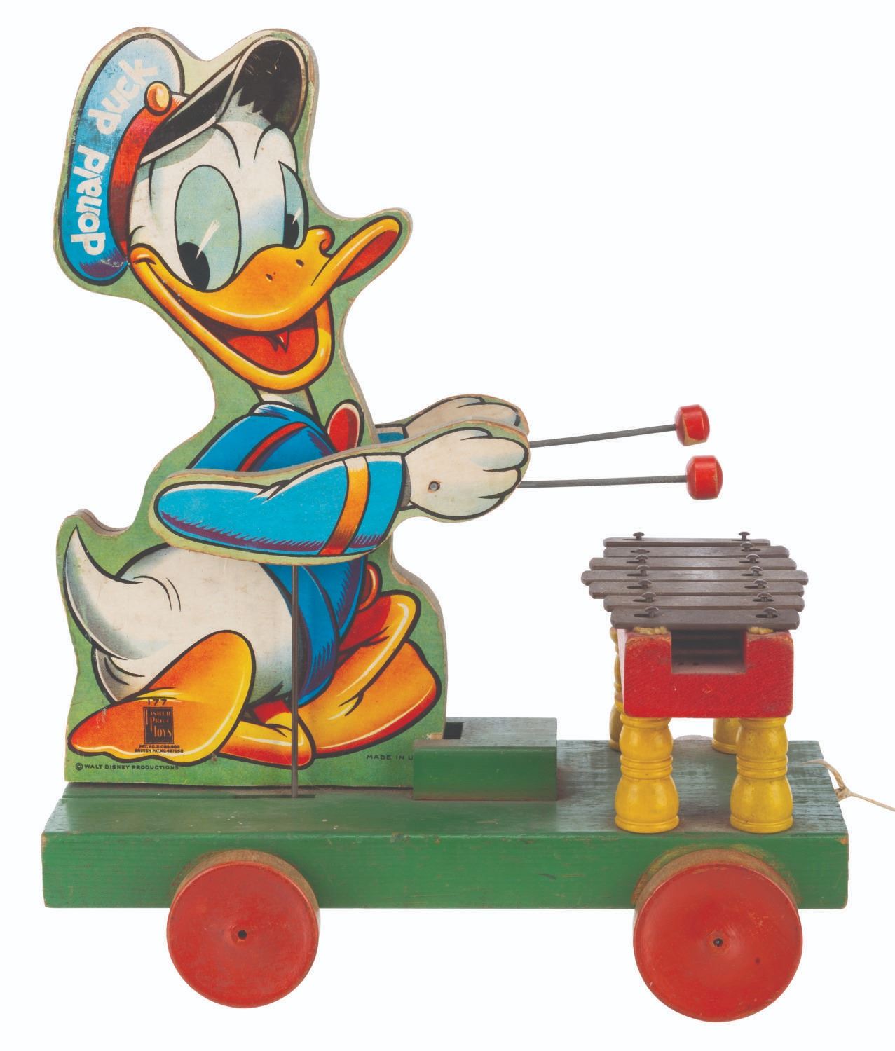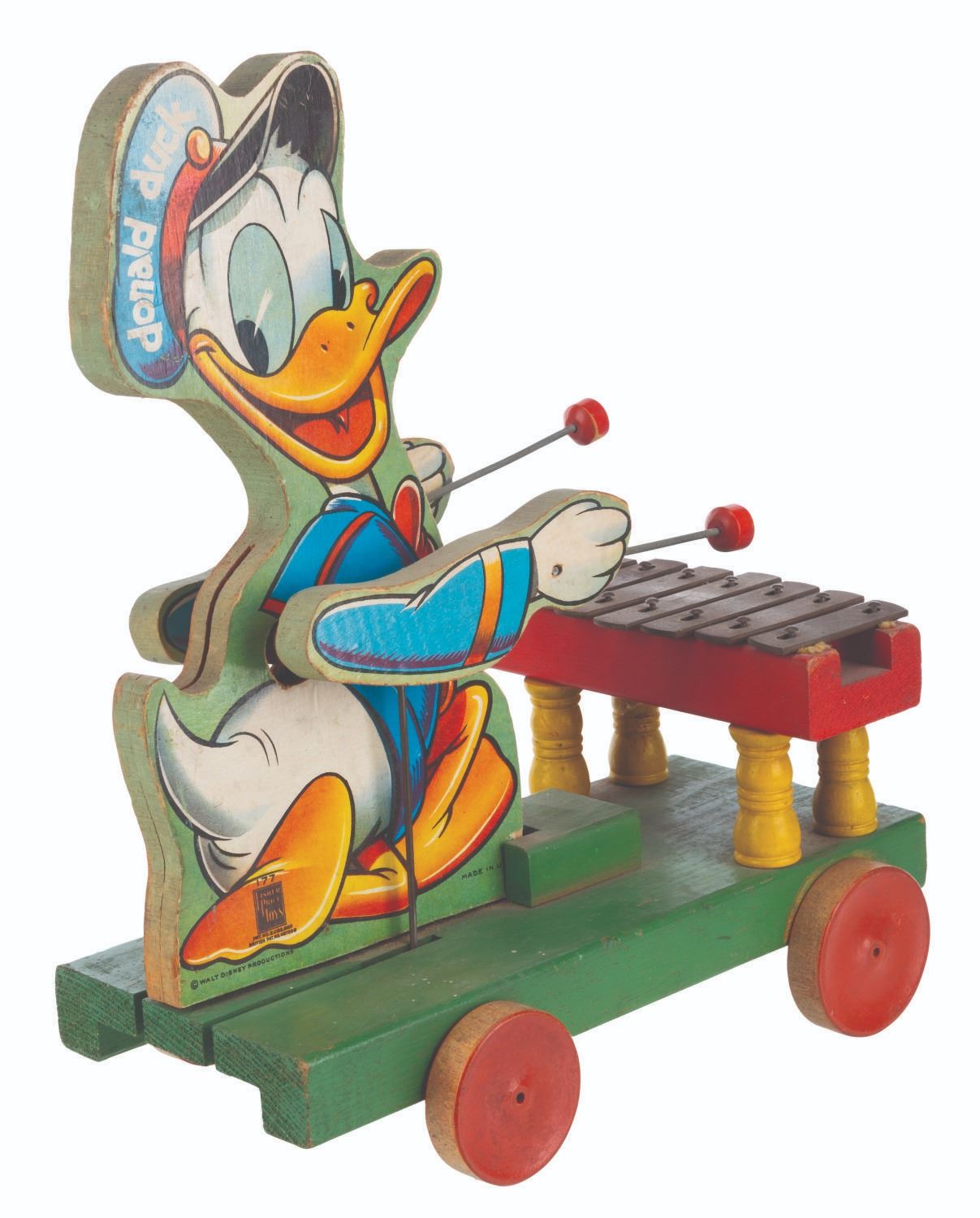 (Fisher-Price, 1946-52) A large Donald Duck Xylophone pull toy by Fisher-Price. When pulled, Donald sways and his arms move up and down, striking the metal keys. The 6.25" x 11" x 13.25" tall wooden toy is in very good working condition with typical wear from age use, light oxidation to the keys, and light soiling to Donald’s cap on the right side lithograph.