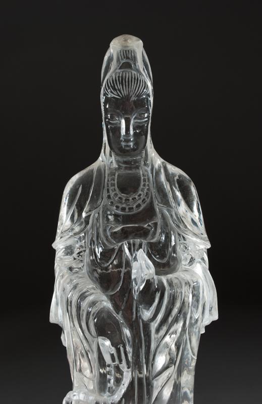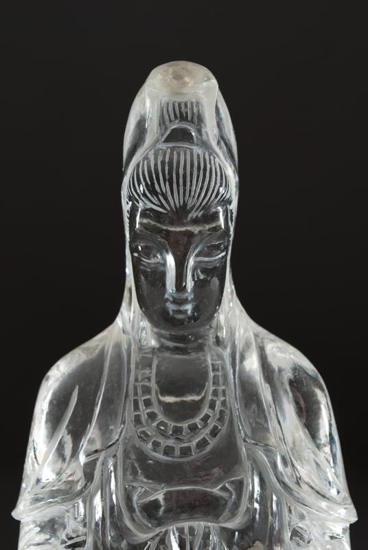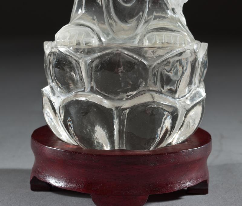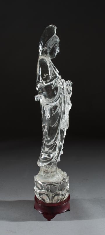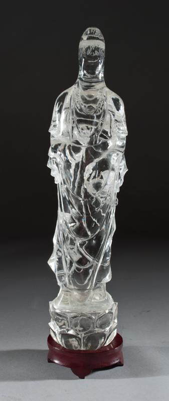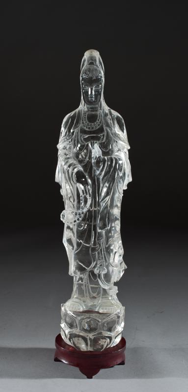 A very fine carved rock crystal figure depicting Guanyan Buddisattva, standing on a lotus base, with fine polish, 14.5"H circa 20th century.