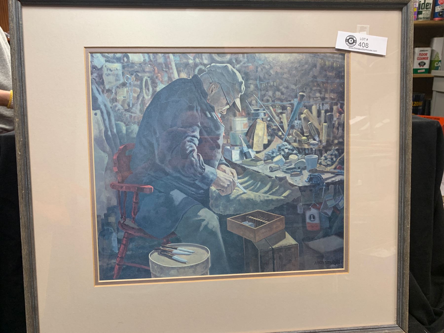 A Large Framed Print of An Old Knife Maker Making Knives. 21" h x 23" w