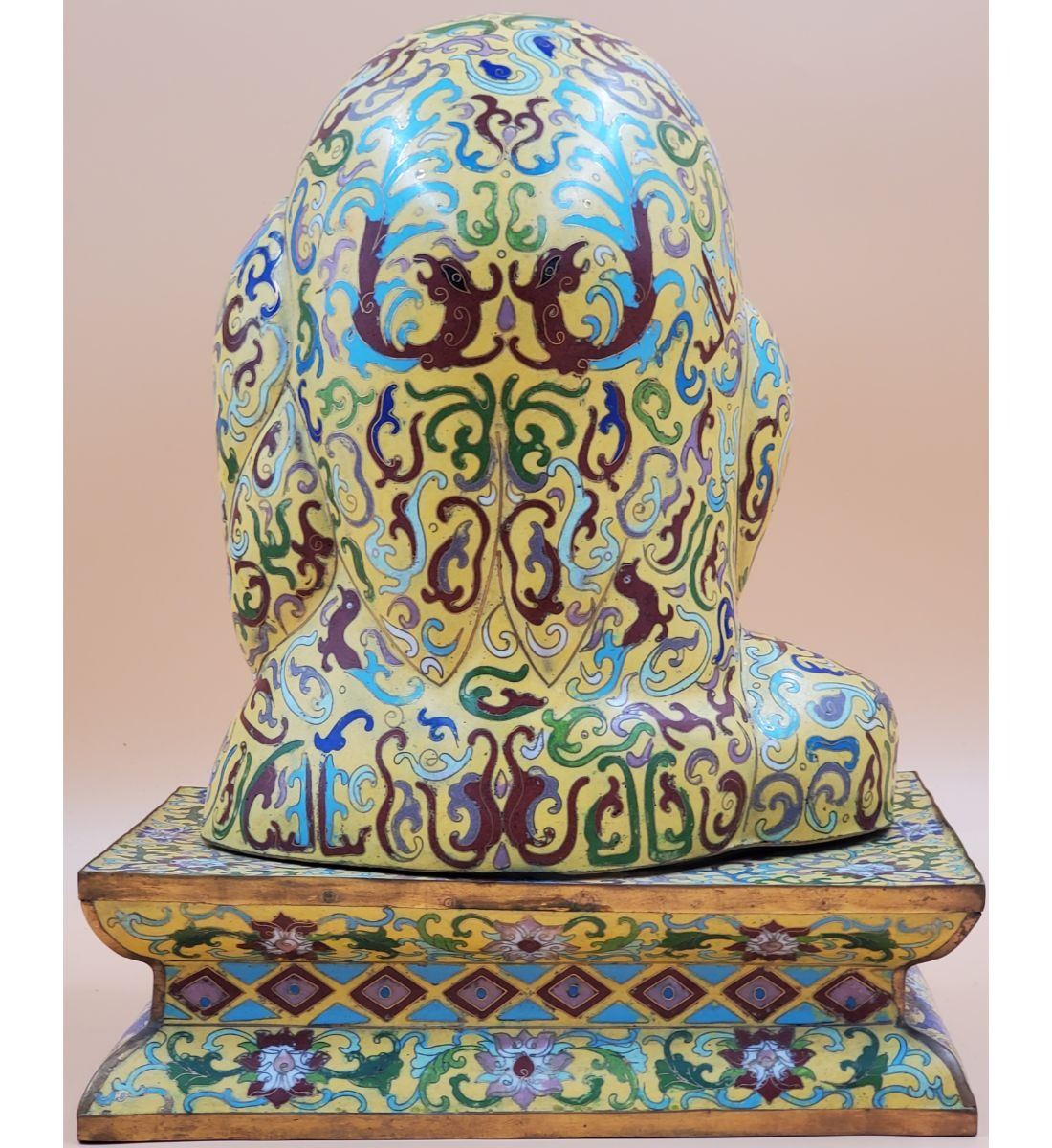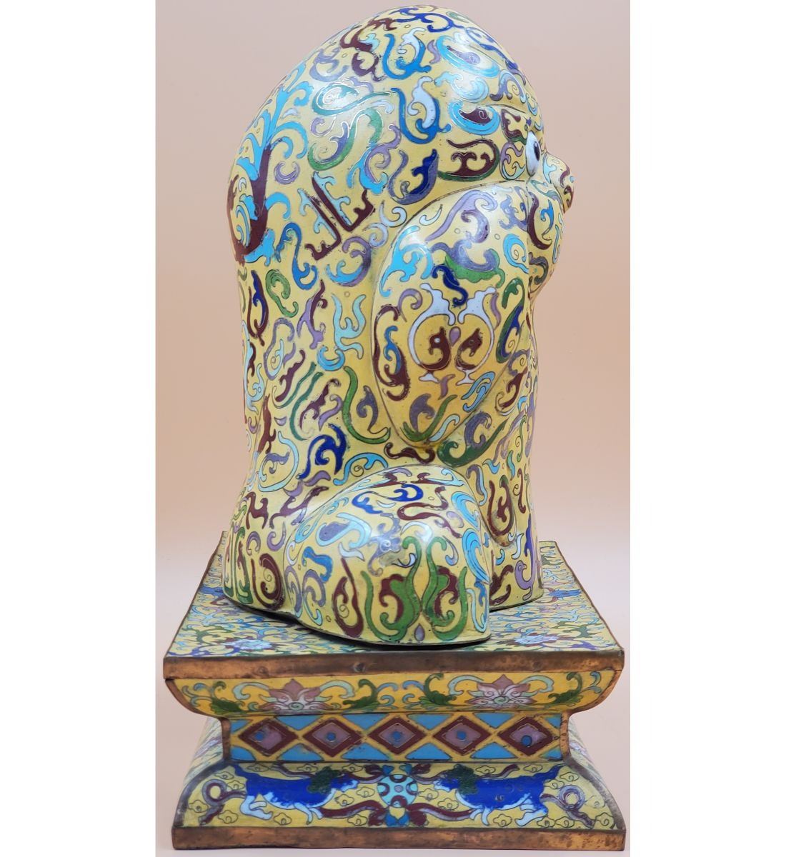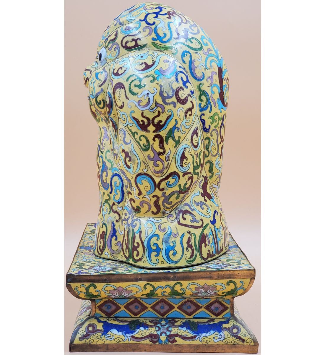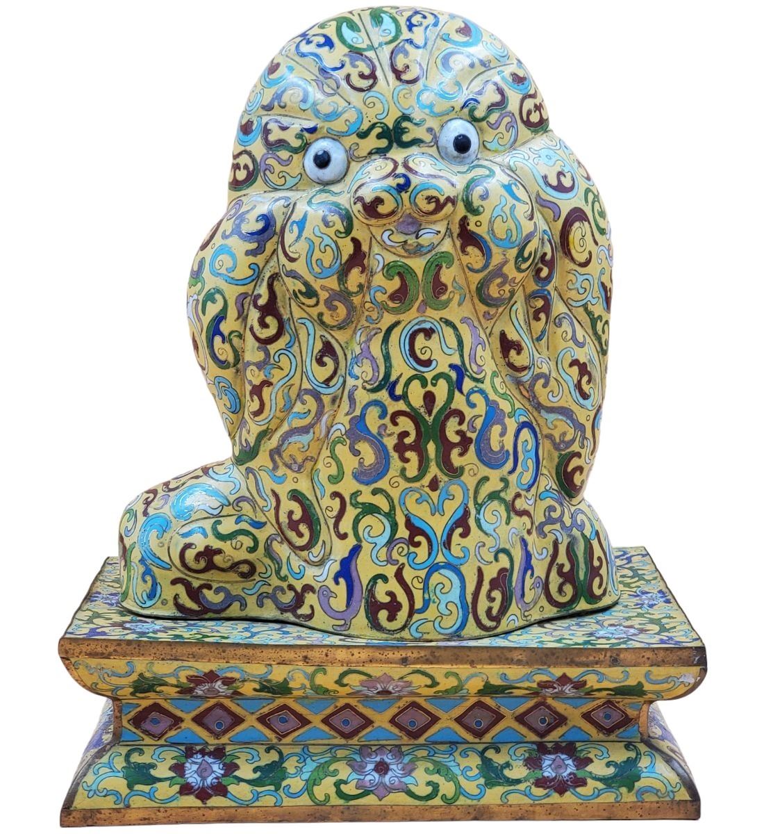 A Large Imperial Yellow Chinese Cloisonne Pekingese Sculpture. It stands at 16" and the base measures 8" x 12". Provenance: One Person Private Estate Central Florida.