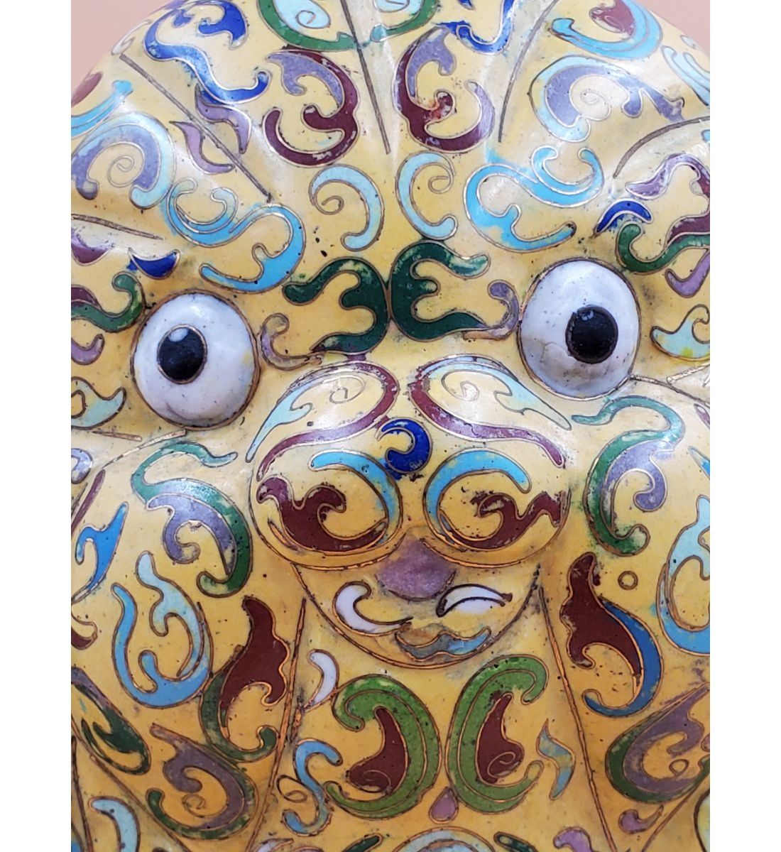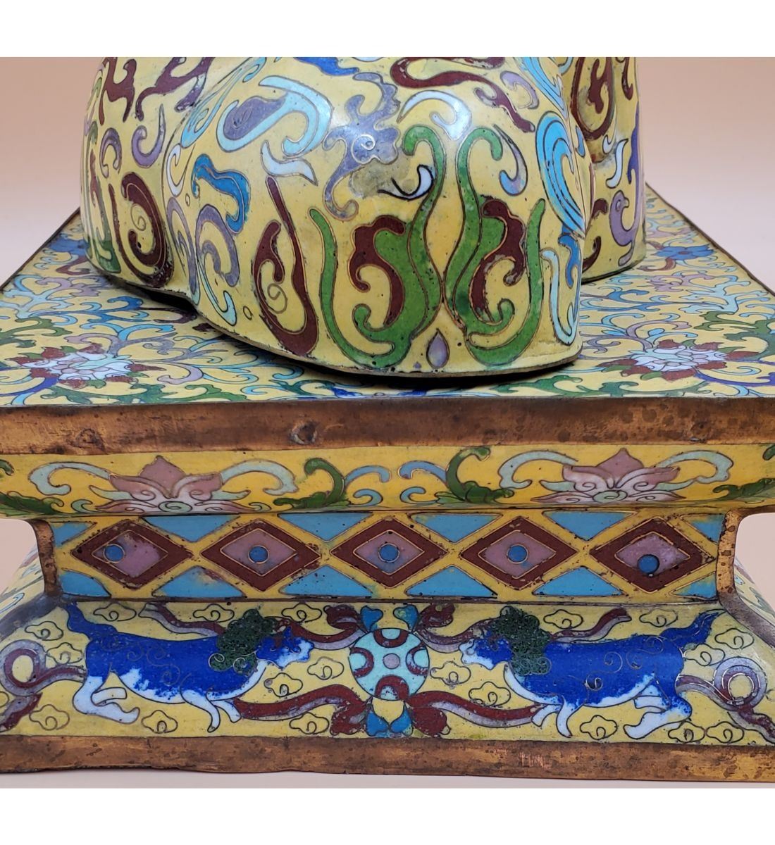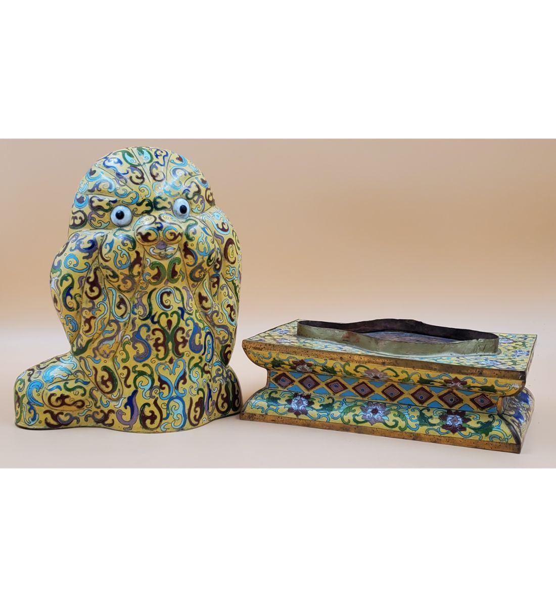 A Large Imperial Yellow Chinese Cloisonne Pekingese Sculpture. It stands at 16" and the base measures 8" x 12". Provenance: One Person Private Estate Central Florida.
