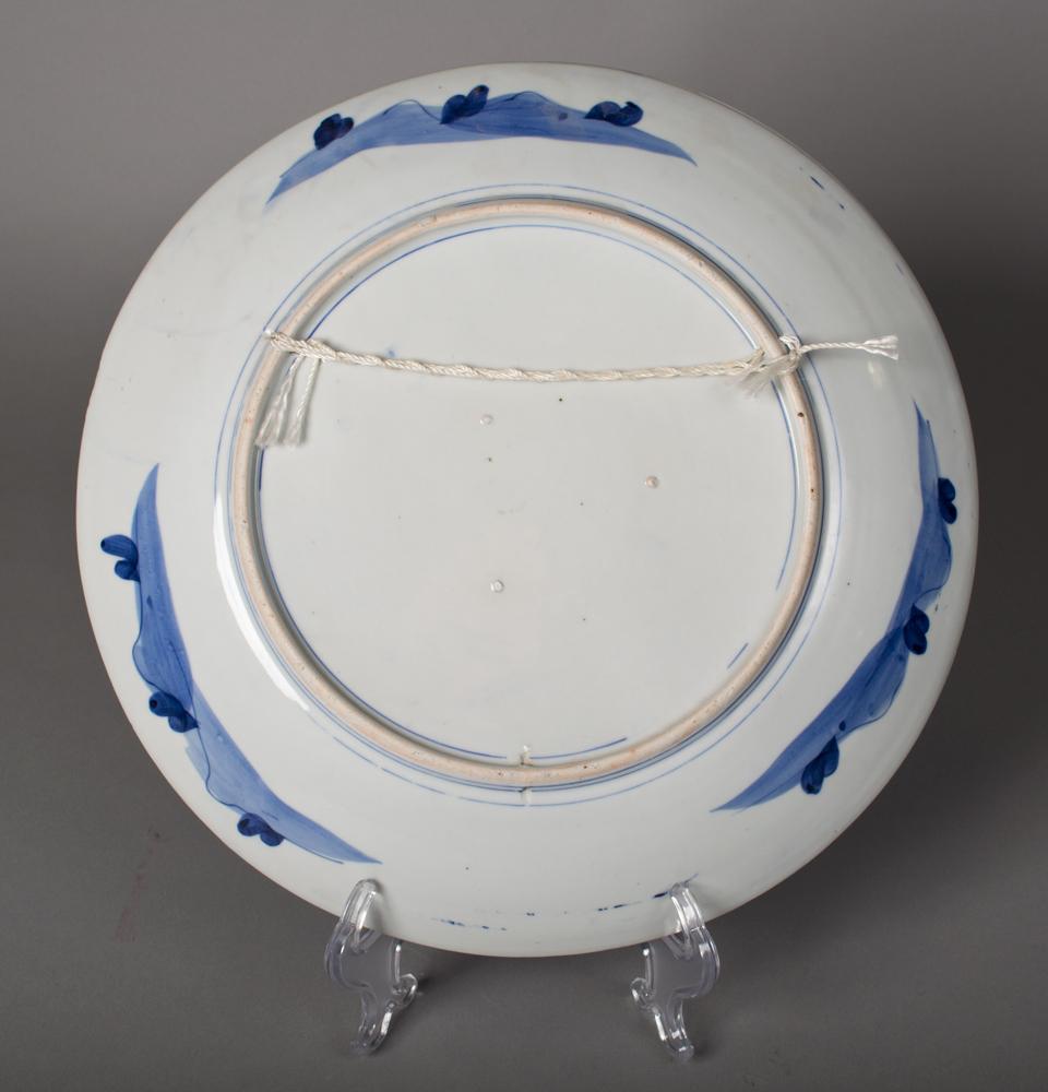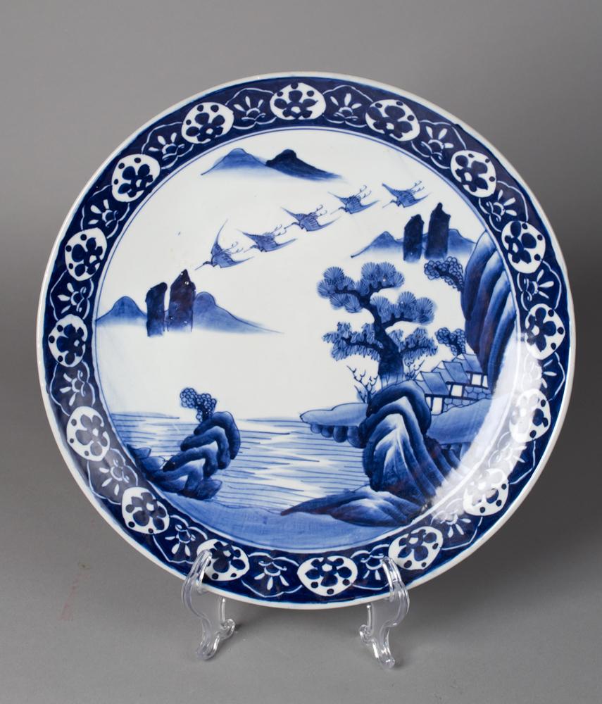 Painted to depict five flying cranes within a landscape the under rim decorated with landscape unmarked, 14.5"D X 1.75"H circa late 19th century.