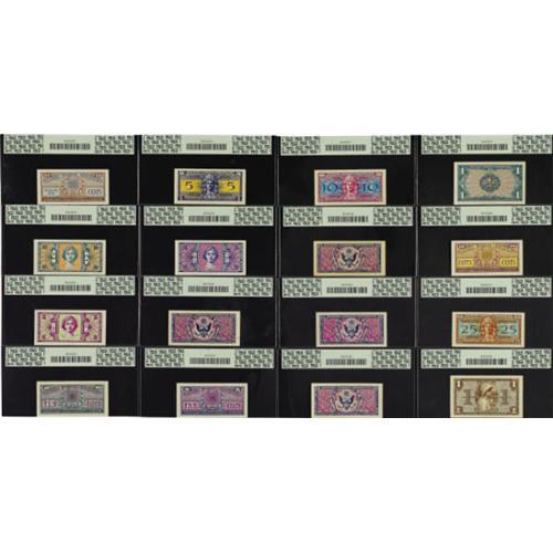 <B>A Large MPC Group.</B></I> All have been graded by PCGS. Series 481 Five Cent <B>55PPQ</B></I>, Ten Cent <B>65PPQ</B></I>, 25c <B>58</B></I> and 50c <B>63</B></I>. Series 521 5c <B>66PPQ</B></I>, Ten Cent <B>64PPQ</B></I>, 25c <B>55 </B></I>and One Dollar <B>53</B></I>. Series 541 5c <B>67PPQ</B></I>, Ten Cent <B>67PPQ </B></I>and 25c <B>65PPQ</B></I>. Series 611 5c <B>64PPQ</B></I>, Ten Cent <B>66PPQ</B></I>, 25c <B>68PPQ</B></I>, 50c <B>55 </B></I>and $1 <B>55</B></I>.<BR><I>From The Thomas M. Flynn Collection</B></I><BR><BR><b>Shipping:</b> Coins & Currency (<a target="_blank" href="http://www.heritageauctions.com/common/shipping.php">view shipping information</a>)