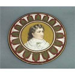 The circular footed dish decorated with a pre Raphaelite style hand painted portrait of a gentleman surrounded by an encircling band of lilies. Signed with painted monogram and impressed crown.