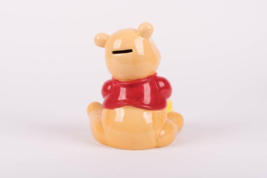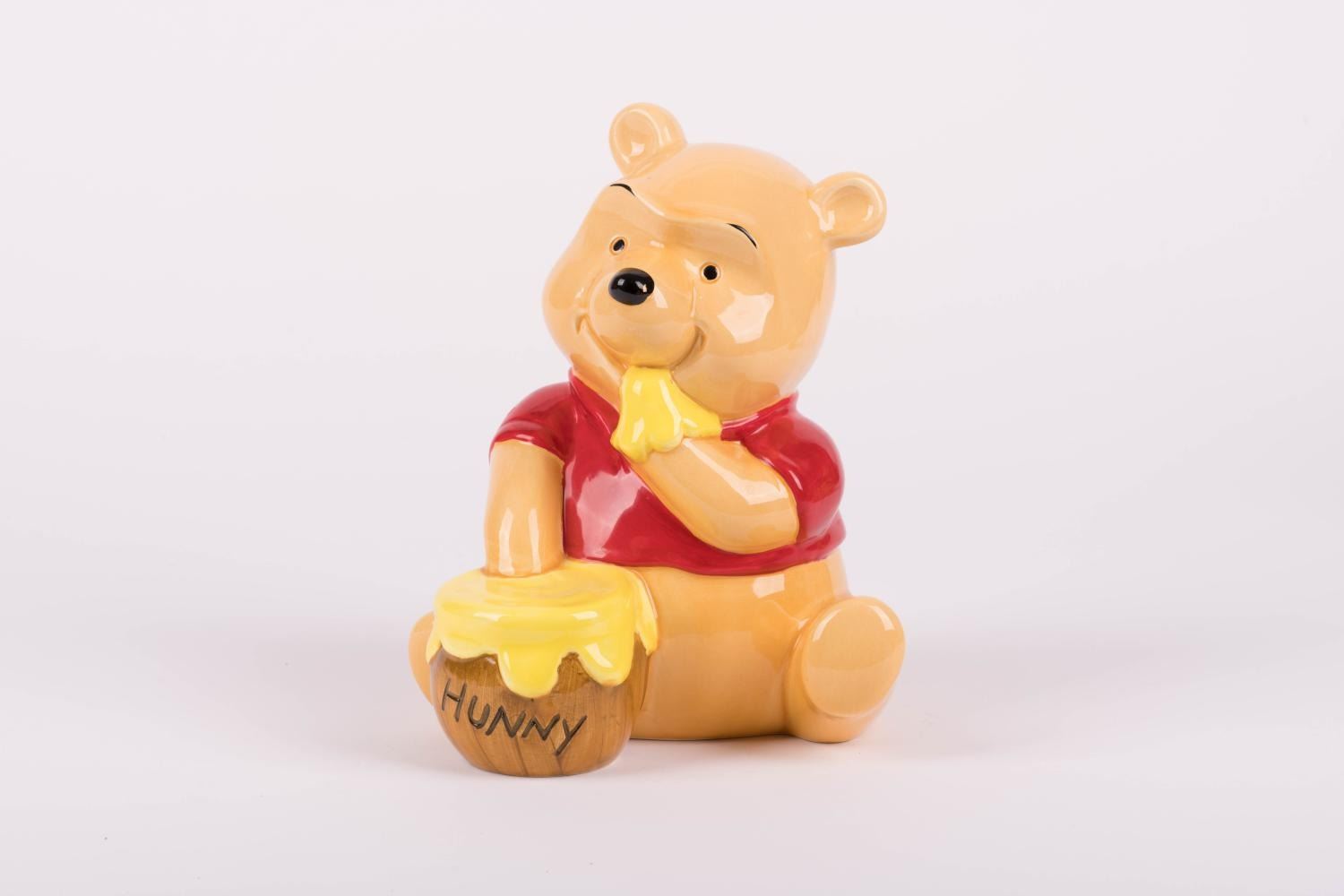 (Disney, 1970s-80s) A glazed and painted ceramic bank of Winnie the Pooh with a jar of"Hunny." Measuring 6" x 6.5" and 8" tall, the bank is in very good condition with light wear and a small chip in the paint on Pooh's nose.