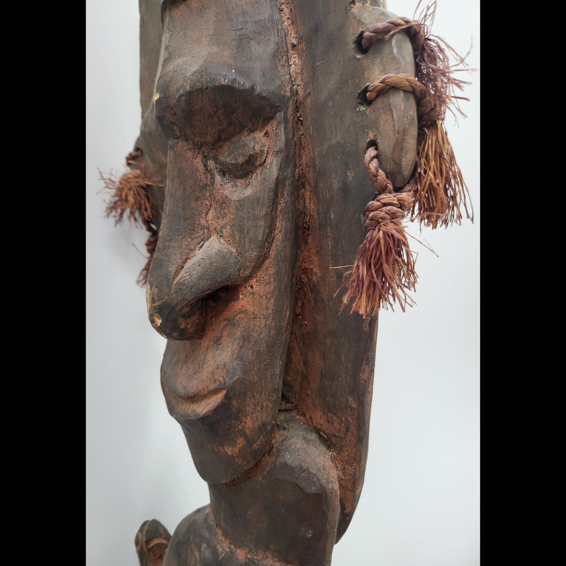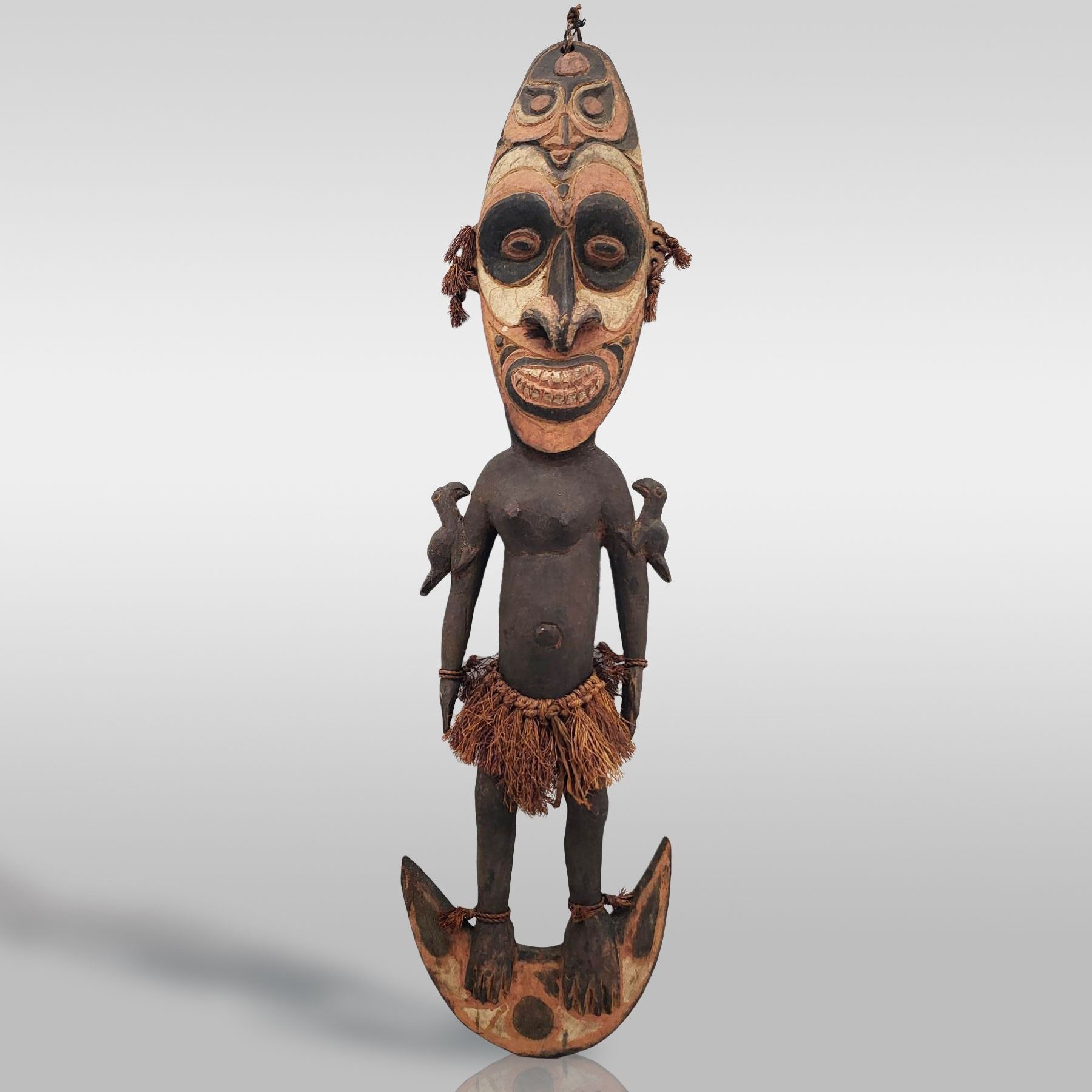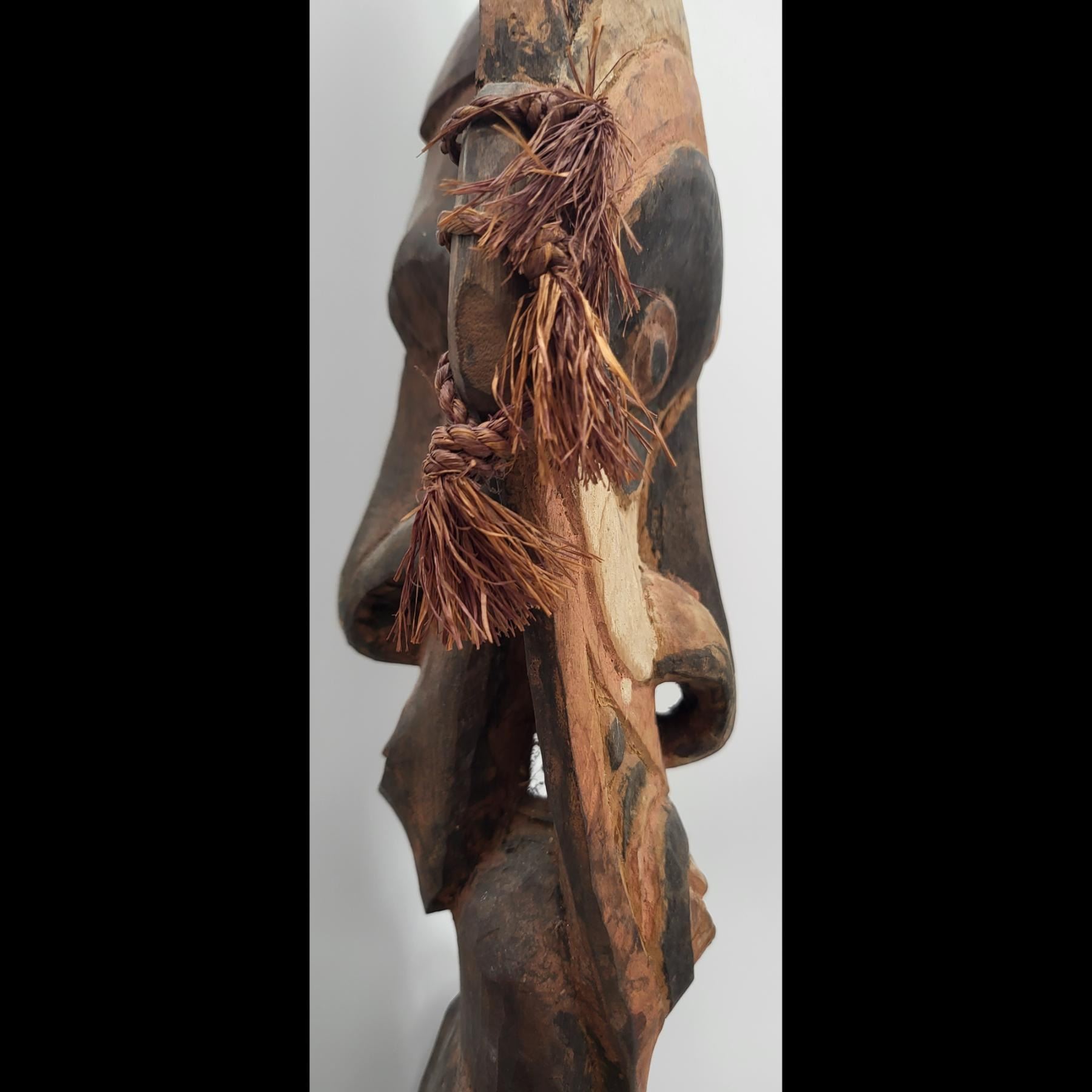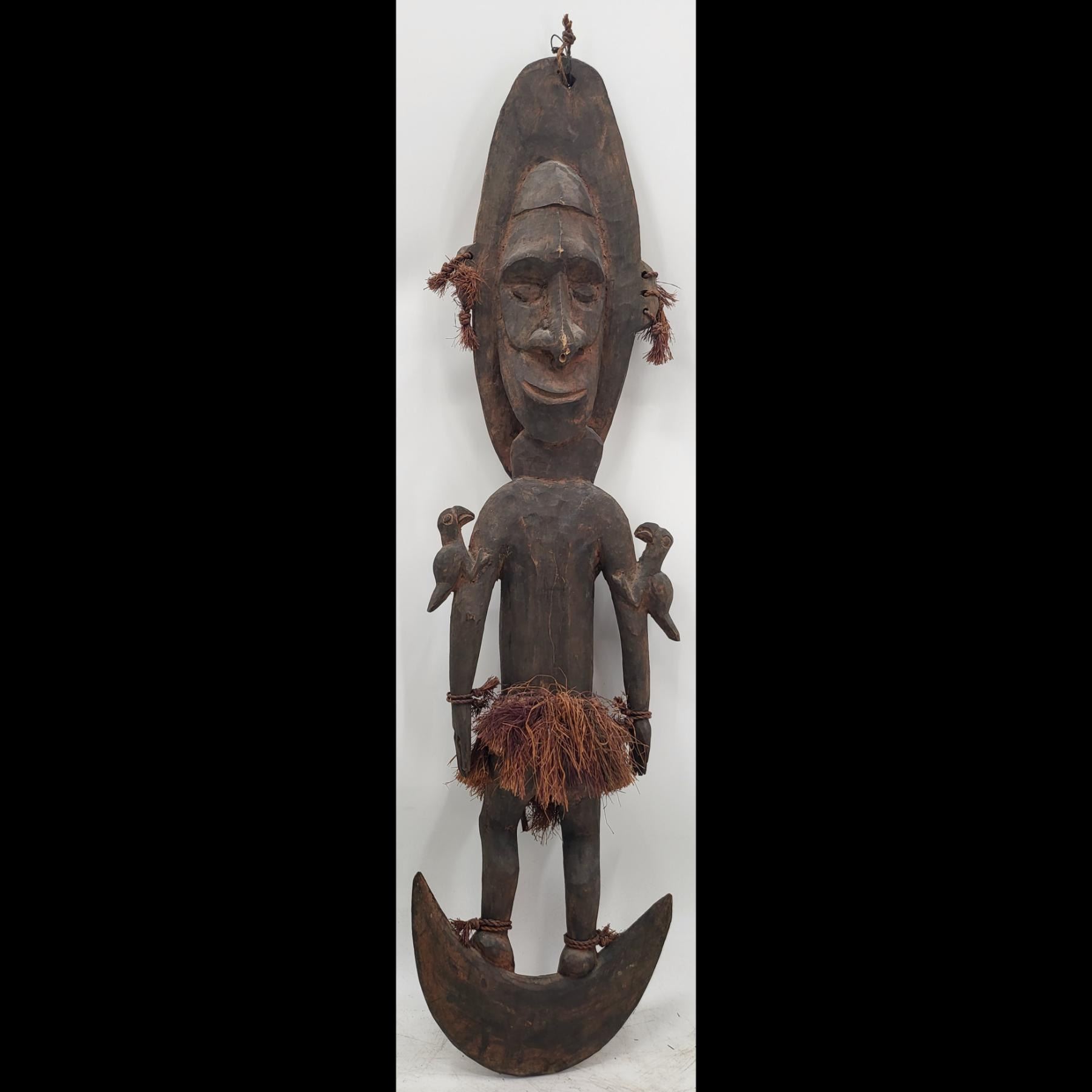 A Large Wood Carved Papua New Guinea Two-Face Spirit Sepik Figure. One face on each side of the head. Figure has a bird of paradise on each side of arm. Measures approximately 37" x 10"