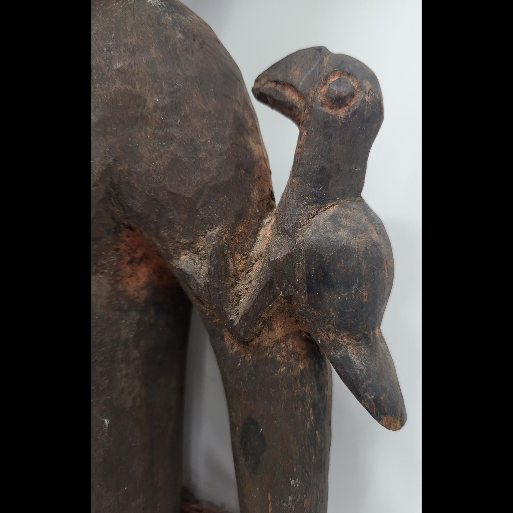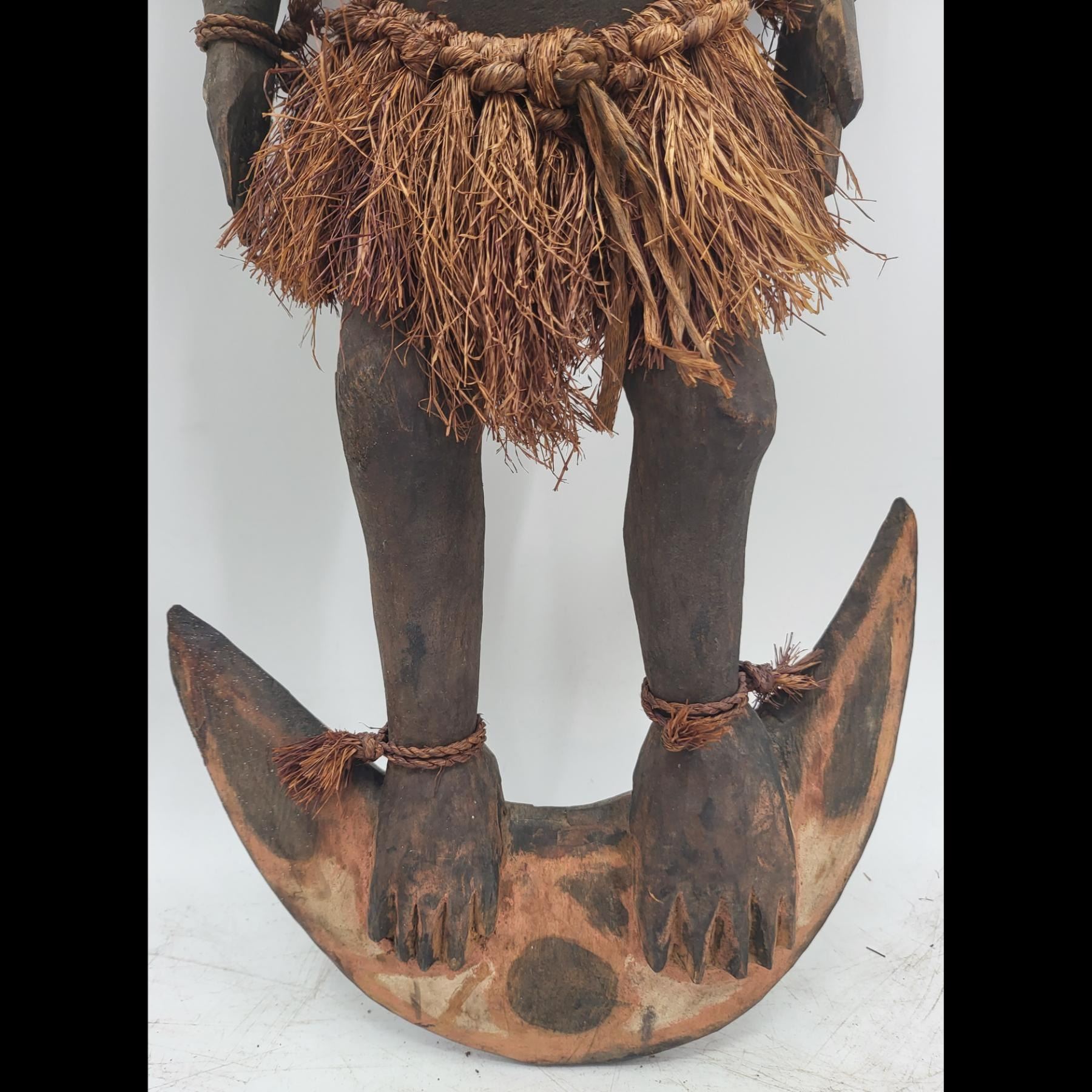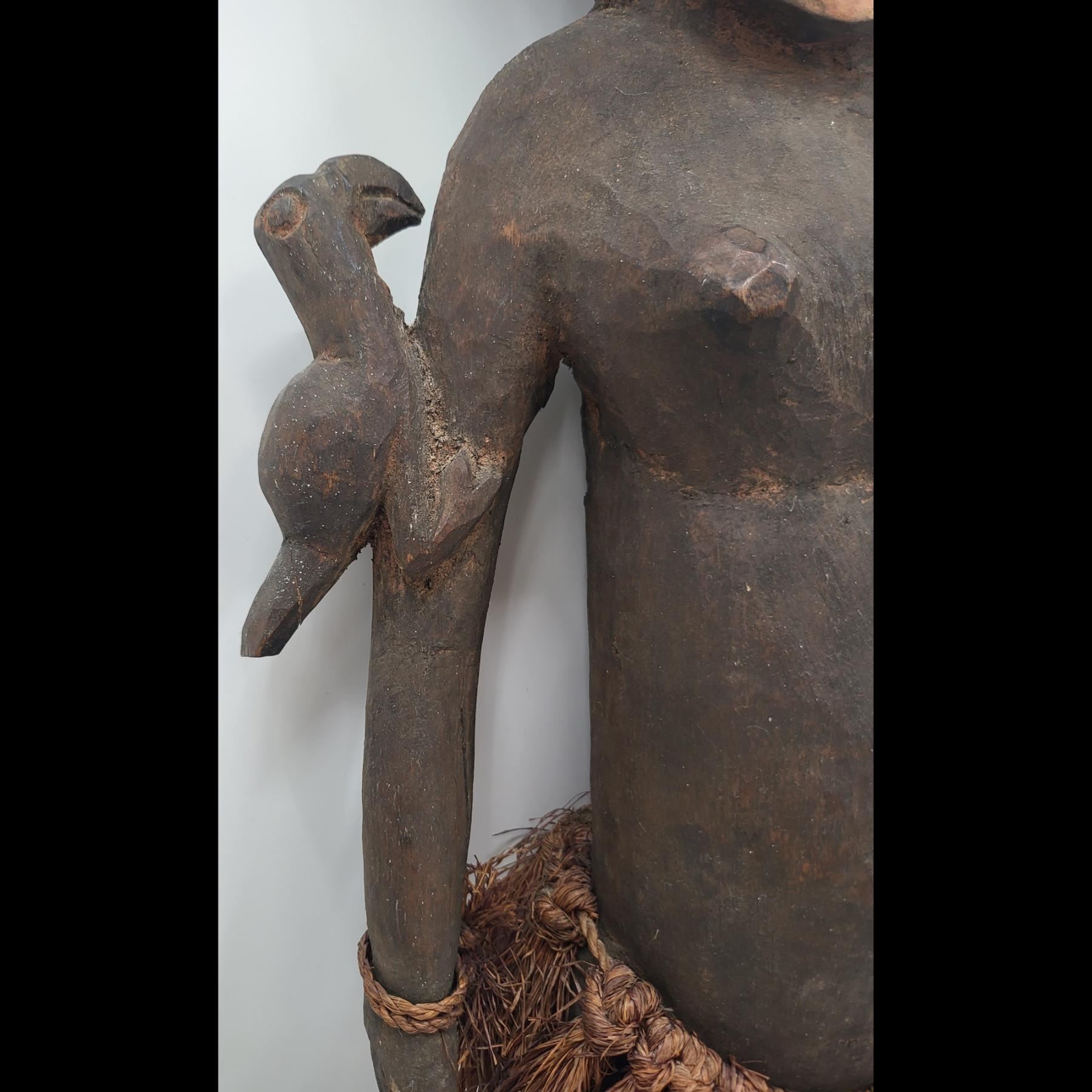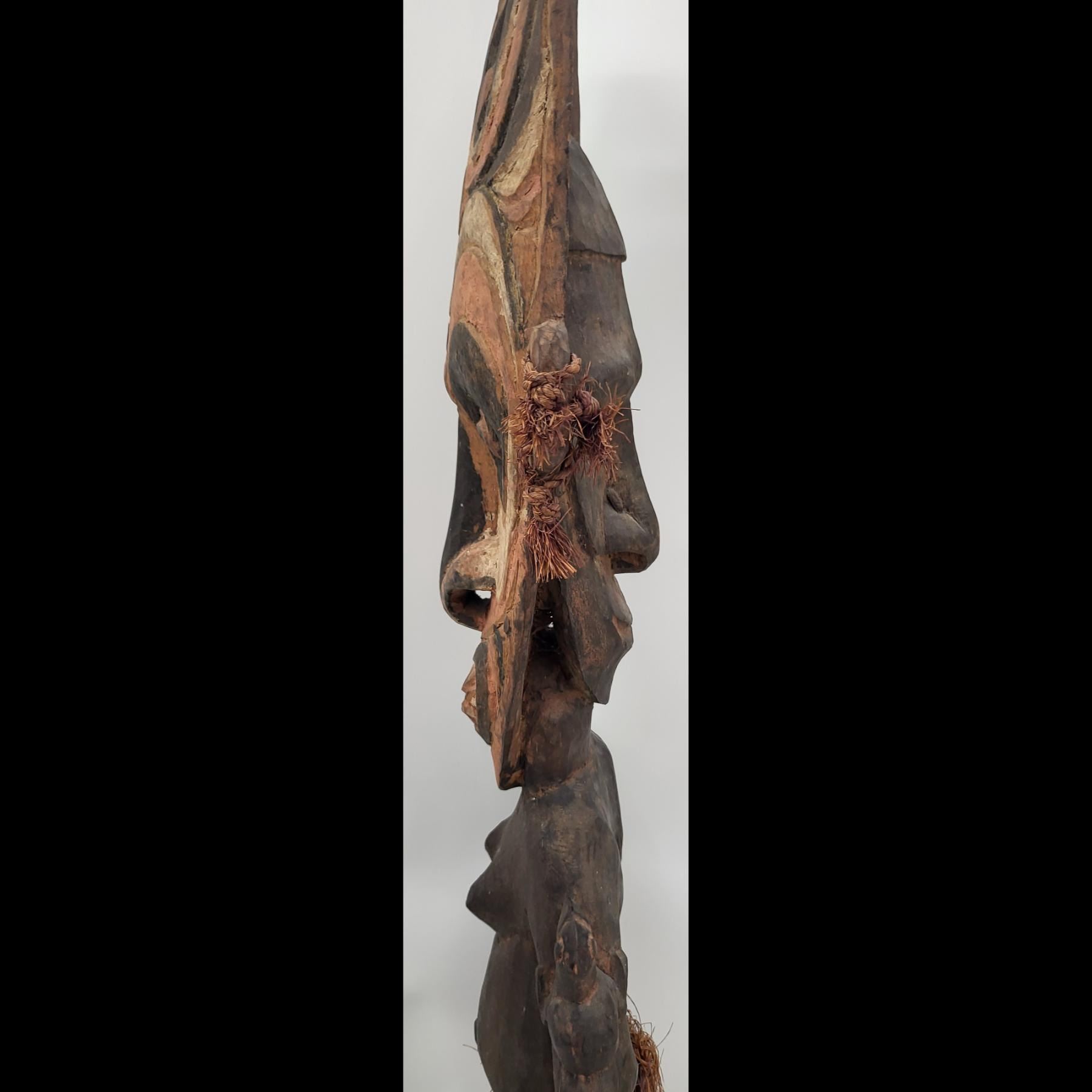 A Large Wood Carved Papua New Guinea Two-Face Spirit Sepik Figure. One face on each side of the head. Figure has a bird of paradise on each side of arm. Measures approximately 37" x 10"