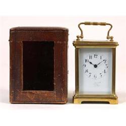 A Late 19th Century Carriage Clock, the enamel dial with Arabic numerals in a brass four pillar case, and morocco leather carrying case (2) See illustration £150-200