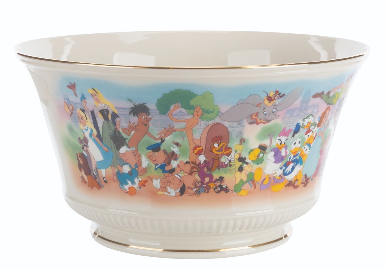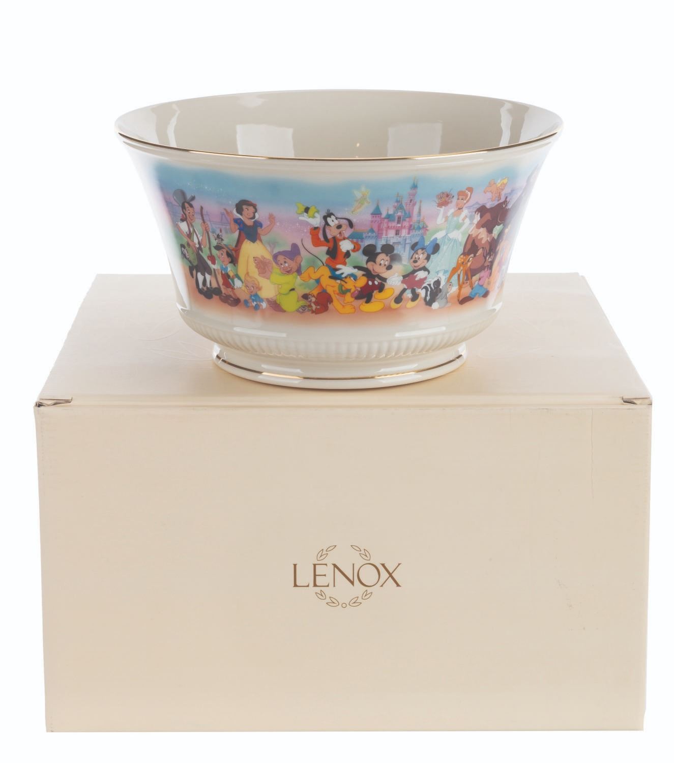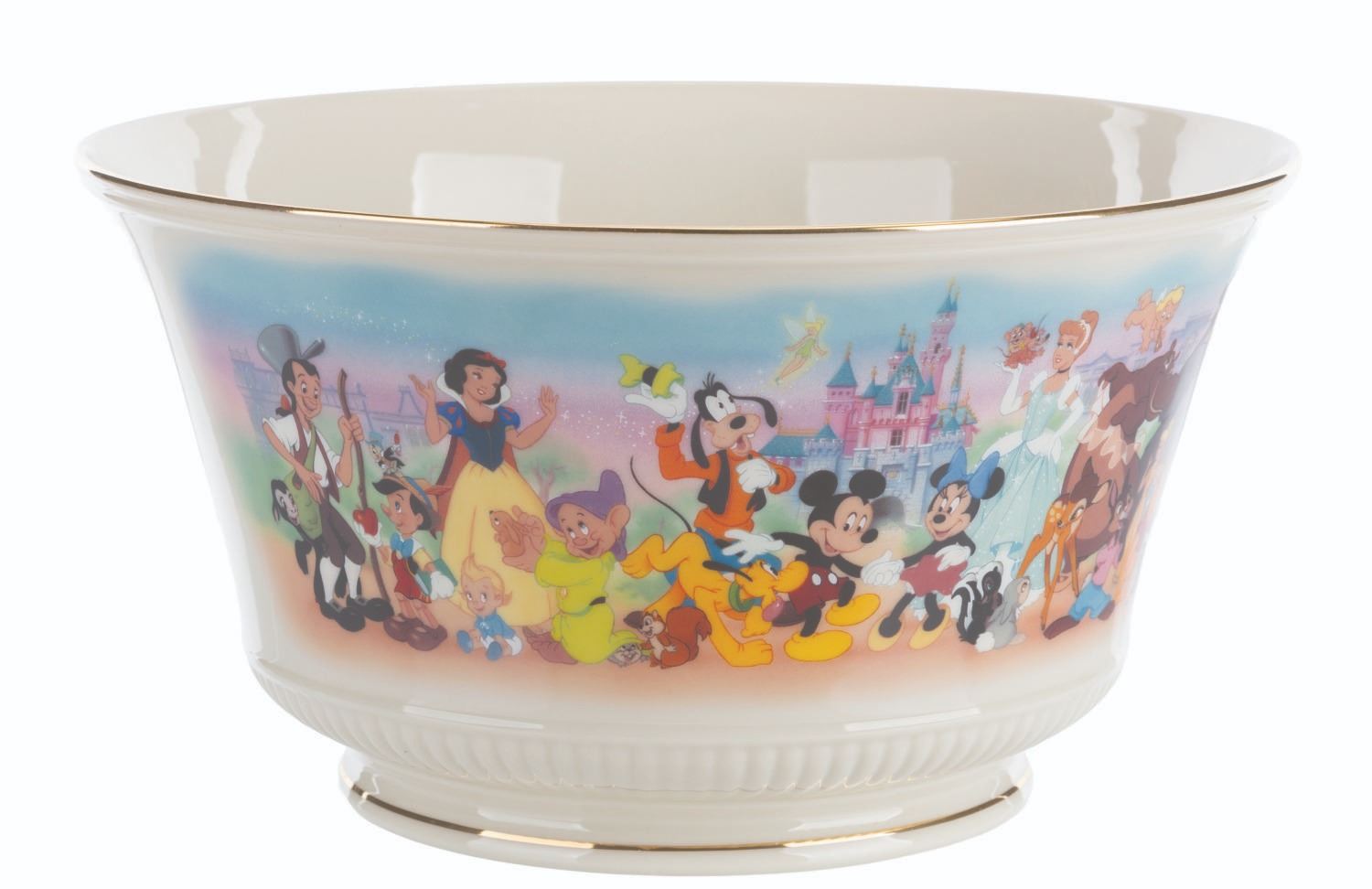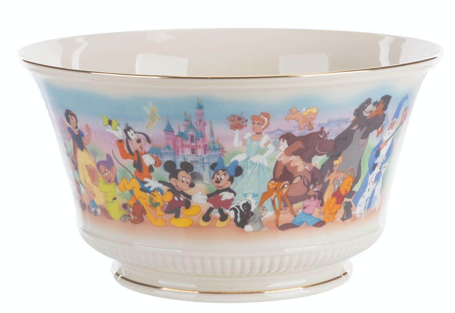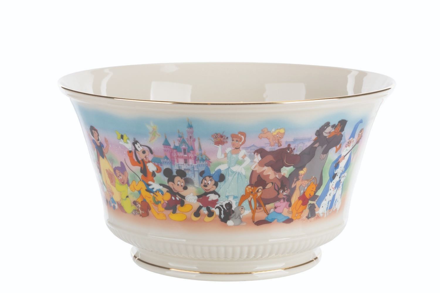 (Disneyland, 2001) A limited edition China bowl titled “Family Reunion,” featuring characters from Disney animated classics at Disneyland on the sides. The piece was released at the 2001 Disneyana Convention, numbered 041 in an edition of 250. Measuring 4.5” tall and 8.5” in diameter with its 11” x 11.25” x 6.5” tall original box, the bowl is in very good condition with minor scuffs, while the box exhibits light wear.