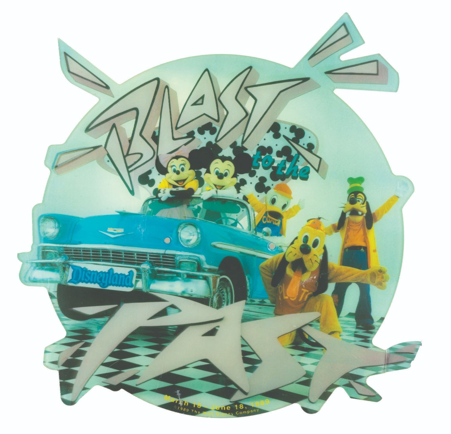 (Disneyland, 1989) A lenticular Blast to the Past event sign featuring Mickey and friends in their 1956 Chevy Bel Air convertible. The sign is from the final Blast to the Past celebration, which lasted from March 18 to June 18, 1989. Measuring 19” x 19”, the sign is in good, Park-used condition with light soiling, smudges, scratches, cracked lenticular plastic, and plastic loss, and discoloration.