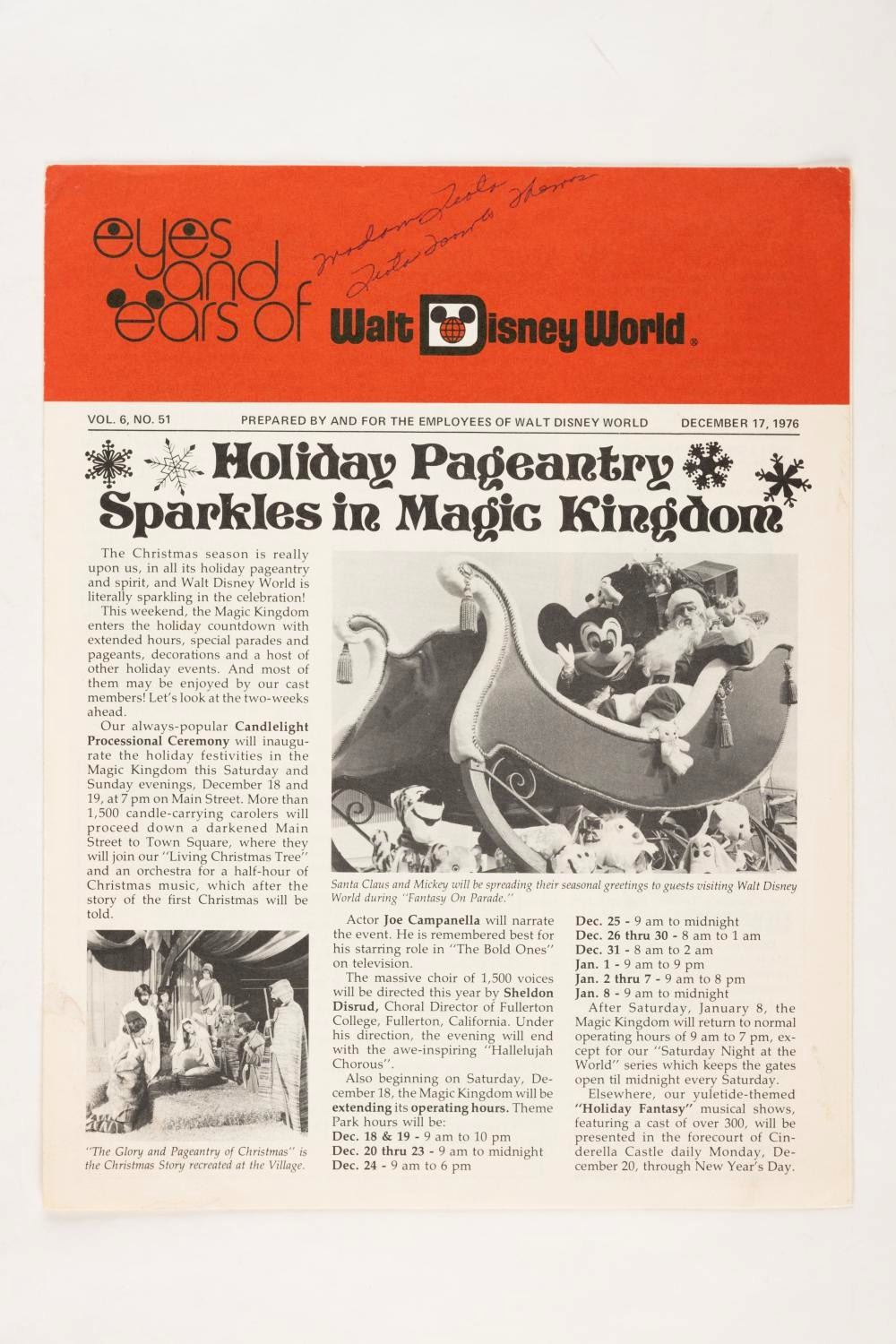 (Walt Disney World, 1976) Vol. 6 No. 51 of the "Eyes and Ears of Walt Disney World" employee newsletter signed by Disney Legend Leota Toombs Thomas. The 6-page newsletter features a cover story on the Park's Seasonal Candlelight Processional Ceremony. Measuring 8.5" x 11", this piece is in good to very good condition with light edge wear from age, light stains, and light creasing in the corners and folds.