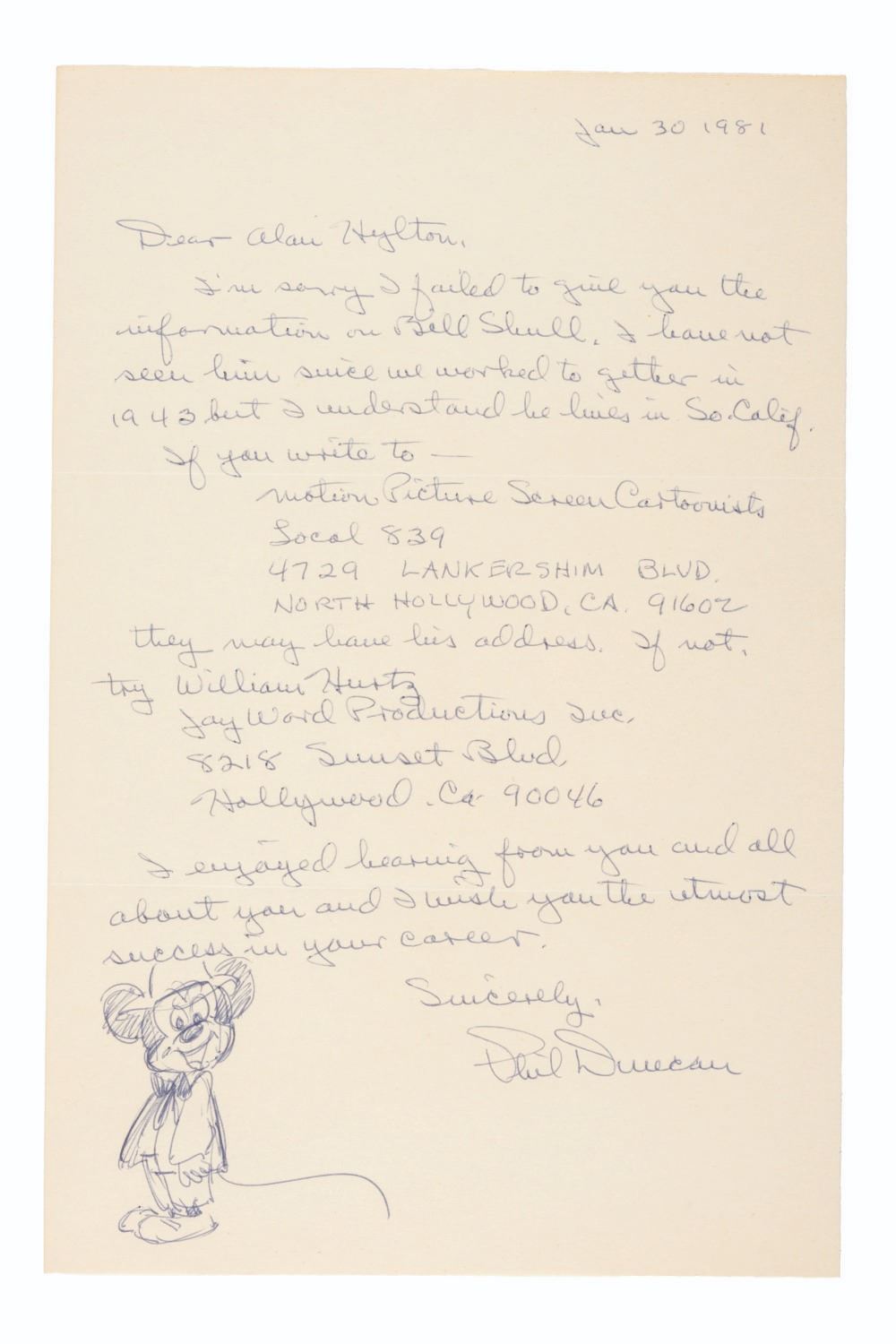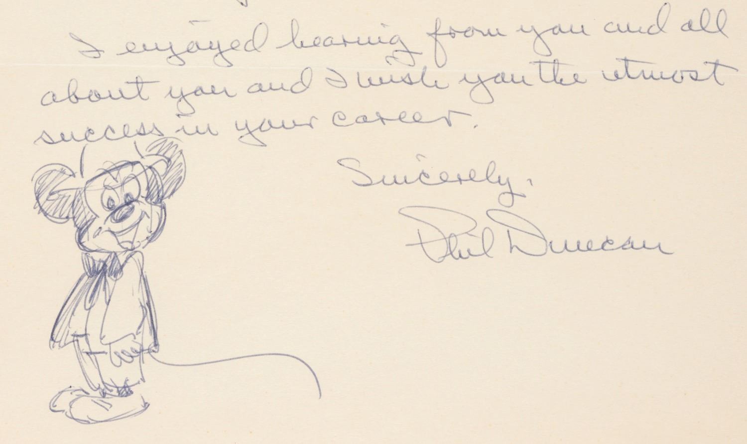 (Duncan, 1981) A letter with a Mickey Mouse drawing by animator Phil Duncan. Duncan was an animator on many Disney films including "Pinocchio" and "The Little Whirlwind." With the sketch measuring 2.5" x 1.5" on the 7" x 10.5" letter, the piece is in very good condition with paper slightly off-white from age.