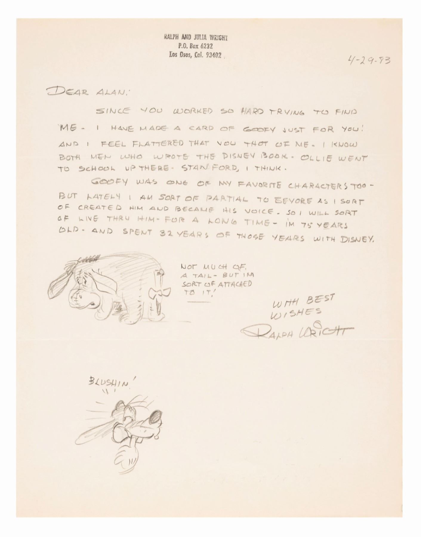 (Wright, 1983) A letter from Disney animator Ralph Wright to a fan with hand-drawn sketches of Eeyore and Goofy. Measuring 8.5” x 11”, the graphite letter is in very good condition with minor edge wear and crease lines from mailing.