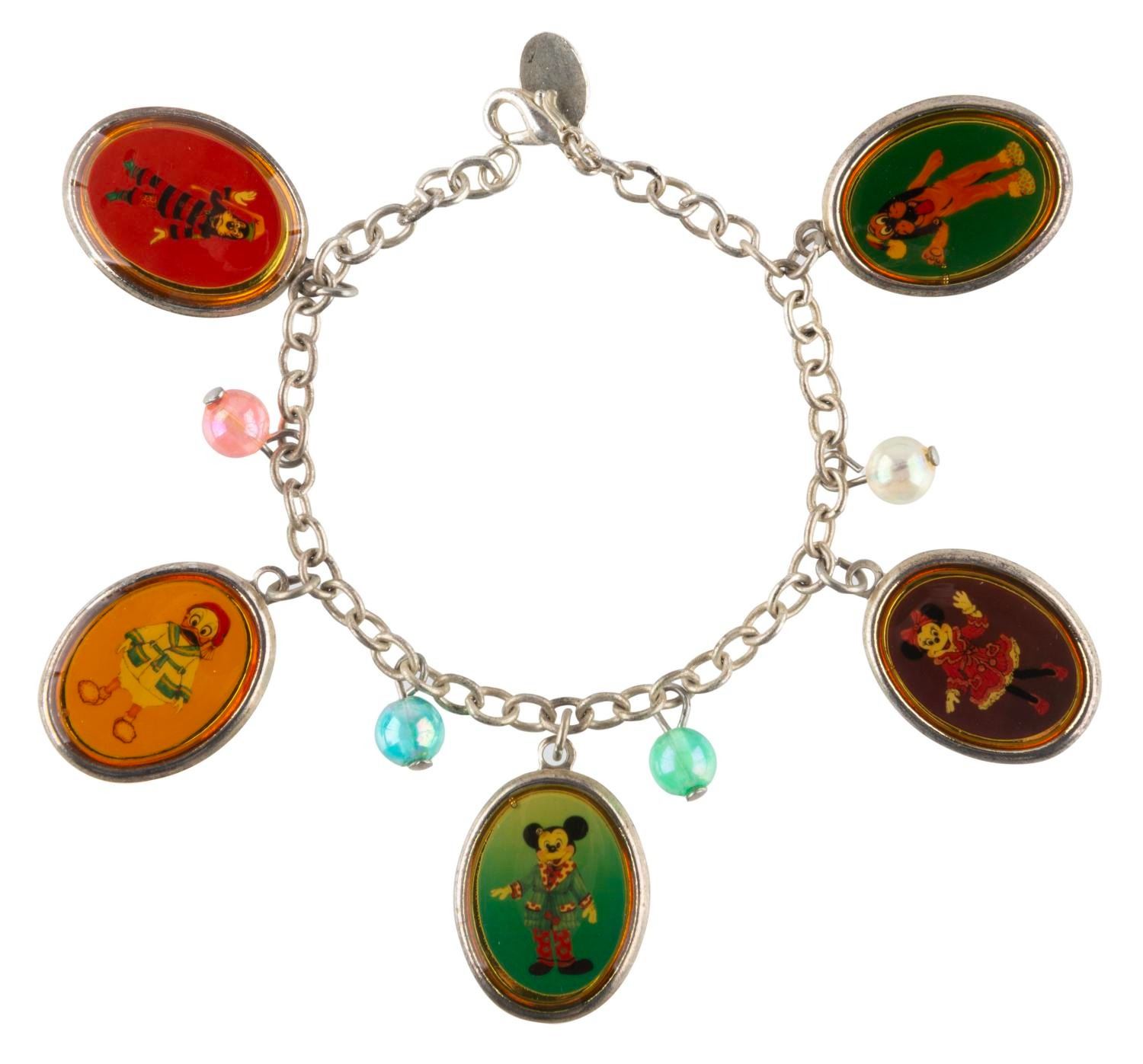 (Disneyland, 1997) A souvenir charm bracelet from the short-lived Light Magic Street Show that ran on Main Street U.S.A. from May to September of 1997. The charms show Mickey and friends in their pajama costumes from the show. Measuring 6.25" long, the bracelet is in very good condition with light handling wear and typical slight color shift from age.