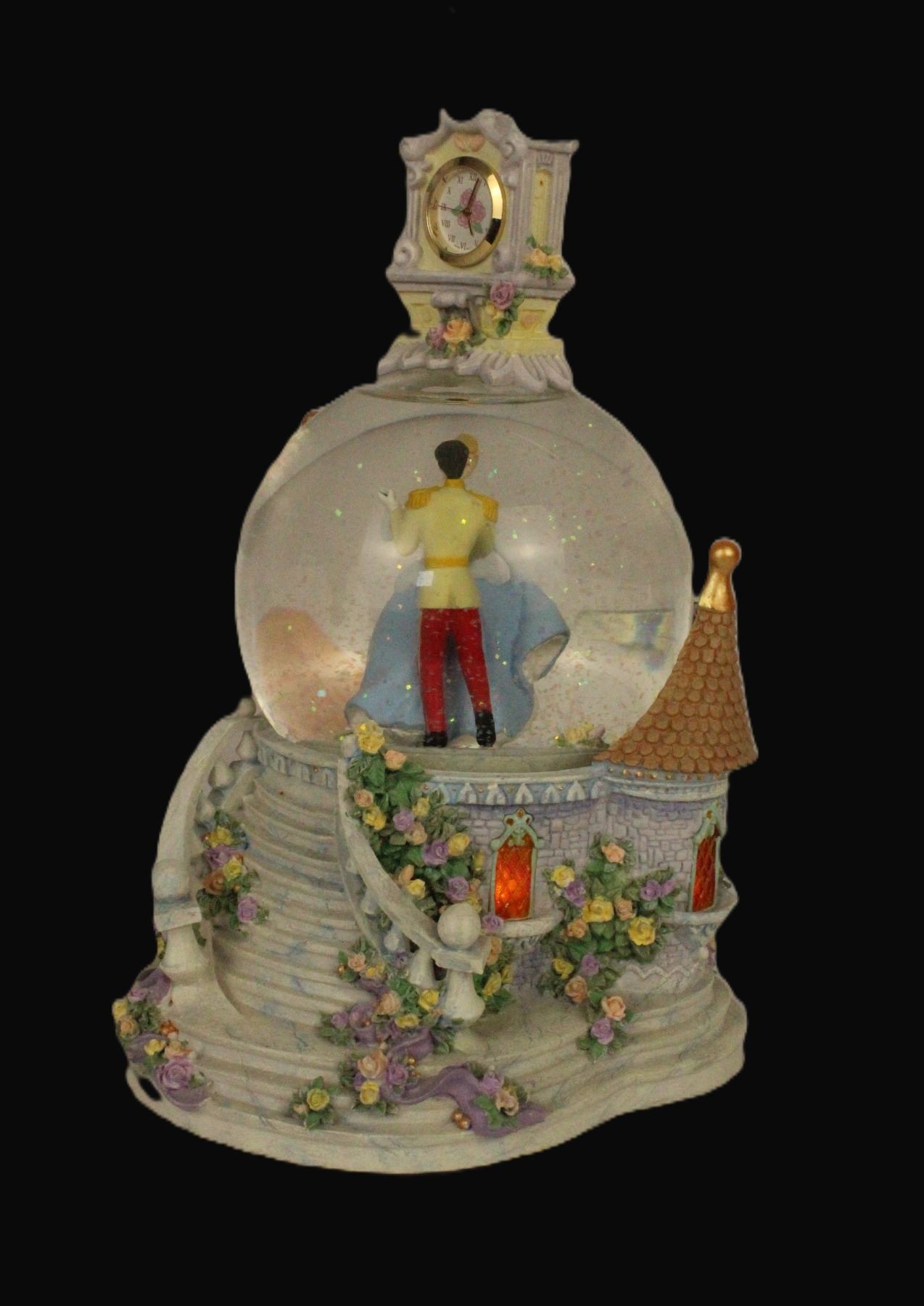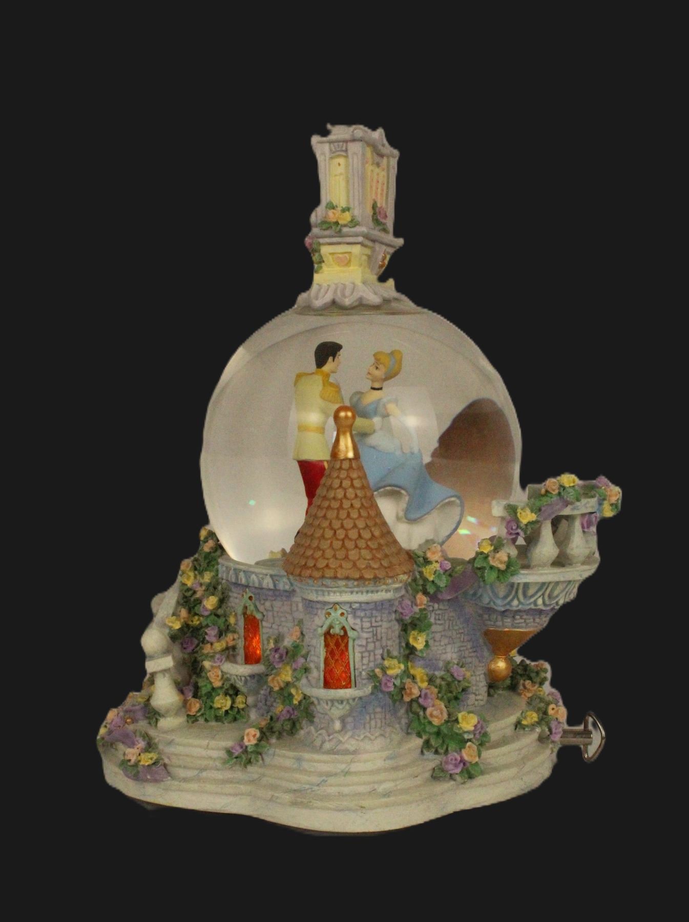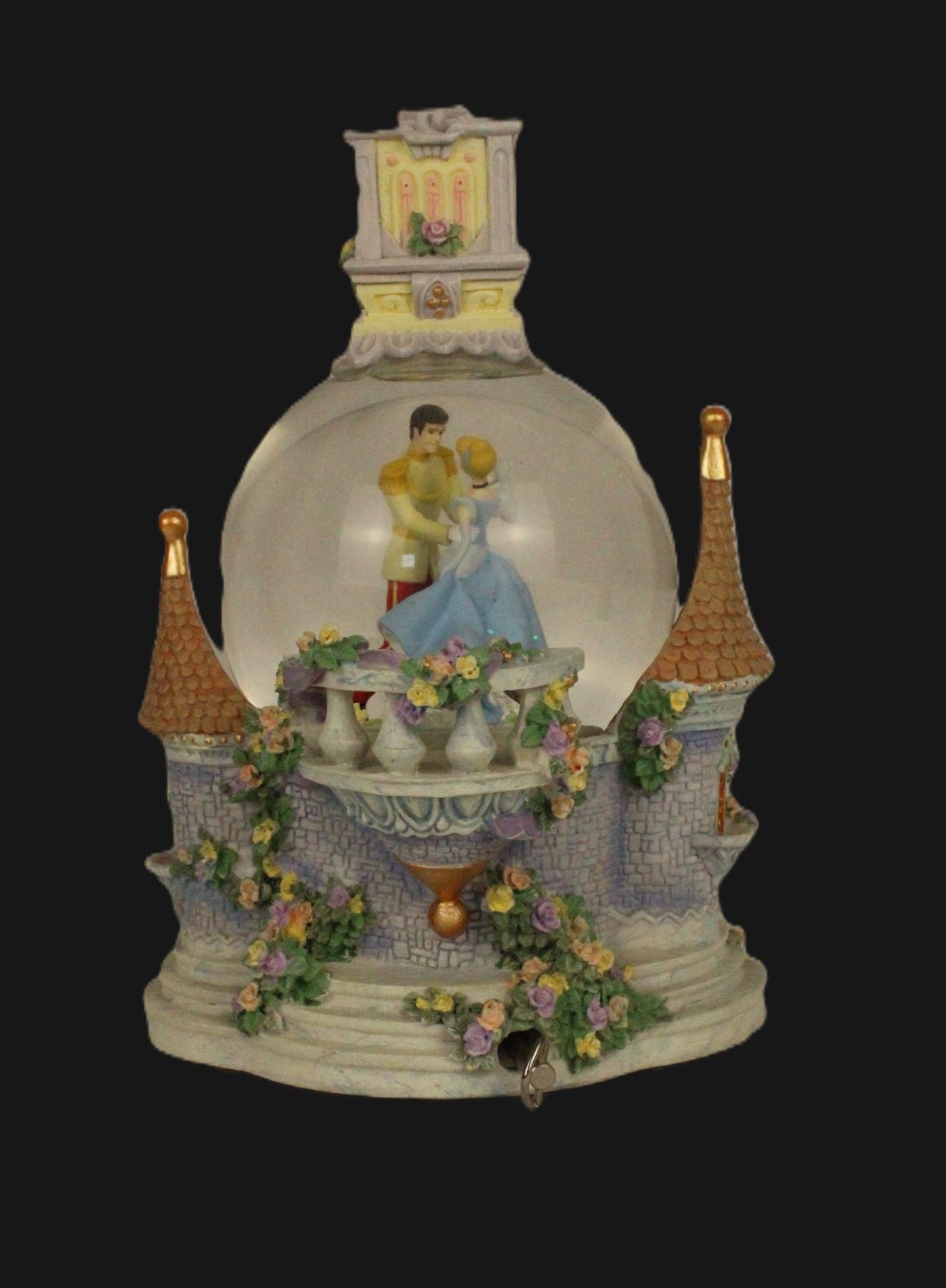 (Disney Store) This beautiful Snow Globe features Cinderella and Prince Charming dancing. The base is a beautifully crafted castle and stairway scene and the windows light up. The figures in the snow globe spin when the music box is would up. The music box plays “So This Is Love”. All features are tested and working. It is in mint condition. It measures 7” in diameter and 9.25” tall.