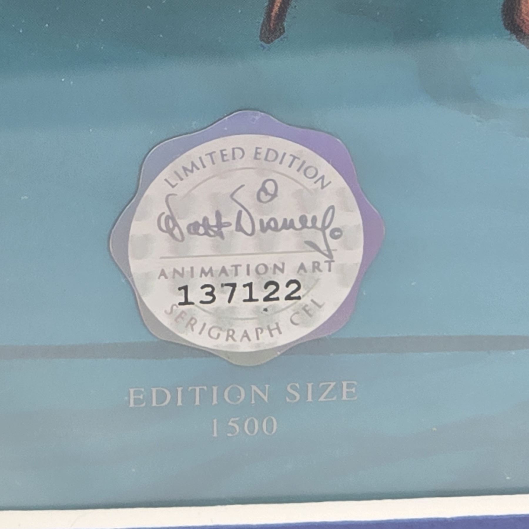 (Walt Disney Art Classics, 2000) This is a pristine large sericel celebrating the 50th anniversary of the Walt Disney animated feature film Cinderella. This edition, “Cinderella's Golden Anniversary”, combines  a number of classic moments from the 1950 masterpiece into a storytelling collage.  This is a hand-inked, hand-painted animation cel has been exactingly screen-printed one color at a time onto the acetate cel. The general edition has 1,500 pieces. The cel has been signed at the bottom just below the carriage by Ilene Woods, the original voice of Cinderella. This piece has been in its original box and never displayed since its original purchase in 2000. COA included. It is in mint condition and ready to add to your art collection. The frame measures 23.75” x 1” x 29.75”. The total, in-box measurement is 29.25” x 2.5” x 39.25” and weighs 9 lbs 2 oz.