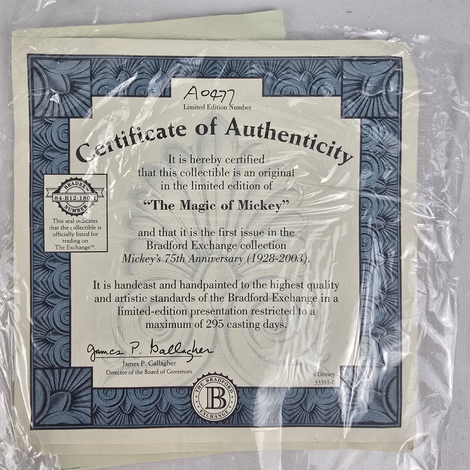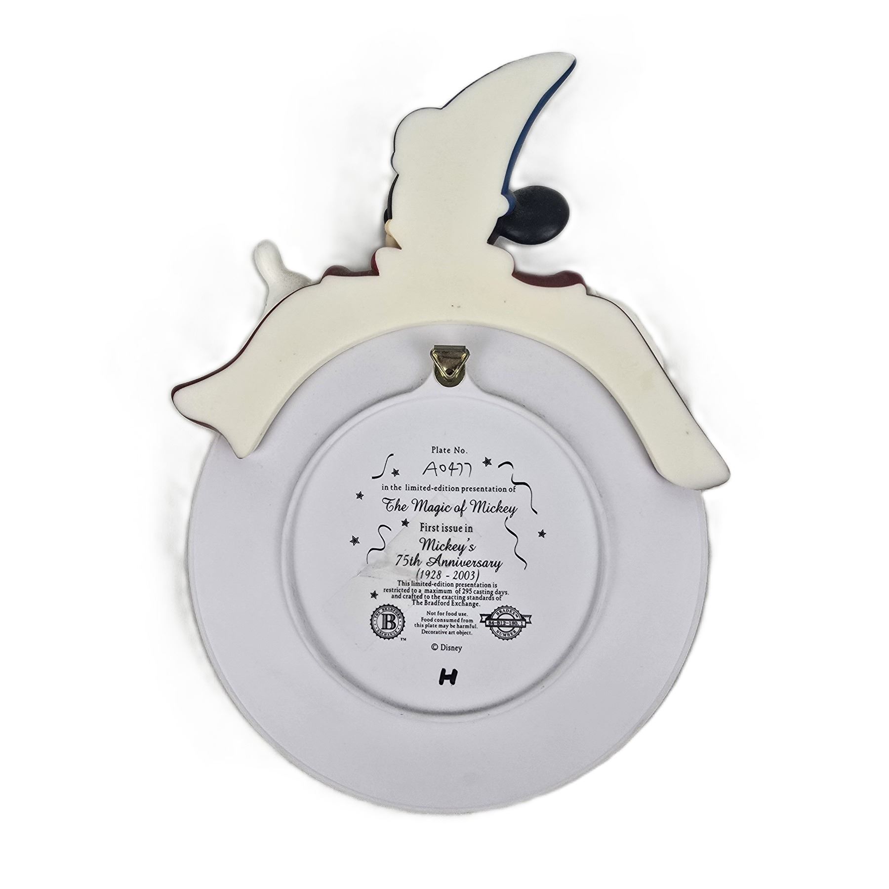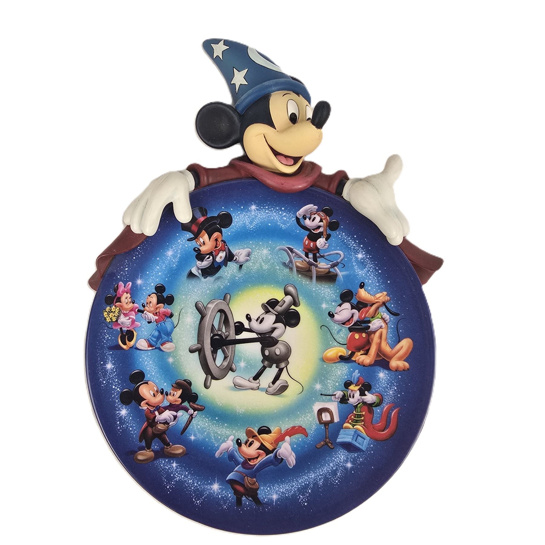 (Bradford Exchange, 2003) This is a collectible plate celebrating 75 years of Mickey Mouse. It is titled “he Magic of Mickey”. The background is blue with a spiral of stars leading to the center. It features 7 color images of Mickey Mouse characters through the years with an 8th classic Mickey Mouse character in black and white at the center. The top of the plate is attached to a 3-D arms and head of Mickey Mouse as the Sorcerer's Apprentice. It is in great condition. The COA is included with a matching Edition Number of A0477. It measures 7” x 0.5” x 10” and weighs 8 oz.