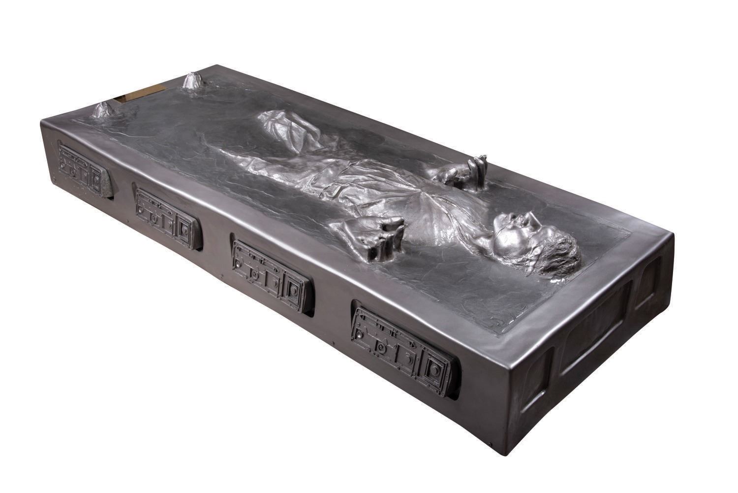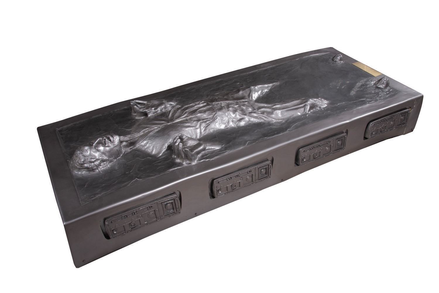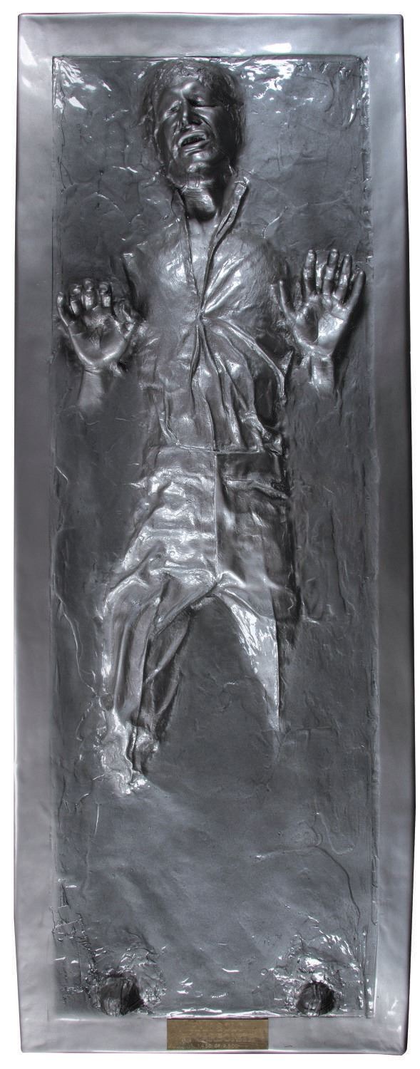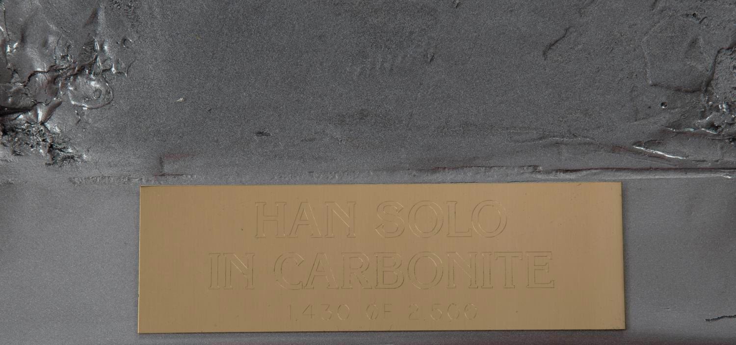 (Lucasfilm/Illusive Originals, 1997) A life-size Limited Edition Han Solo in Carbonite prop replica. The 1:1 reproduction of the prop seen in "The Empire Strikes Back" and "Return of the Jedi" was created using original files from the Lucasfilm Archives and sculpted by renowned artist Mario Chiodo. The wall-mountable decoration perfectly captures the frozen expression of the encased Han Solo and is numbered 1,430 of 2,500. Measuring 80.5" tall, 32.75" wide and 14.5" at its deepest, the piece exhibits slight scuffs, with cracking and wear to the lower left corner.