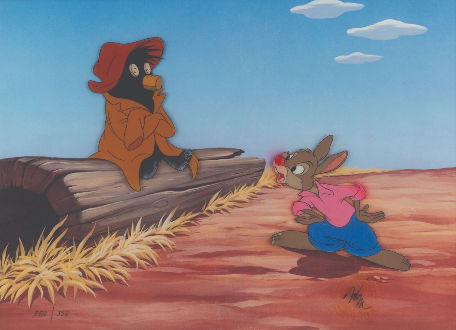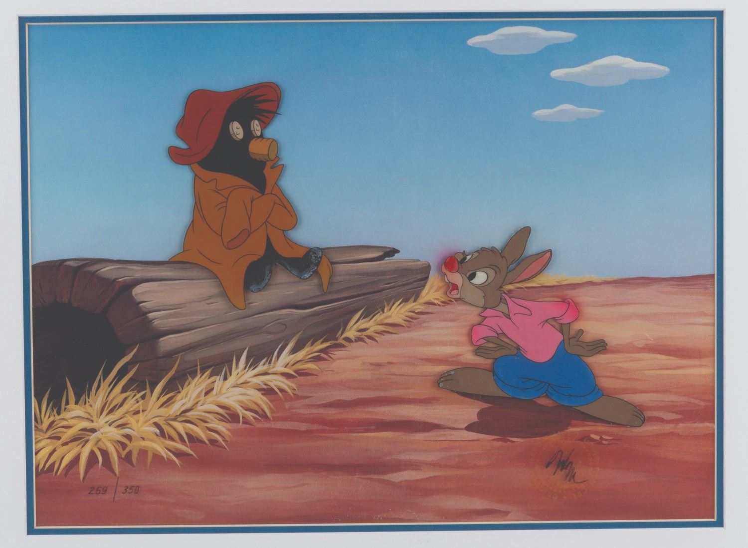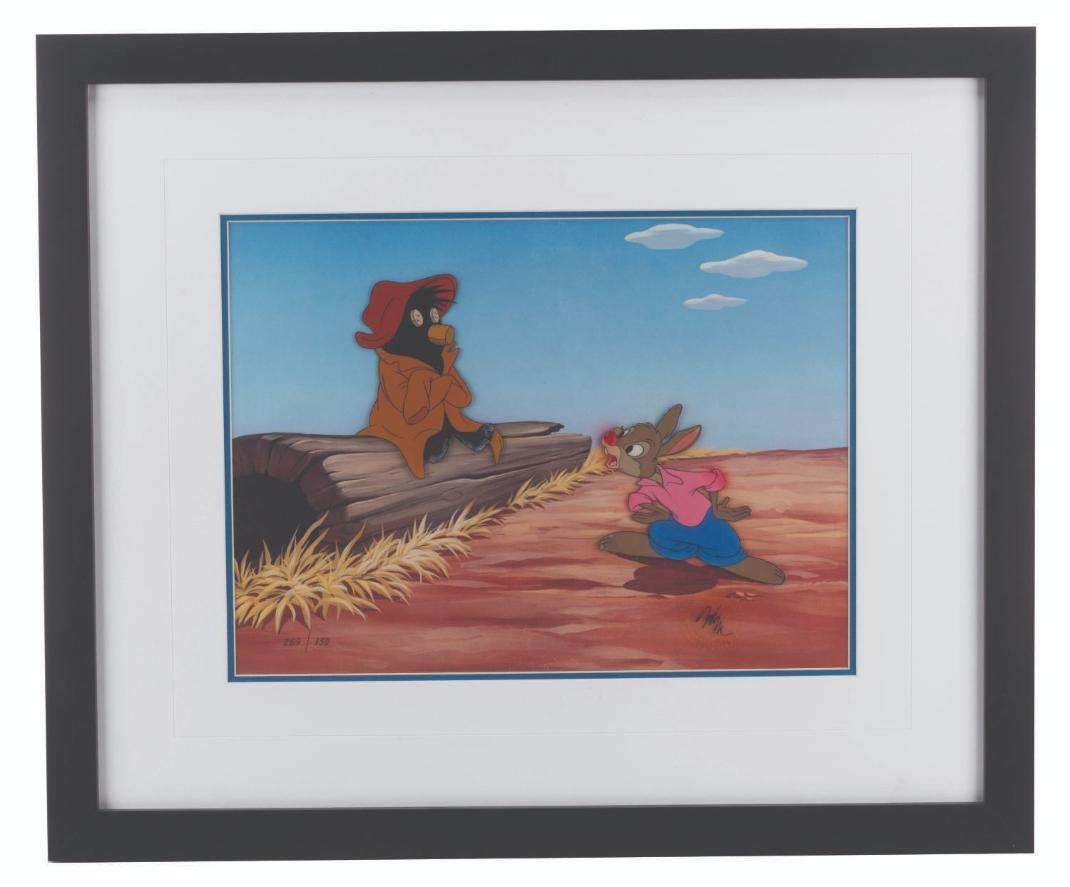 (Disney, 1990s) A framed, hand-painted cel of Br’er Rabbit and the Tar Baby from Disney’s 1946 feature"Song of the South." With a reproduction color background, the piece is numbered 269/350. The character image measures 8" x 10.5" on an 11" x 15" visible cel in an 18.25" x 22.25" frame. The piece displays in good condition with paint lifting throughout Br’er Rabbit, paint lifting and loss to the toes of both characters, and some color bleed from Br'er Rabbit’s nose and shirt to the background.