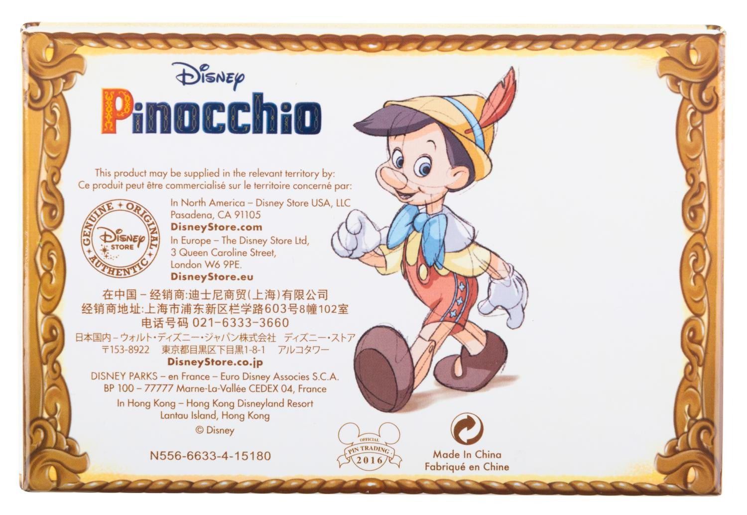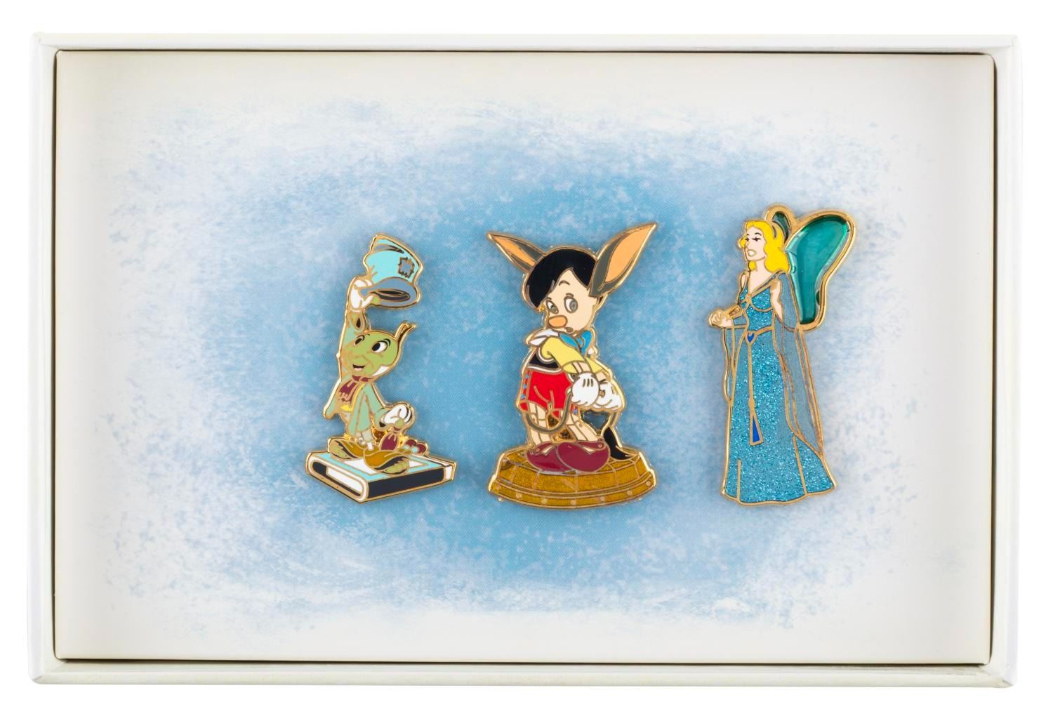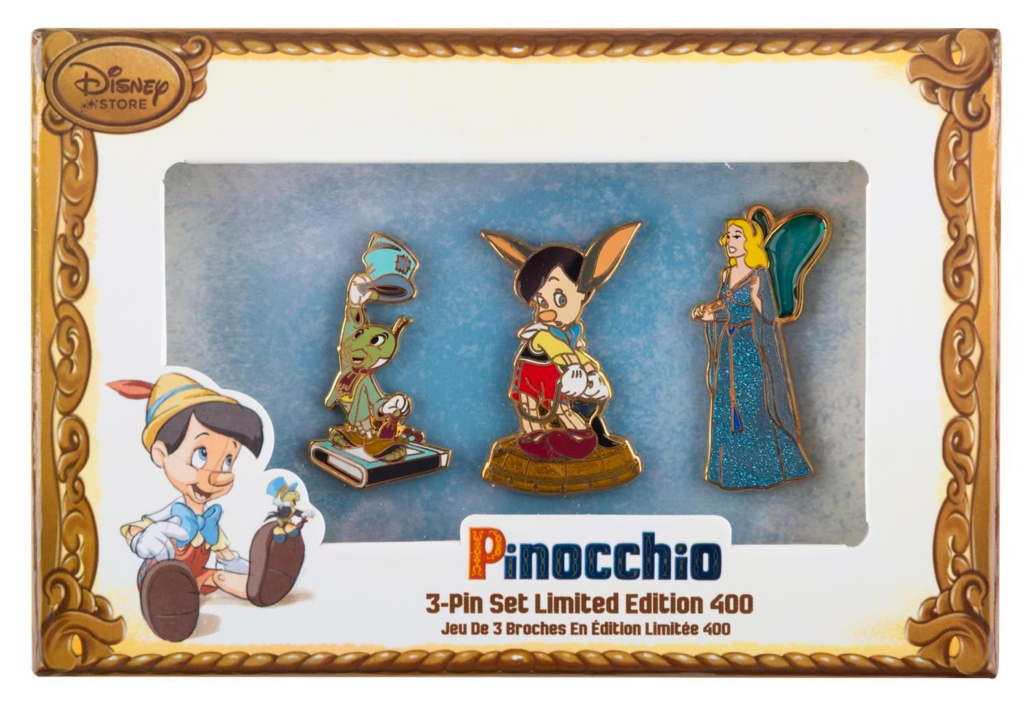 (Disney, 2016) A Disney Store exclusive boxed set of three “Pinocchio pins.” The set was released in 2016 in an edtion of 400 pieces. The pins are in very good unused condition in the original box.