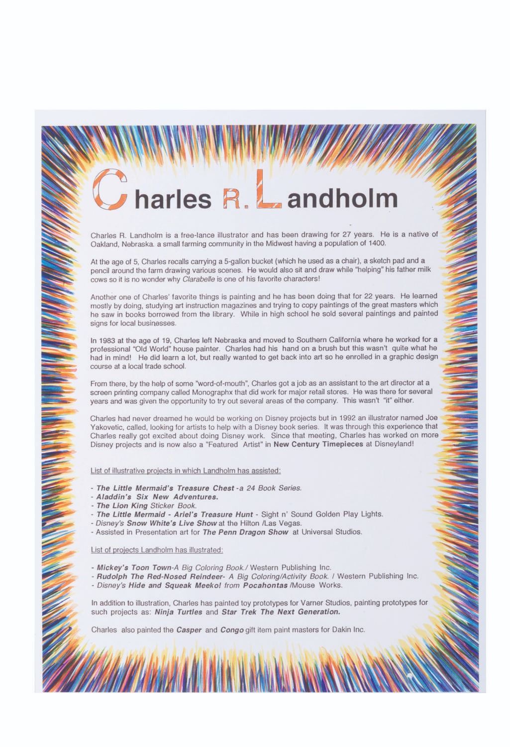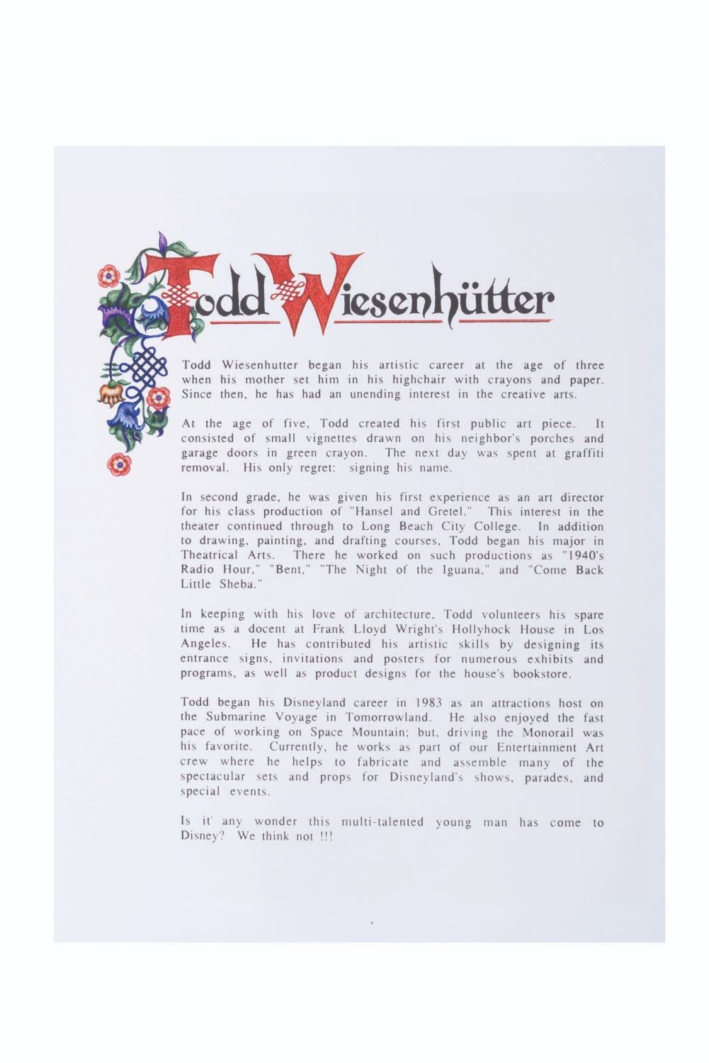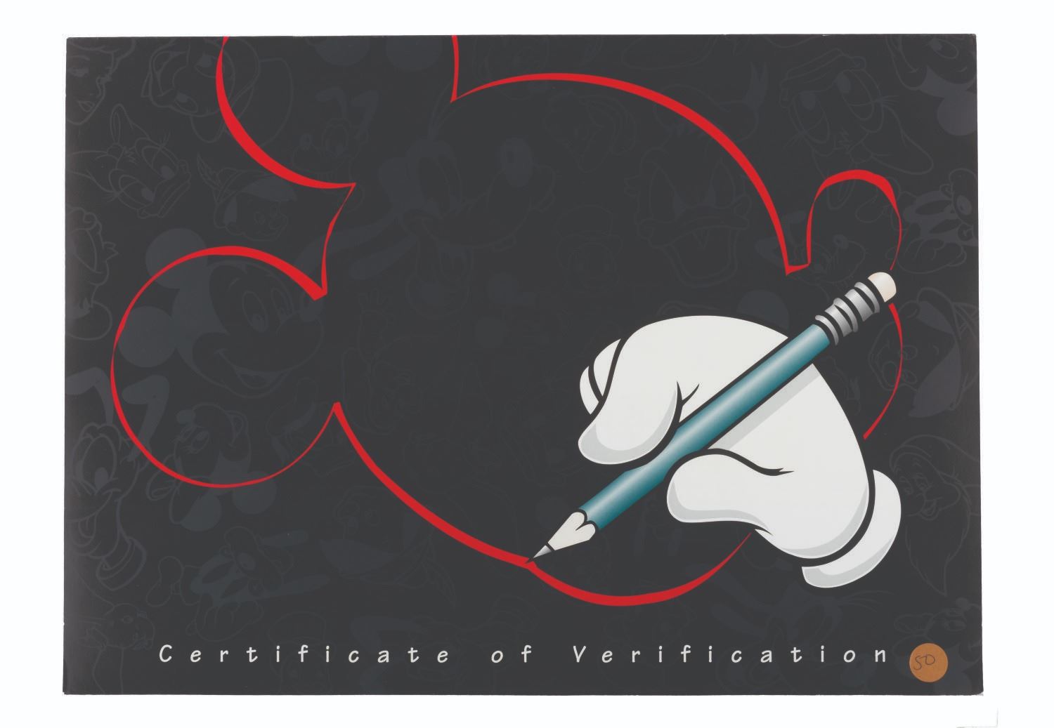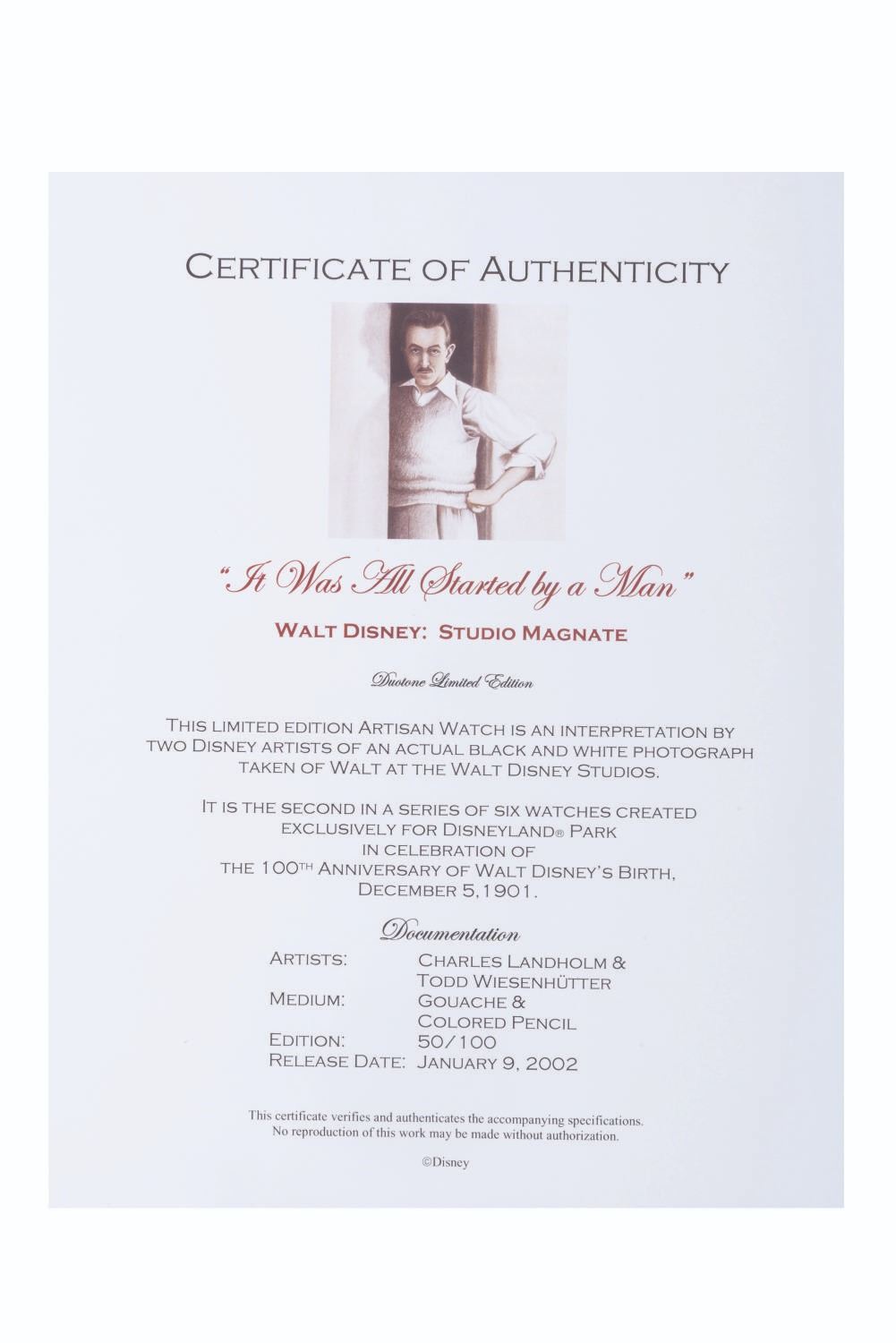 (Disneyland, 2002) A signed print of Walt Disney artwork used for designing a limited edition wristwatch. The print, numbered 50/100, features the classic Walt in the Doorway image as reimagined by artists Todd Wiesenhutter and Charles Landholm. Measuring 8.5" x 11," the print is in fine condition and includes a certificate of authenticity as well as information about the artists.