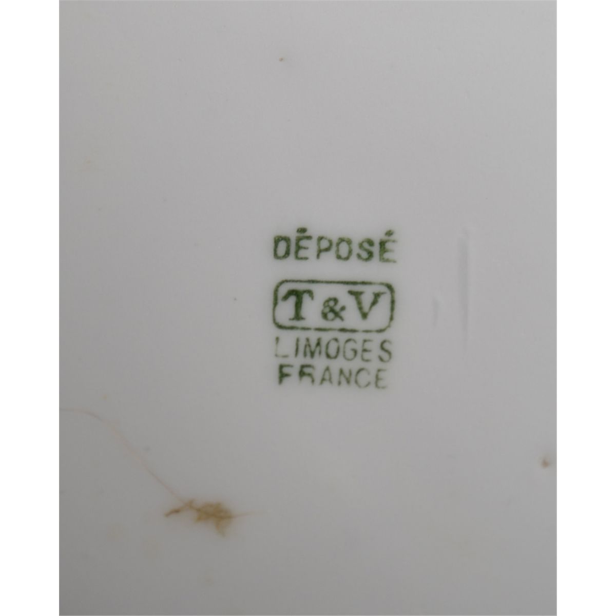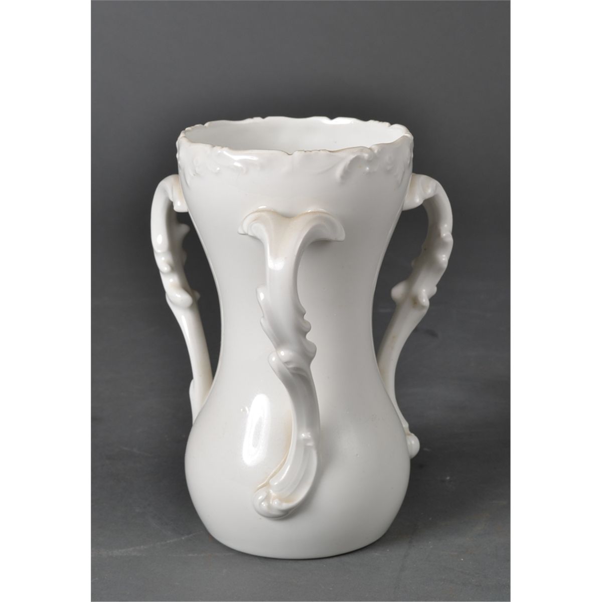 The rim decorated with raised floral and leaf decoration, the handles formed as branches, with Limoges green mark to base. 7.25" H, circa early 20th century. Private collection Ada, MI.