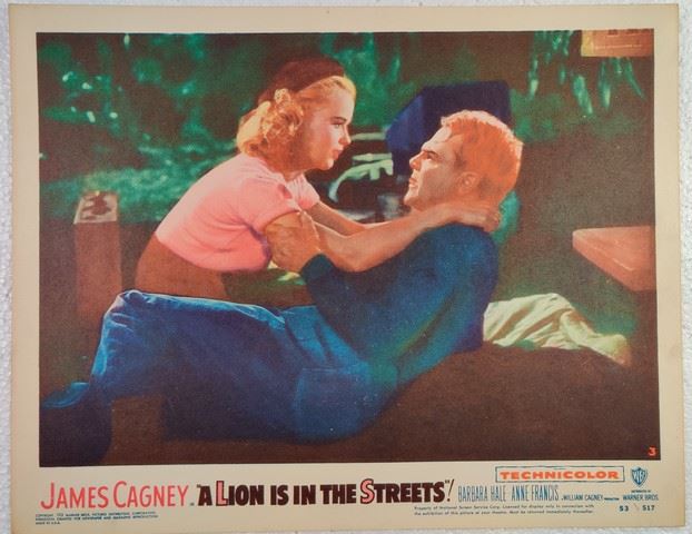 A Lion is in the Streets (Warner Bros., 1953) lobby card. Drama. Starring James Cagney, Barbara Hale, Anne Francis, Warner Anderson, Onslow Stevens, Lon Chaney Jr., Larry Keating, James Millican, Ellen Corby, John McIntire. Directed by Raoul Walsh. Very light edge wear, very light creases. Near Mint. (11"x14").