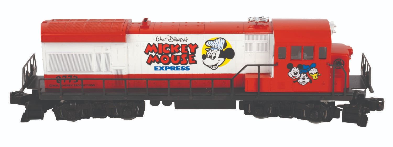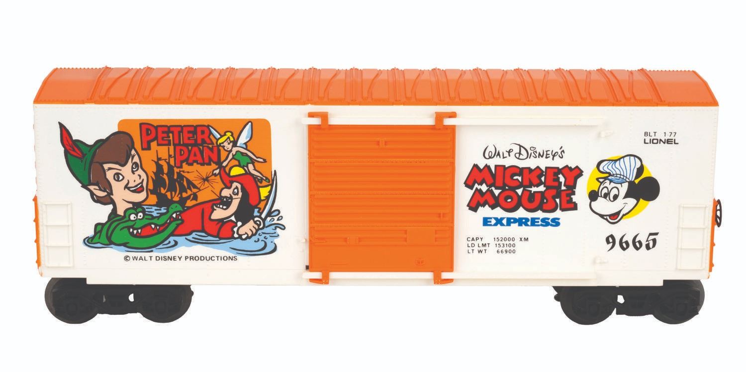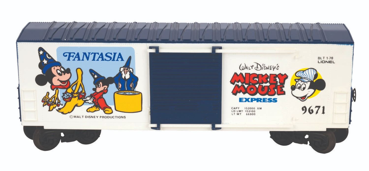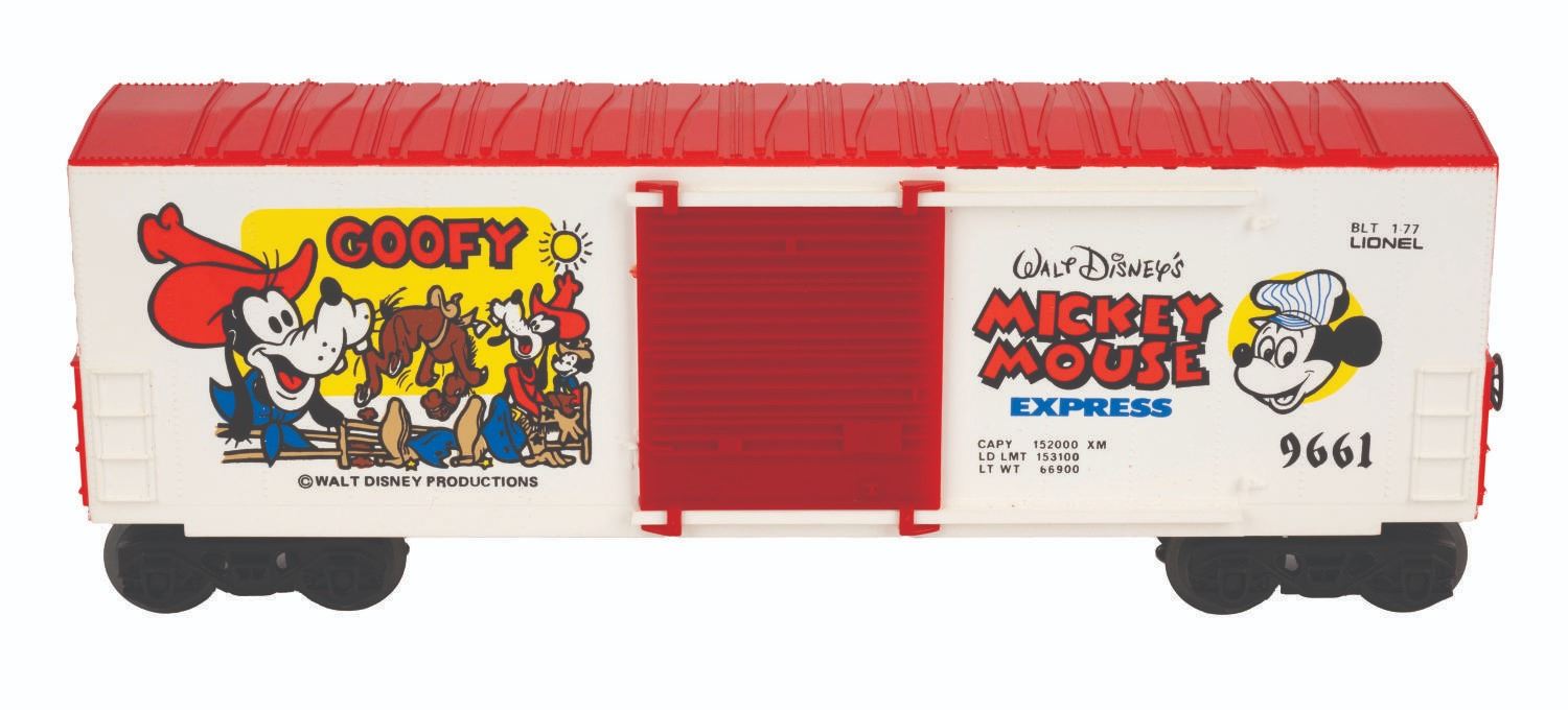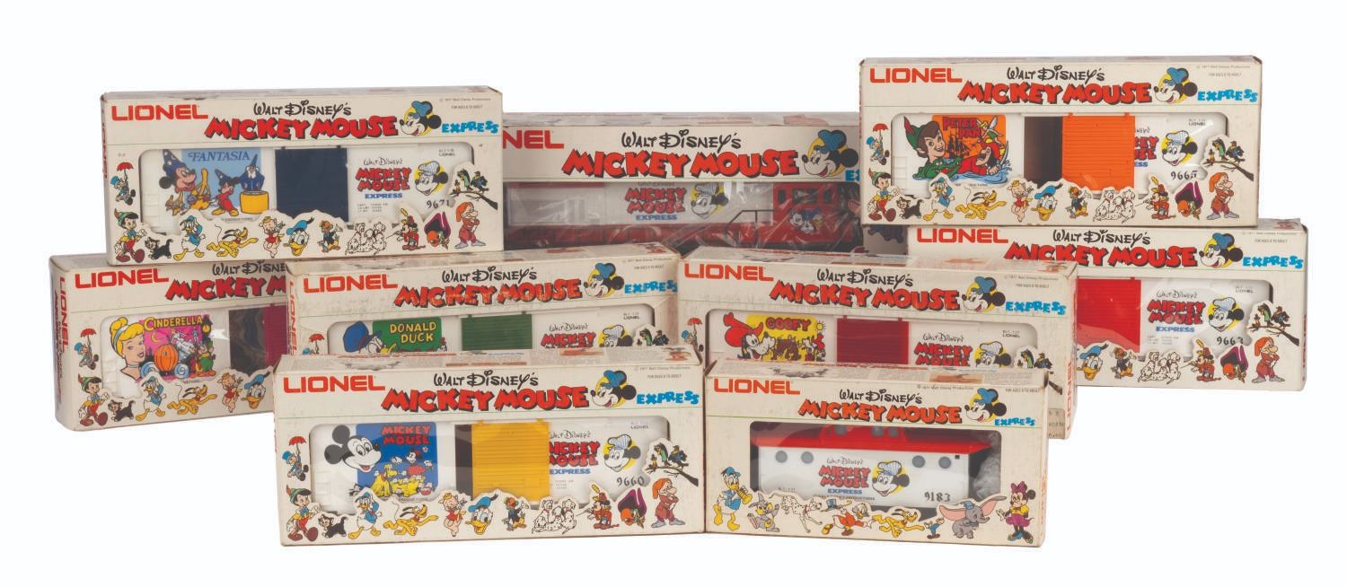 (Lionel, 1976-77) A Mickey Mouse Express model train collection with a diesel engine, seven boxcars, and a caboose. Each car celebrates a different Walt Disney Film or character and comes within its original box. The train cars and engine are in fine as-new condition. The boxes measuring from 15.5"x6"x3.25" to 9.75"x6"x3.25" are in good to very good condition with light creases, scuffs, and wear to some, and the “Donald Duck” car box is in fair condition with heavy scuffs.