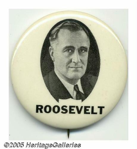 <B>A Literally Unique Franklin Roosevelt Button</B></I> This bold, distinctive item is the plate example from Hake's original 1896-1972 book. We have never seen another example. Note that this is the companion piece to the equally rare Willkie version offered elsewhere in this sale. Choice condition, and especially appealing appearance despite its simple black and white format. Size 2 1/8". Lot:263